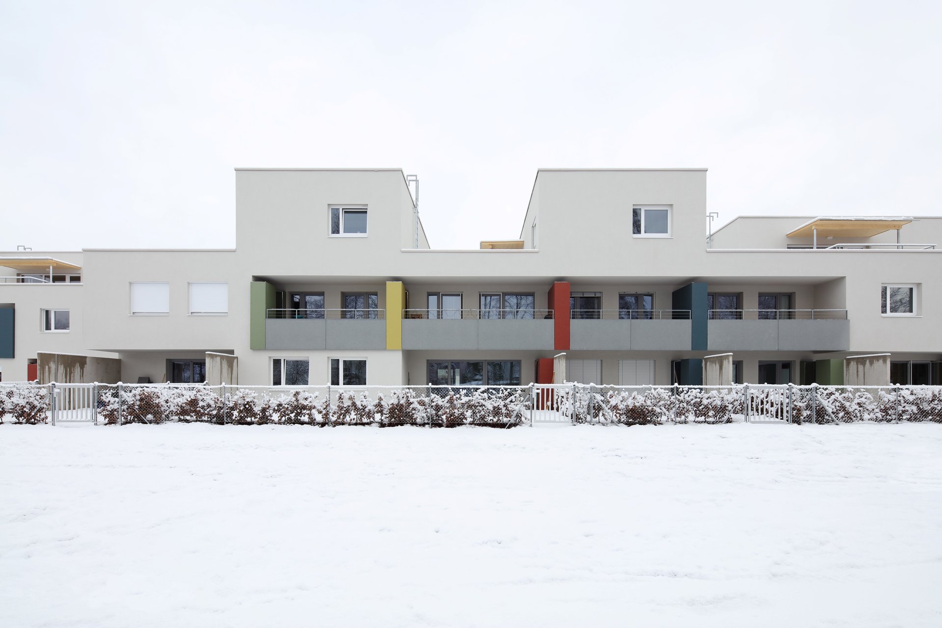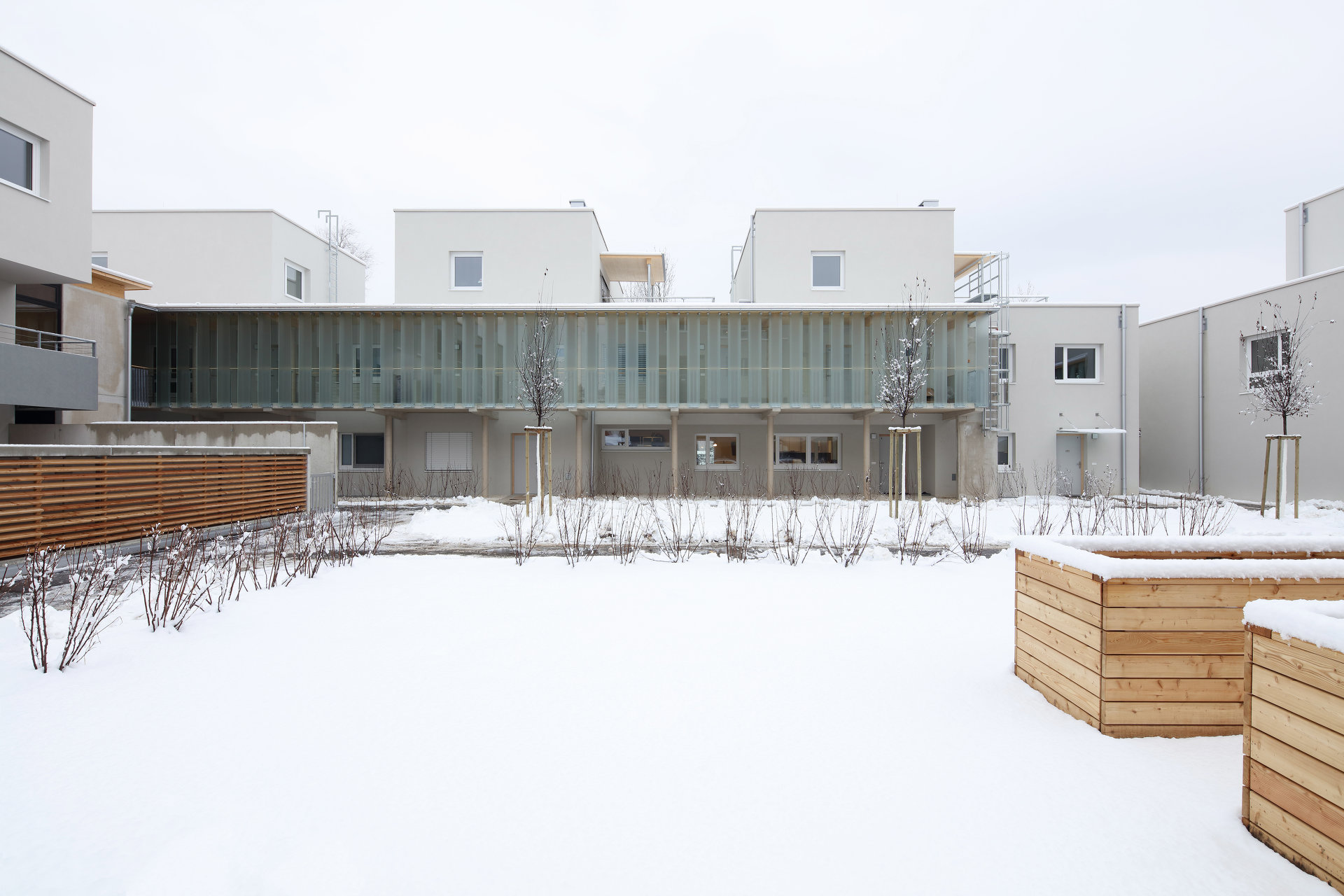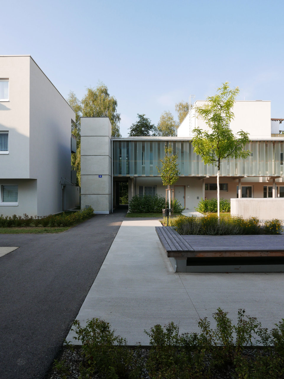 Zehn bis zu vier Geschoße hohe Baukörper sind deutlich in der Höhe abgestuft und sichtbar gegliedert zwecks Optimierung der Sonneneinstrahlung. Was damit auch angestrebt wurde und wie selbstverständlich gelang, ist ein maßvoller Übergang zur im Süden vorgelagerten, öffentlich nutzbaren Wiese, zur schönen Baumpflanzung am Ufer und zum Radweg entlang der Glan. Die Wohnungen im Erdgeschoß haben private Kleingärten. Jene am halb öffentlichen Grün und dem zentralen, teils befestigten Platz sind durch Hecken und halb hohe Lüftungsschächte der Tiefgarage getrennt, die Privatheit garantieren sollen. Der große Gemeinschaftsraum, auch zum Platz hin angelegt, eine gedeckte Spielfläche und die Wegeführung zur Erdgeschoß- und zur Laubengangerschließung signalisieren allerdings urbane Betriebsamkeit.