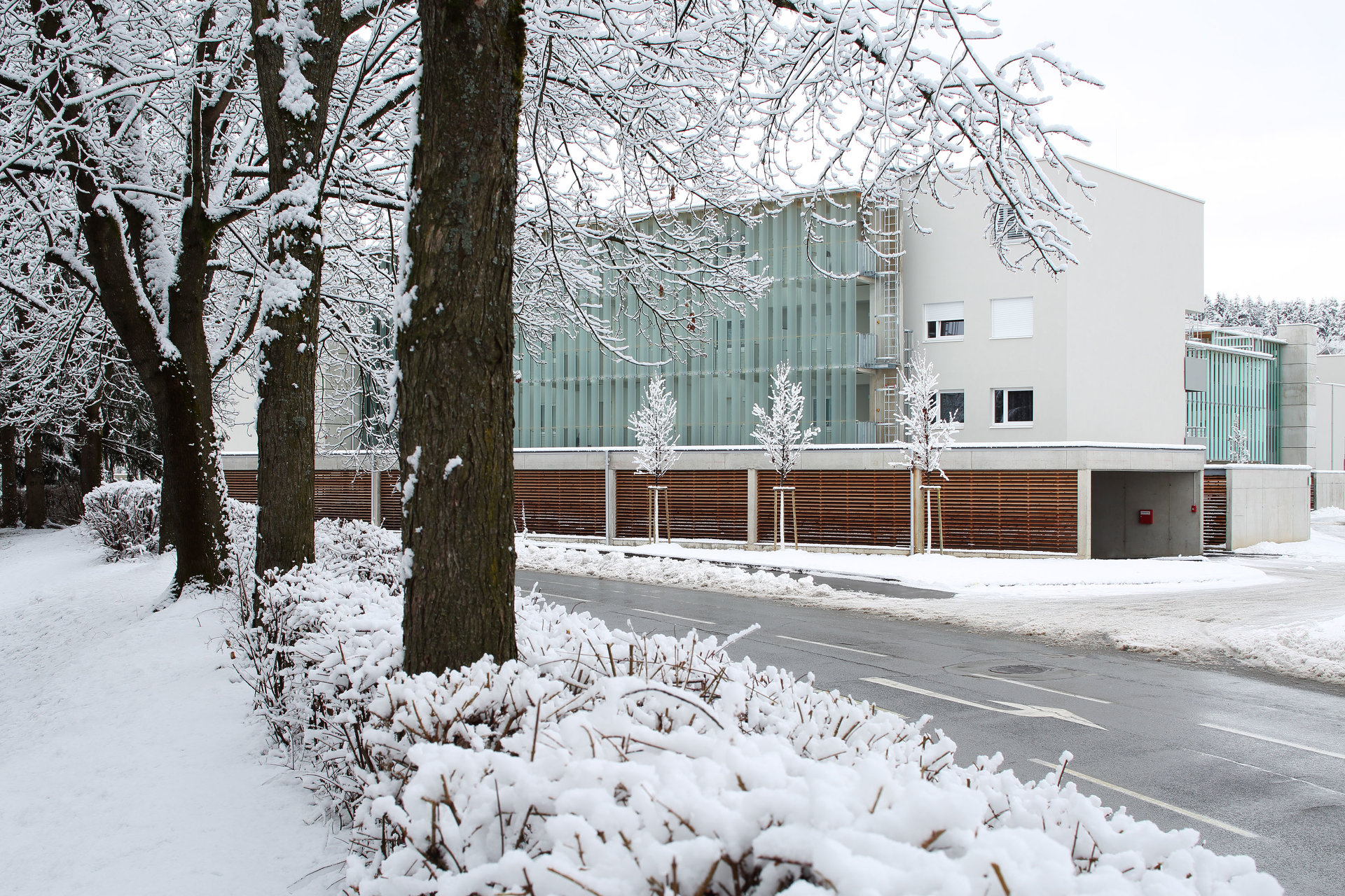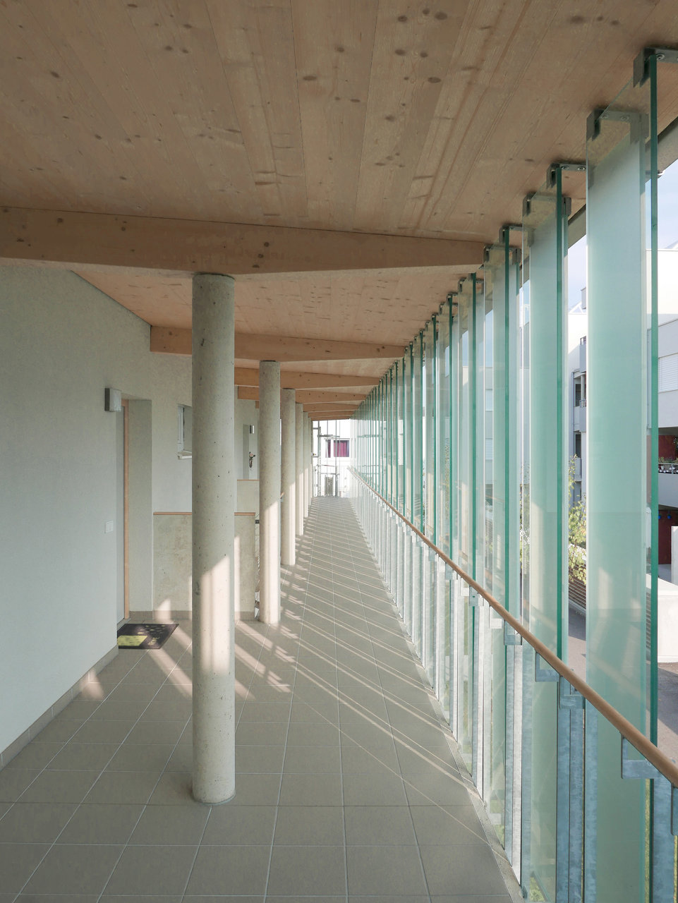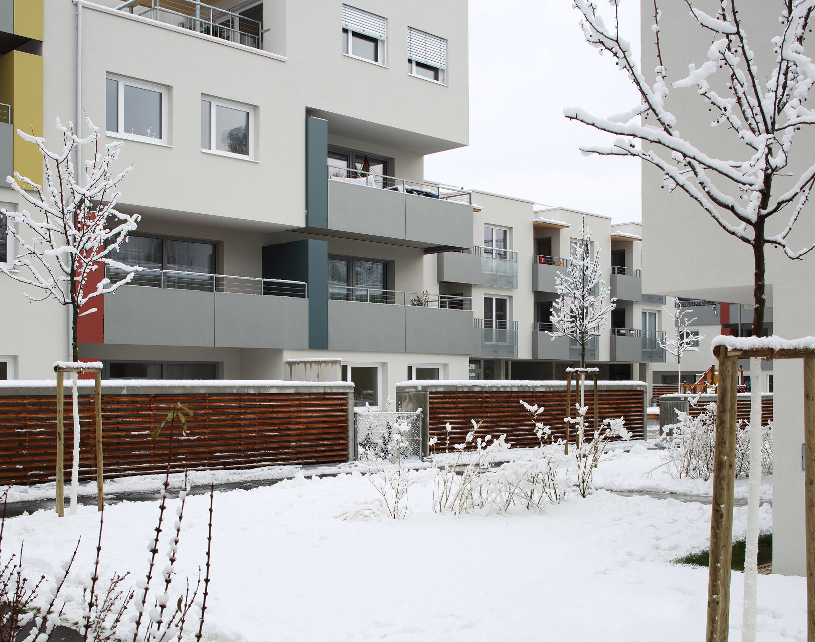 Zehn bis zu vier Geschoße hohe Baukörper sind deutlich in der Höhe abgestuft und sichtbar gegliedert zwecks Optimierung der Sonneneinstrahlung. Was damit auch angestrebt wurde und wie selbstverständlich gelang, ist ein maßvoller Übergang zur im Süden vorgelagerten, öffentlich nutzbaren Wiese, zur schönen Baumpflanzung am Ufer und zum Radweg entlang der Glan. Die Wohnungen im Erdgeschoß haben private Kleingärten. Jene am halb öffentlichen Grün und dem zentralen, teils befestigten Platz sind durch Hecken und halb hohe Lüftungsschächte der Tiefgarage getrennt, die Privatheit garantieren sollen. Der große Gemeinschaftsraum, auch zum Platz hin angelegt, eine gedeckte Spielfläche und die Wegeführung zur Erdgeschoß- und zur Laubengangerschließung signalisieren allerdings urbane Betriebsamkeit.
