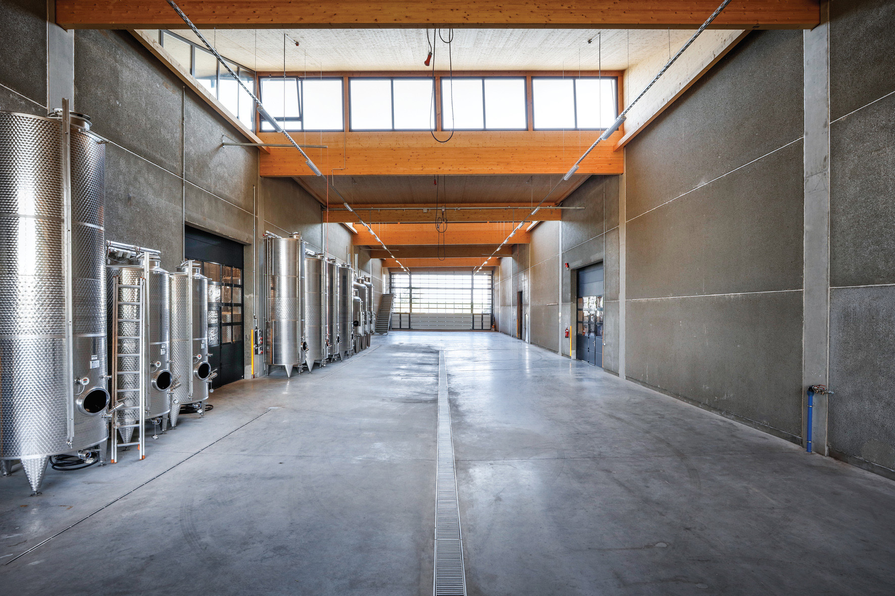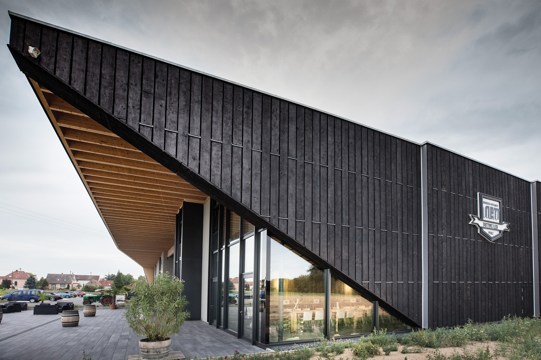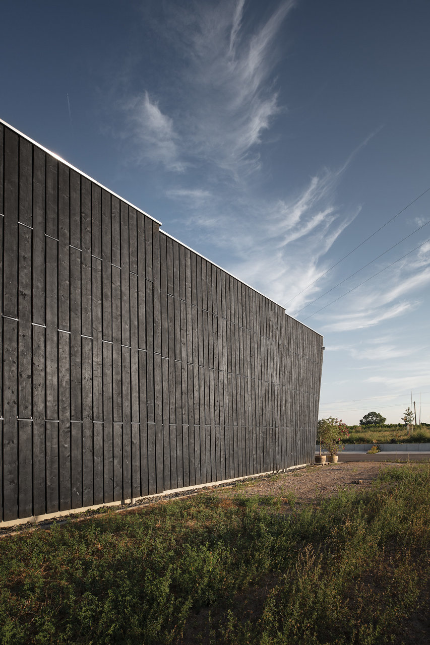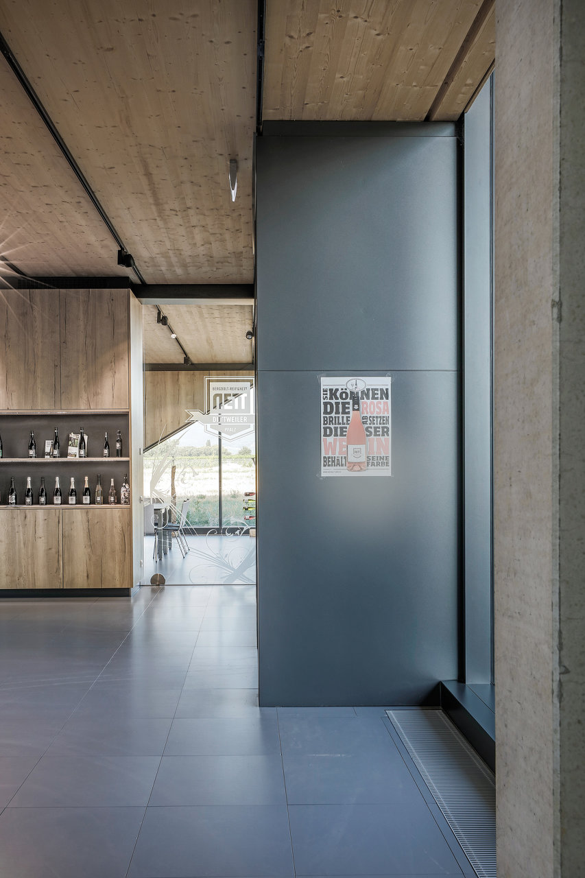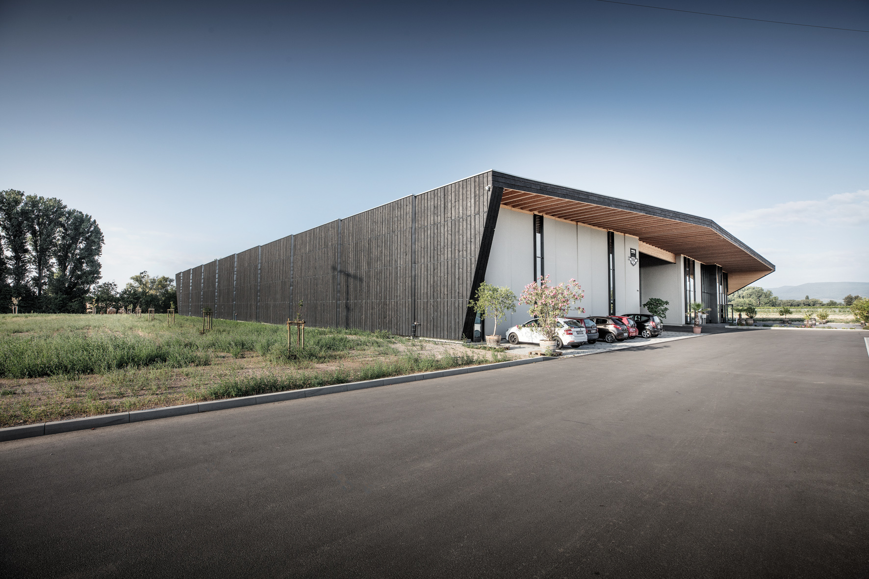 Das in eine Kulturlandschaft aus Weingärten, Acker- und Wiesenflächen eingebettete Weingut mit den Ausmaßen von 60 x 80 Metern erscheint auf den ersten Blick minimalistisch auf seine Materialien bezogen. Die großflächigen Holzaußenwände sind in Shou-Sugi-Ban behandelt, einer jahrtausendealten japanischen Holztechnik, bei der die Oberfläche durch Ankohlen geschützt wird. Die durch Bürsten und Ölen weiterentwickelte Holzbehandlung macht die bis zu fünf Meter langen Bohlen äußerst beständig und verleiht ihnen eine markante Oberflächenästhetik.