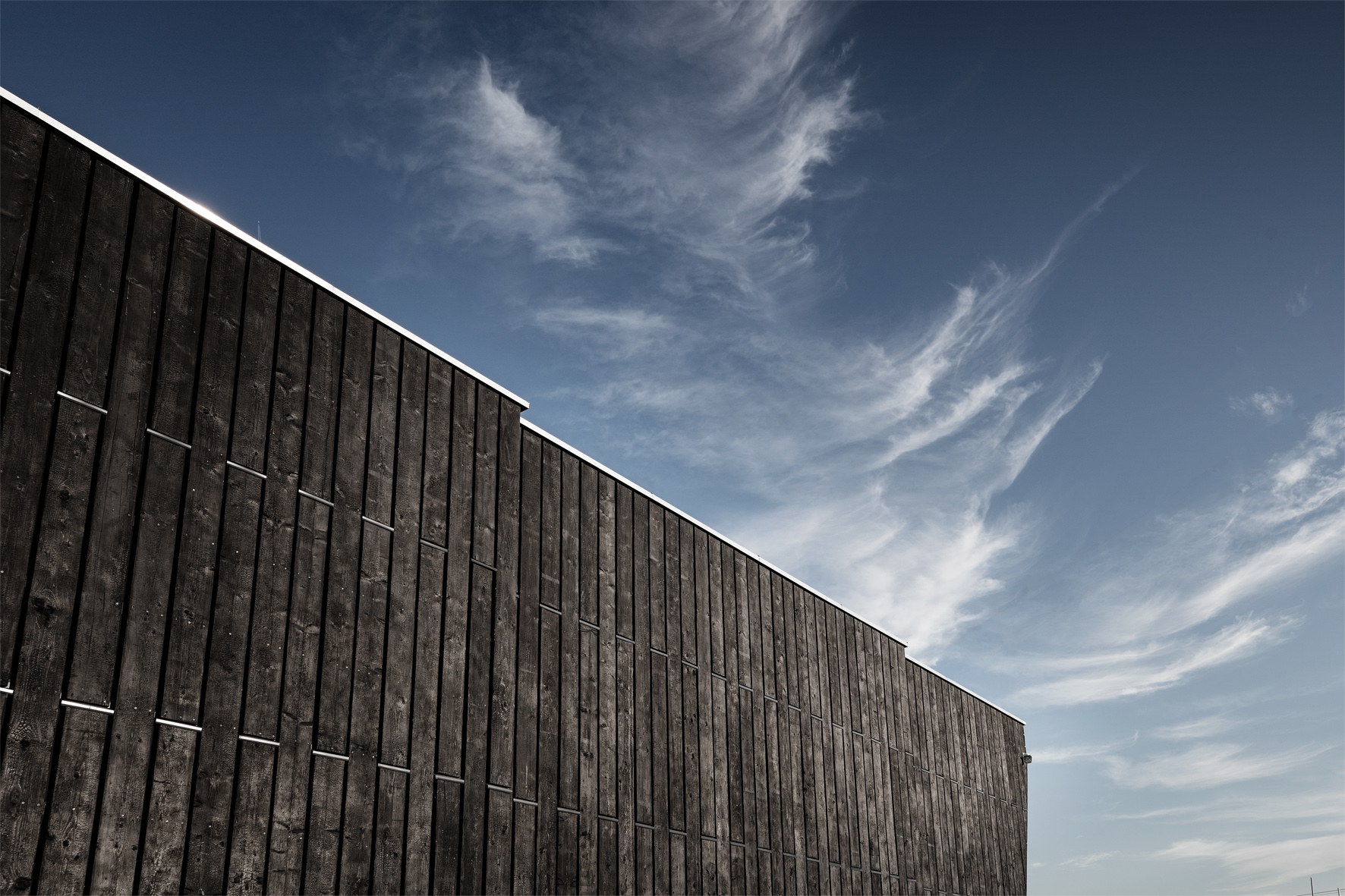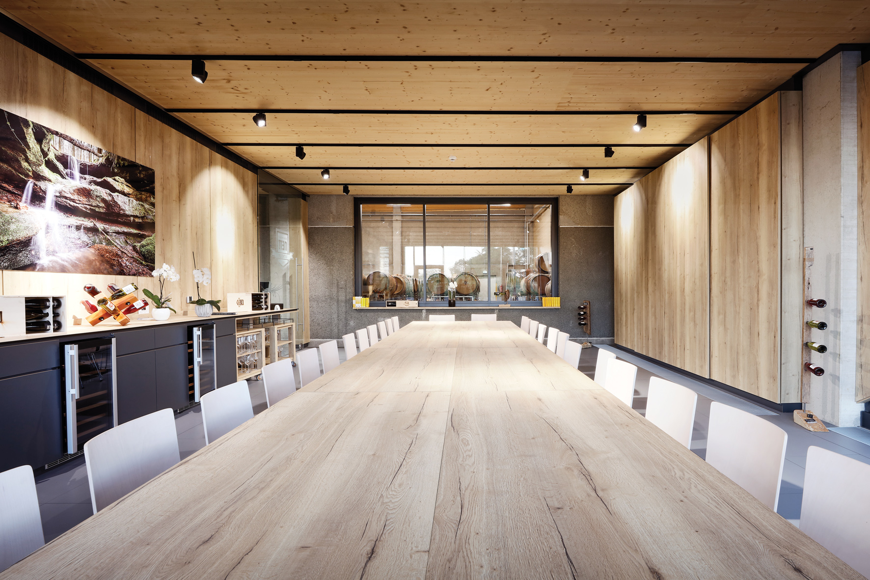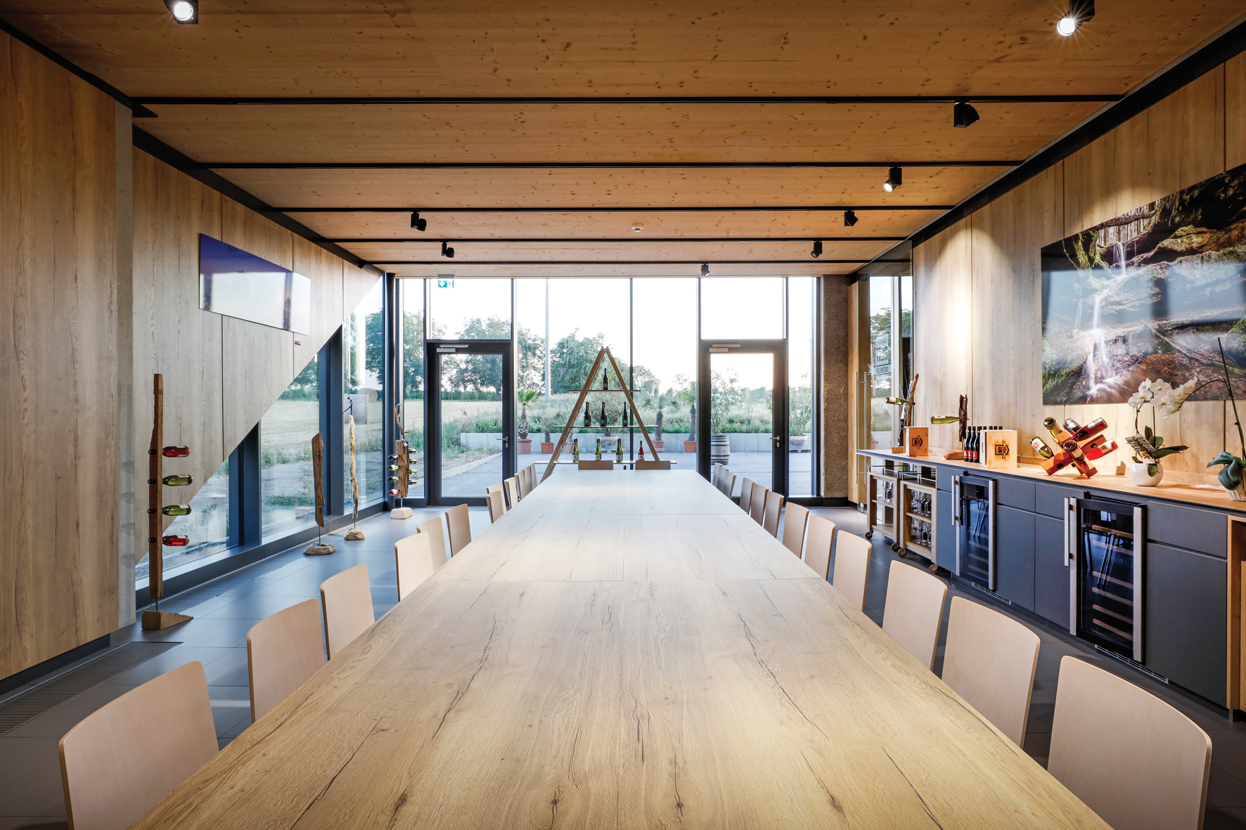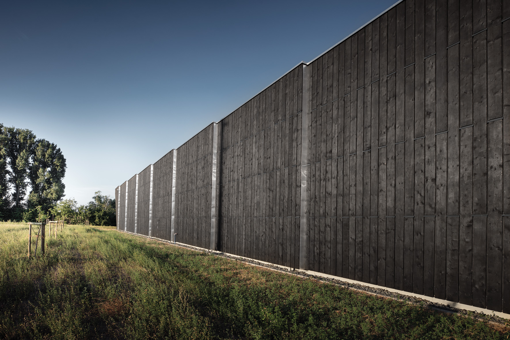 Das in eine Kulturlandschaft aus Weingärten, Acker- und Wiesenflächen eingebettete Weingut mit den Ausmaßen von 60 x 80 Metern erscheint auf den ersten Blick minimalistisch auf seine Materialien bezogen. Die großflächigen Holzaußenwände sind in Shou-Sugi-Ban behandelt, einer jahrtausendealten japanischen Holztechnik, bei der die Oberfläche durch Ankohlen geschützt wird. Die durch Bürsten und Ölen weiterentwickelte Holzbehandlung macht die bis zu fünf Meter langen Bohlen äußerst beständig und verleiht ihnen eine markante Oberflächenästhetik.