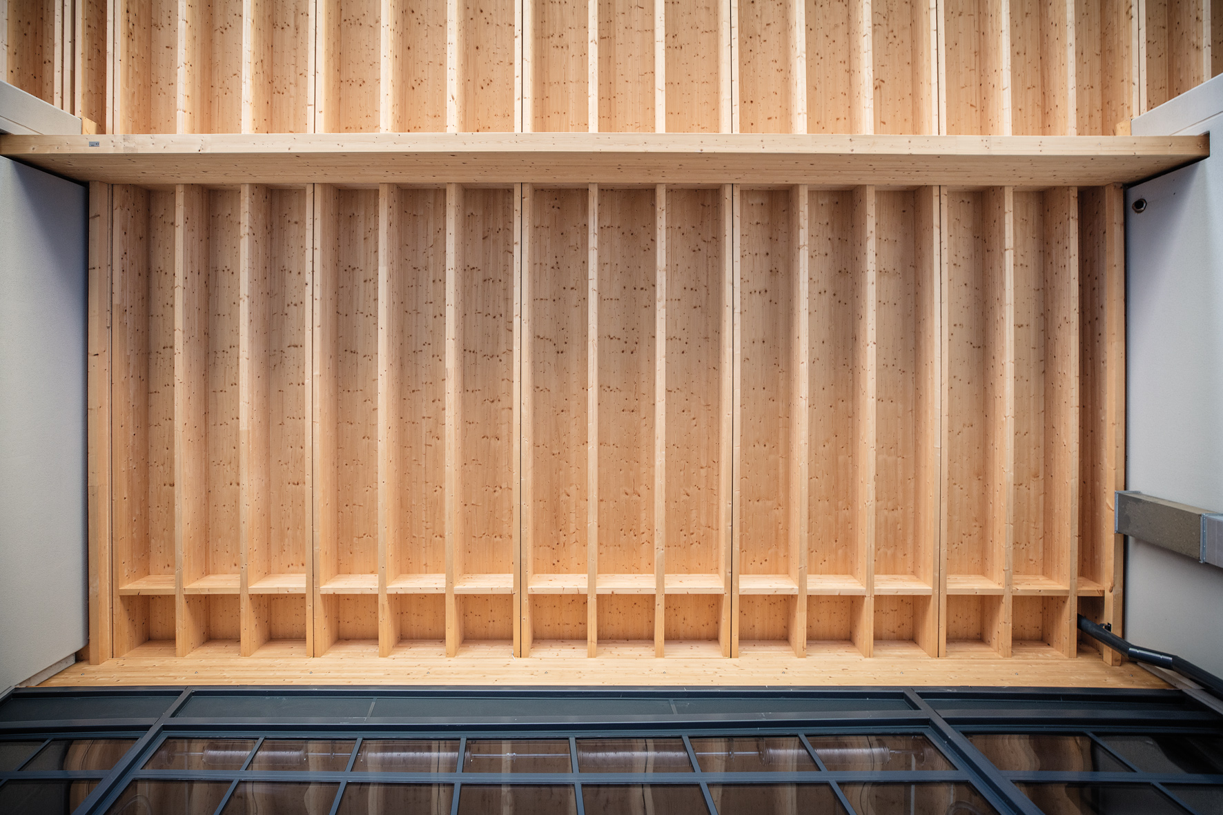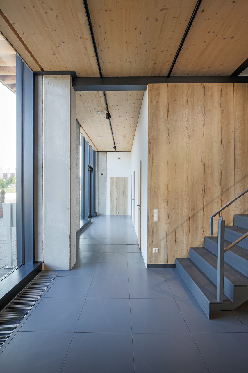 Die Tragstruktur der Hallen besteht aus 32 Brettschichtholzträgern mit Spannweiten von bis zu 25 Metern. So ist genügend Flexibilität vorhanden, um zukünftige Nutzungsänderungen zu ermöglichen. Über alles stülpt sich eine Hülle aus hochwärmegedämmten Dach- und Wandelementen aus Holz. Im Zusammenspiel mit dem nichttragenden Bims-Beton als klimatischer Speicher wird ein ausgezeichneter Energiestandard erreicht. Die in Richtung Süden und Norden großzügig auskragenden Vordächer ermöglichen, dass bei jeder Wetterlage auch Arbeiten im Freien verrichtet werden können. (Text: Architekten, gekürzt)