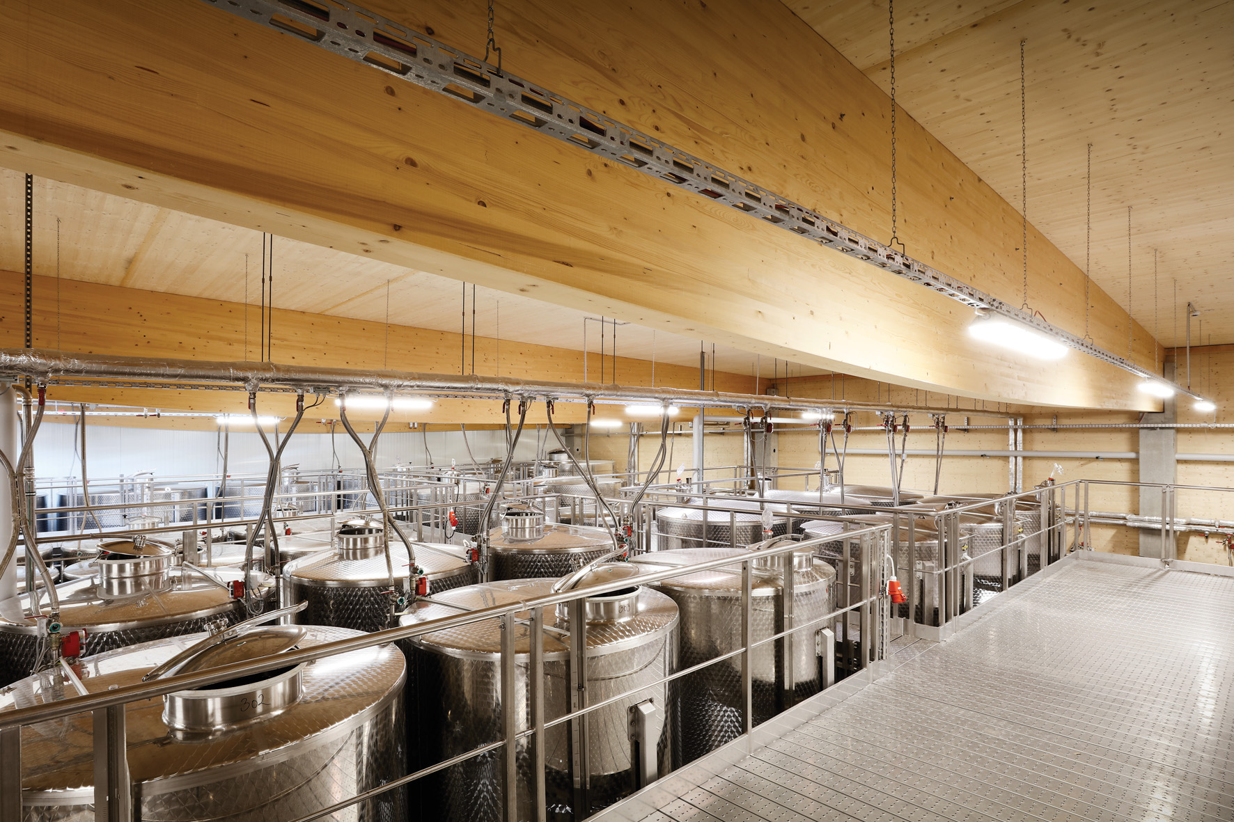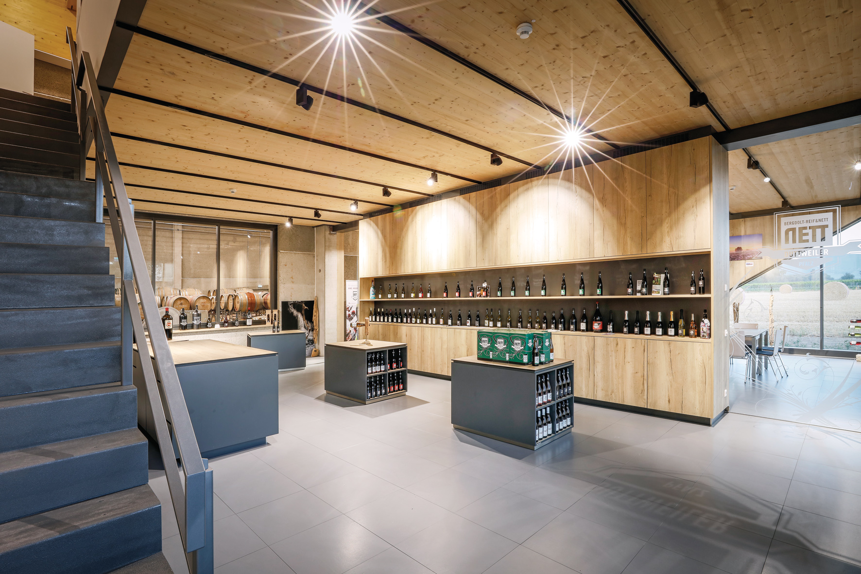 Der auf die Weinproduktion im Winzerjahreskreis zugeschnittene Grundriss erfasst alle Produktionsabläufe in zwei langgestreckten Hallen und einer dazwischenliegenden, überdachten Passage. Die westliche Halle besteht aus dem Verkaufs- und Bürobereich, der sowohl Einblicke in den Fassraum als auch einen Panorama-Ausblick in Richtung Mandelberg freigibt. Direkt angrenzend befinden sich der Holzfassraum und die Weintankhalle und in Richtung Süden der Wohnbereich der Winzerfamilie. Die östliche Halle besteht aus Flaschenlagern und anderen Lagerbereichen. Dazwischen befindet sich die multifunktional nutzbare Passage, in der temporär saisonale Arbeiten wie Pressen, Maischegärung, Vorklärung oder mobile Abfüllung stattfinden können.