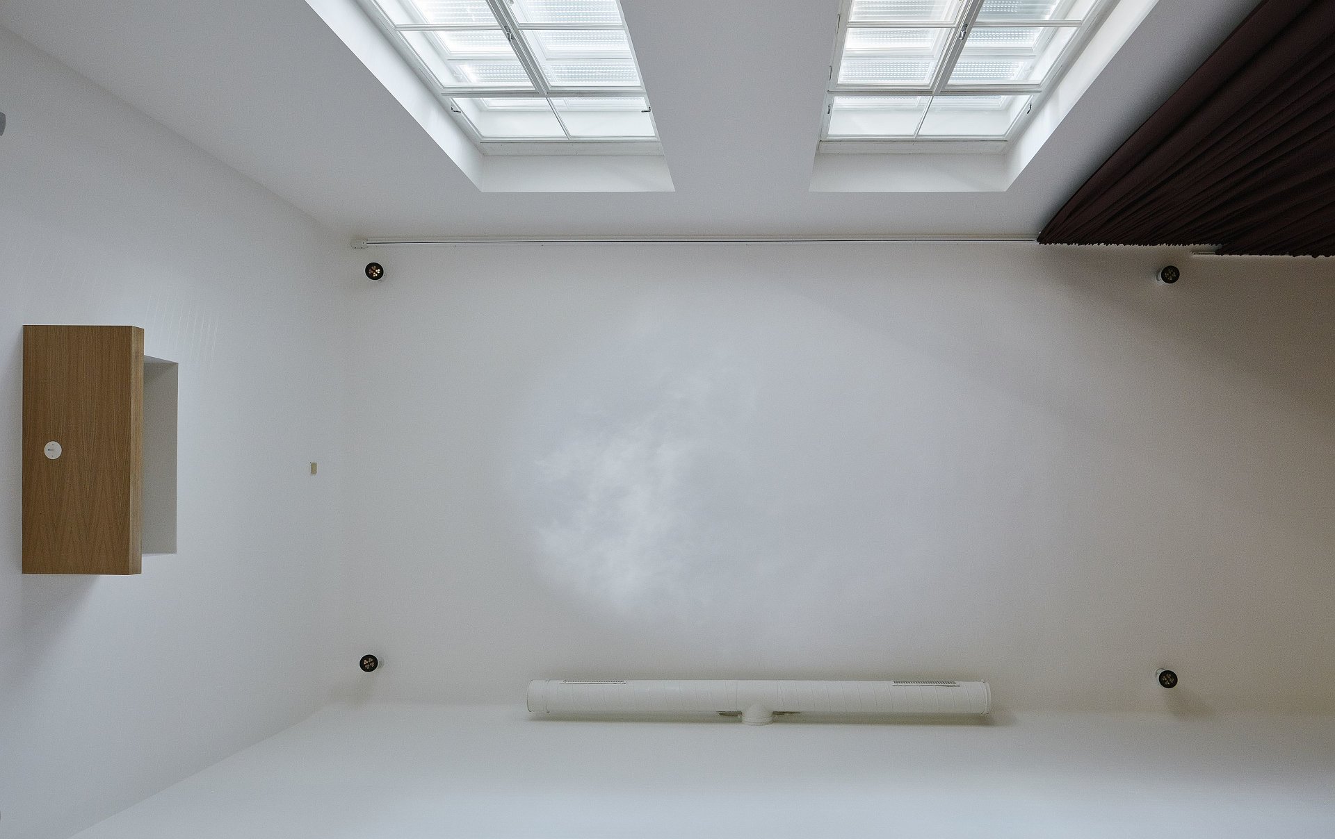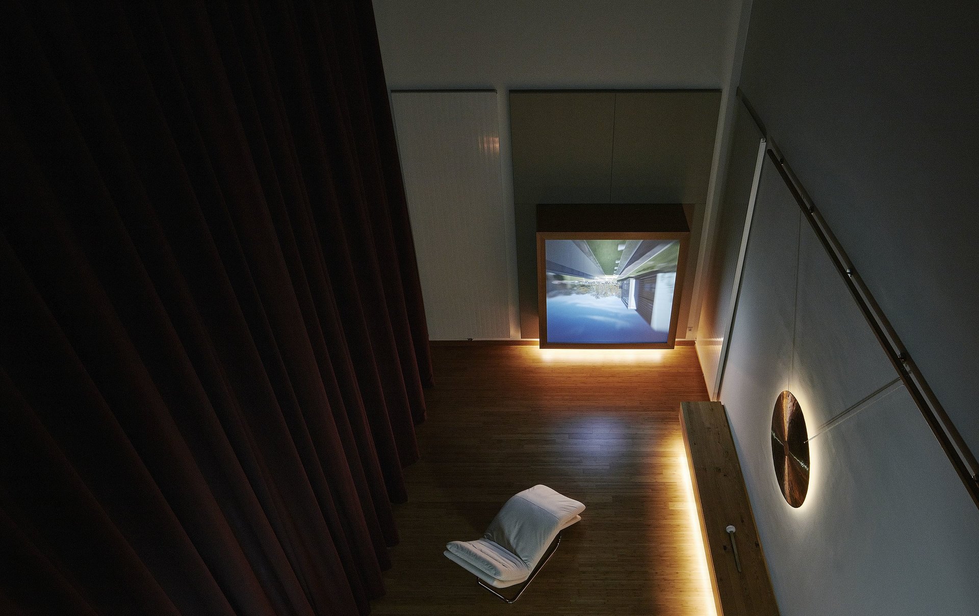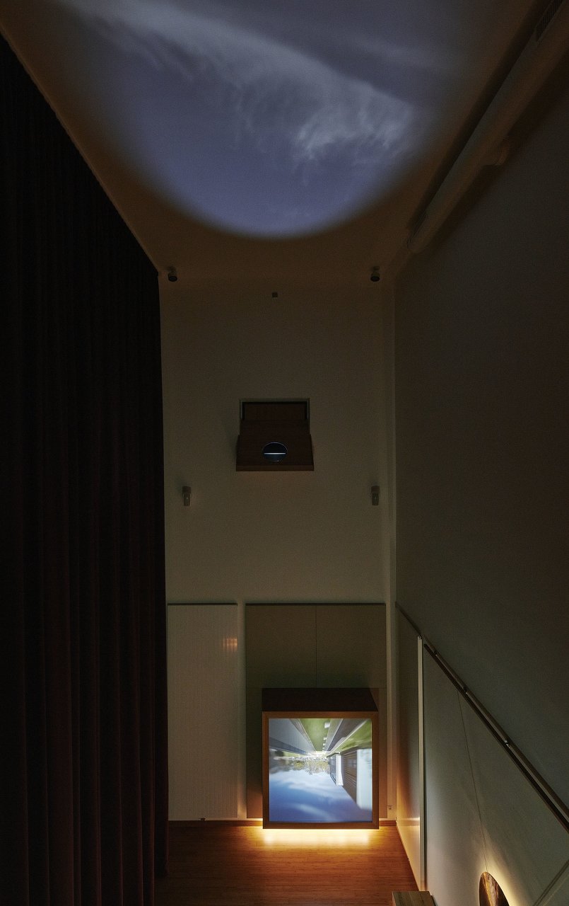 Die erste begehbare Camera Obscura für solche Zwecke wurde im Rahmen des Um- und Zubaus des LKH Fürstenfeld 2017 als Dauerinstallation in einen Aufenthaltsraum der Palliativstation eingebaut. Sie ist eine kontextsensitive Wahrnehmungsinstallation, die den Patient:innen und Besucher:innen ein erweitertes Wahrnehmungsspektrum des umgebenden Ortes eröffnet aber auch ihre subjektiven Gedankenwelten in Bewegung setzt. Konkret kann man im 4 Meter breiten und 9 Meter hohen abgedunkelten „Raum der Stille“ eine Projektion der neuen Gartenanlage an der Wand sowie des bewegten Wolkenhimmels an der Decke auf sich wirken lassen. Die optischen Installationen unterstützen die Wirkung des in Zusammenarbeit mit der ARGE Morawetz-Zinganel gestalteten Raumes und ergänzen das übrige Angebot im „Raum der Stille“: Ruheliege und Massagestuhl, lange Sitzbank, Liegematten und Gong. Durch Öffnen und Schließen der Jalousien bzw. des Vorhanges und durch Verändern der Beleuchtung lassen sich unterschiedliche Lichtstimmungen und Nutzungsszenarien im Raum erzeugen.