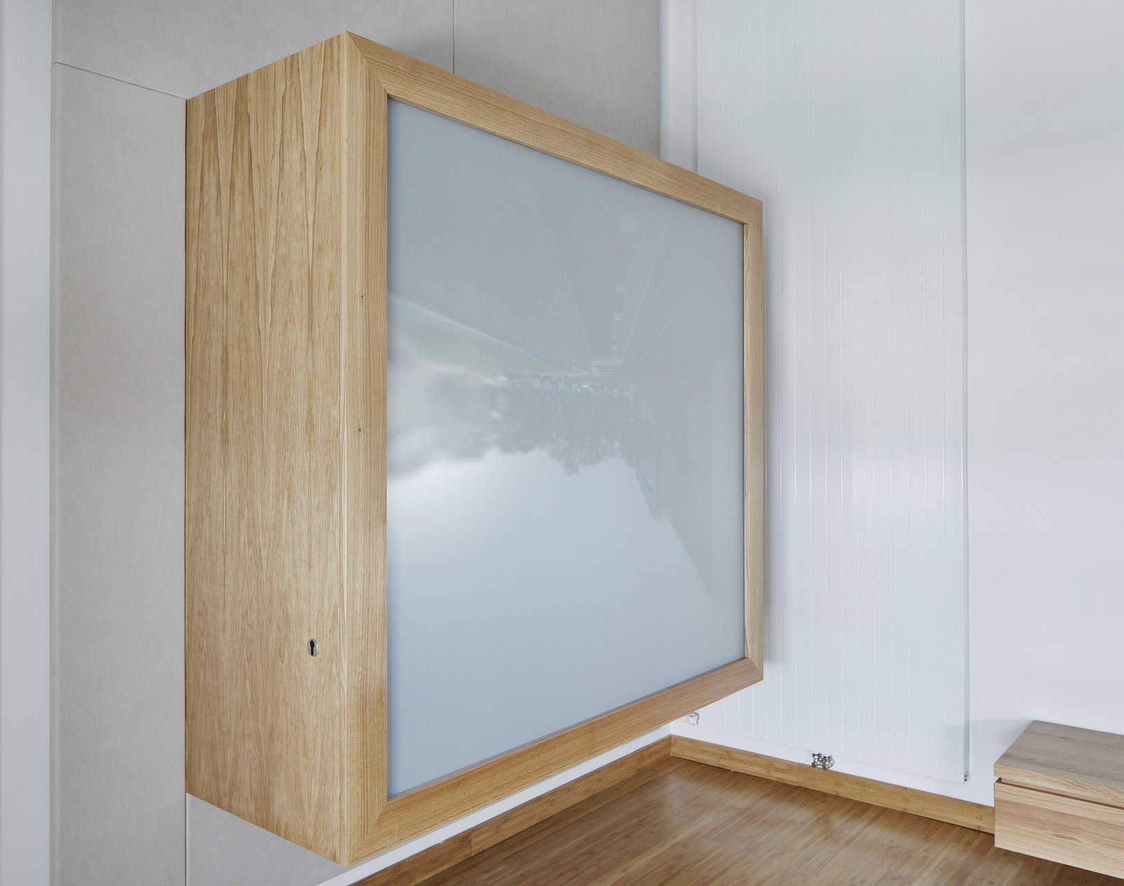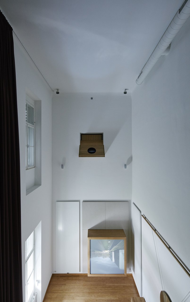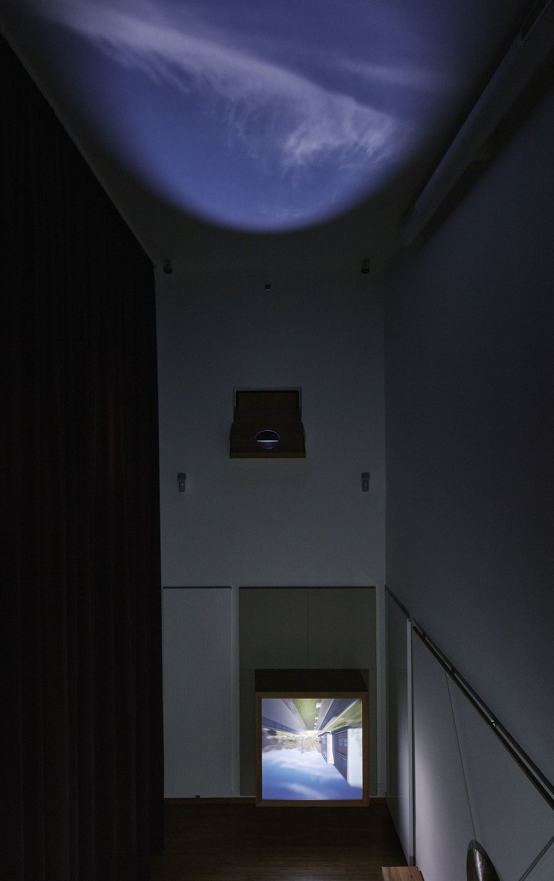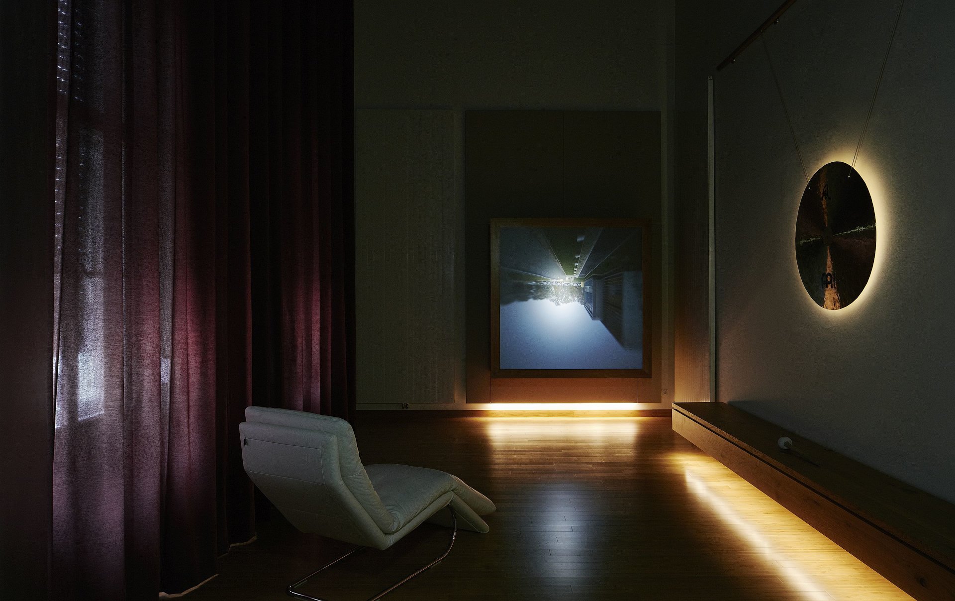 Die erste begehbare Camera Obscura für solche Zwecke wurde im Rahmen des Um- und Zubaus des LKH Fürstenfeld 2017 als Dauerinstallation in einen Aufenthaltsraum der Palliativstation eingebaut. Sie ist eine kontextsensitive Wahrnehmungsinstallation, die den Patient:innen und Besucher:innen ein erweitertes Wahrnehmungsspektrum des umgebenden Ortes eröffnet aber auch ihre subjektiven Gedankenwelten in Bewegung setzt. Konkret kann man im 4 Meter breiten und 9 Meter hohen abgedunkelten „Raum der Stille“ eine Projektion der neuen Gartenanlage an der Wand sowie des bewegten Wolkenhimmels an der Decke auf sich wirken lassen. Die optischen Installationen unterstützen die Wirkung des in Zusammenarbeit mit der ARGE Morawetz-Zinganel gestalteten Raumes und ergänzen das übrige Angebot im „Raum der Stille“: Ruheliege und Massagestuhl, lange Sitzbank, Liegematten und Gong. Durch Öffnen und Schließen der Jalousien bzw. des Vorhanges und durch Verändern der Beleuchtung lassen sich unterschiedliche Lichtstimmungen und Nutzungsszenarien im Raum erzeugen.