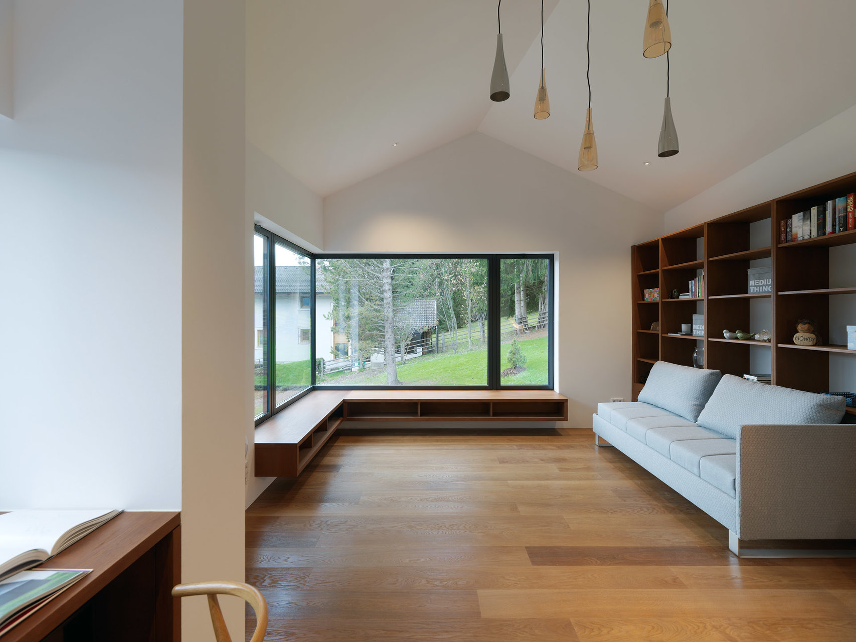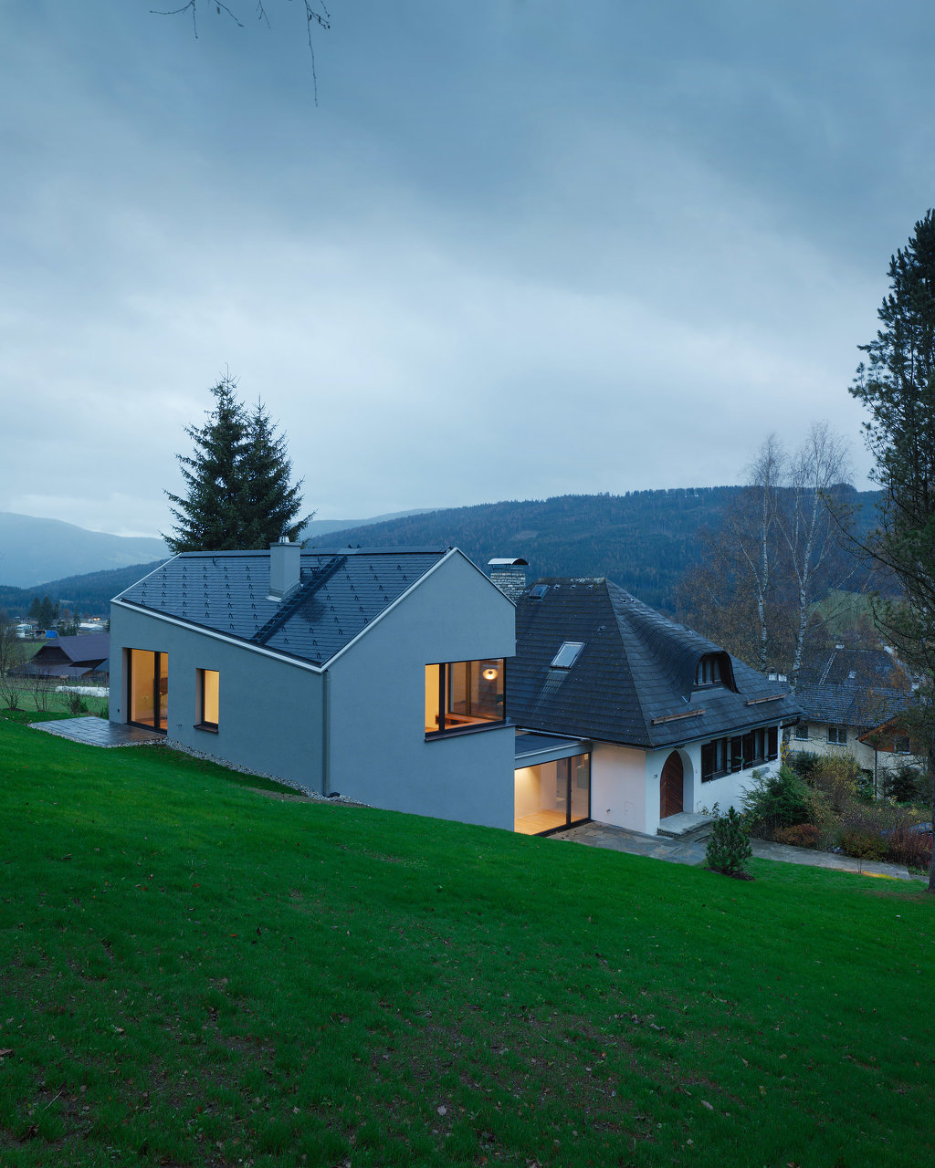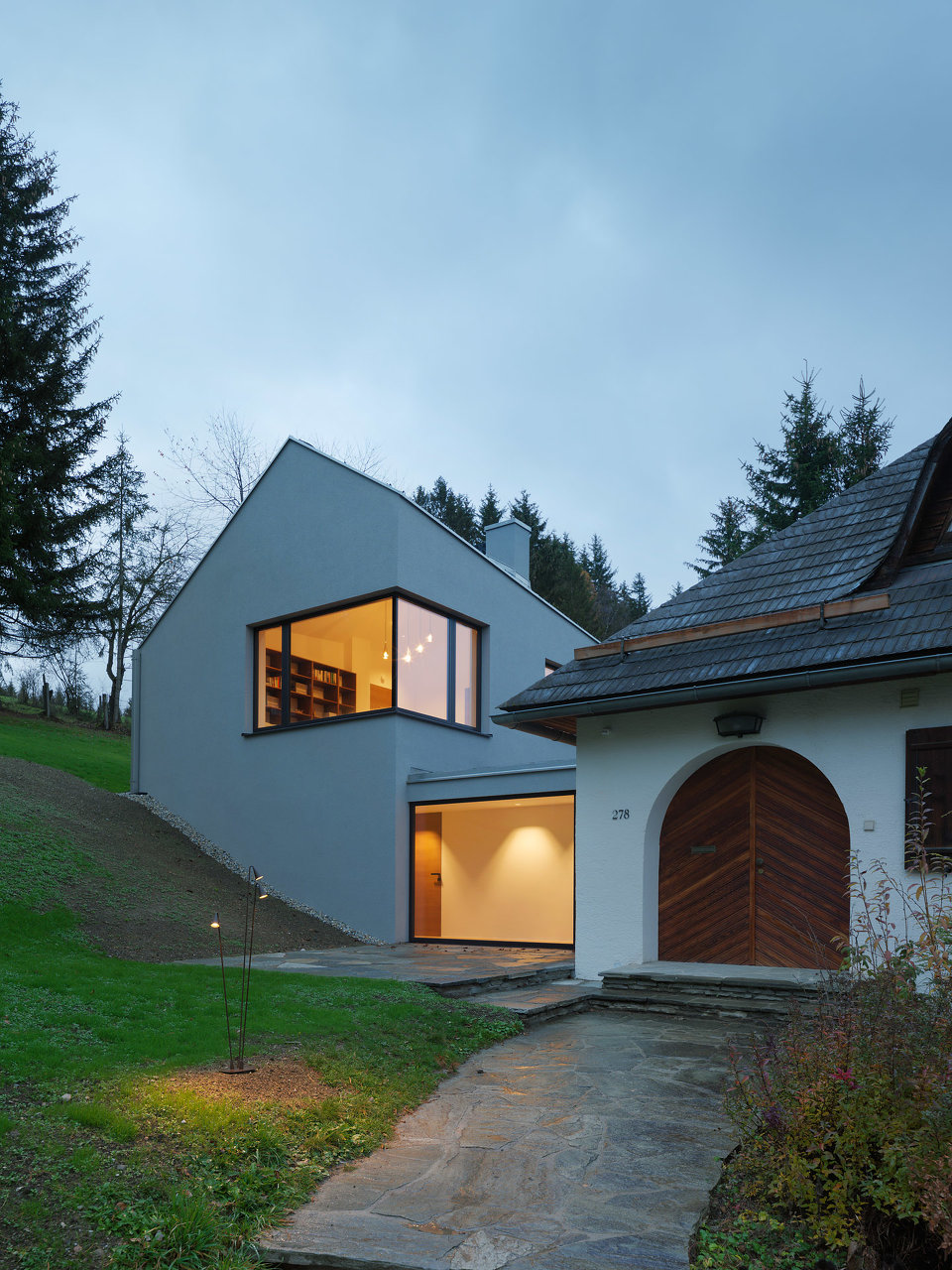 Der Zubau ist vom Bestand abgerückt und durch einen Verbindungsgang mit diesem verbunden. Dadurch entsteht ein privater Innenhof der vom Wellnessbereich im Erdgeschoß des Erweiterungsbaus erreichbar ist. In der neuen Wohneinheit im Obergeschoß entstehen durch die erwähnte Drehung der Firstlinie verschiedene Raumhöhen, die auf die jeweiligen Funktionen der Räume abgestimmt sind. Während sich die Räume im Erdgeschoß introvertiert zum Innenhof öffnen, zelebriert das Obergeschoß die unterschiedlichen Raumqualitäten mit wechselnden Raumhöhen und Ausblicken. (Text: Architekten)