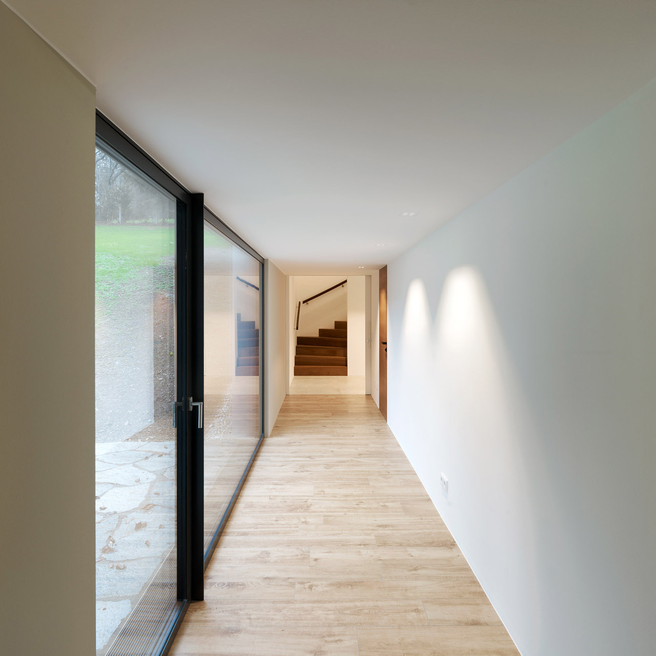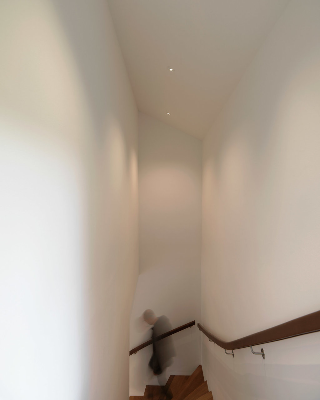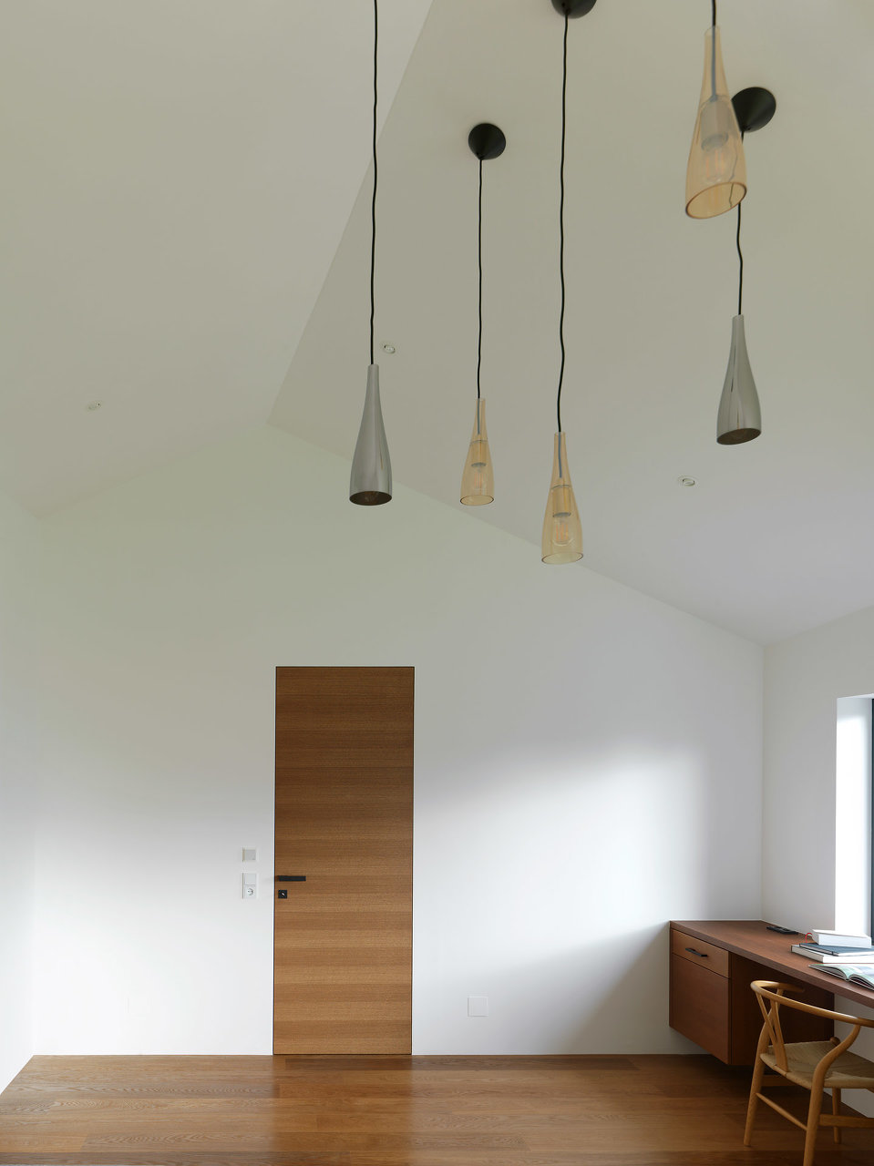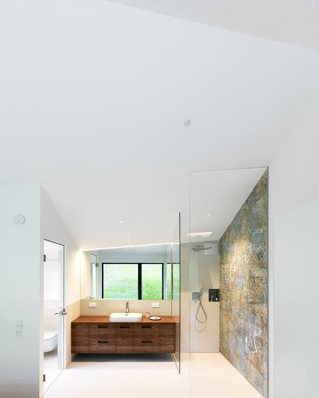 Der Zubau ist vom Bestand abgerückt und durch einen Verbindungsgang mit diesem verbunden. Dadurch entsteht ein privater Innenhof der vom Wellnessbereich im Erdgeschoß des Erweiterungsbaus erreichbar ist. In der neuen Wohneinheit im Obergeschoß entstehen durch die erwähnte Drehung der Firstlinie verschiedene Raumhöhen, die auf die jeweiligen Funktionen der Räume abgestimmt sind. Während sich die Räume im Erdgeschoß introvertiert zum Innenhof öffnen, zelebriert das Obergeschoß die unterschiedlichen Raumqualitäten mit wechselnden Raumhöhen und Ausblicken. (Text: Architekten)