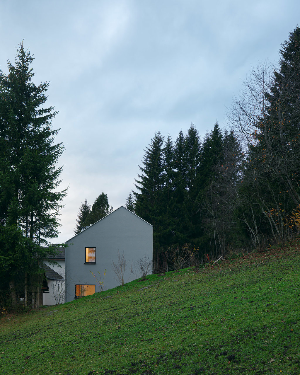 Der Entwurf nimmt auf die Hanglage des Grundstücks Rücksicht und steht in klarem Kontrast zum bestehenden Gebäude, gleichzeitigt interpretiert der Baukörper die traditionellen Bauformen des Salzburger Lungau auf zeitgenössische Art. Die Drehung der Firstlinie verleiht dem Volumen zu-sätzliche Dynamik – an der Westfassade entsteht eine großzügige Ausblicksituation, während die ostseitige Giebelwand dem bestehenden Gelände folgt und sich harmonisch in die Umgebung einfügt.