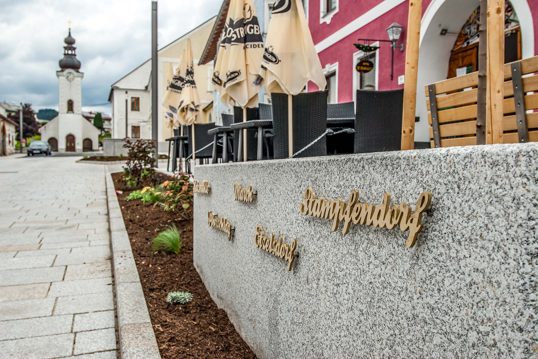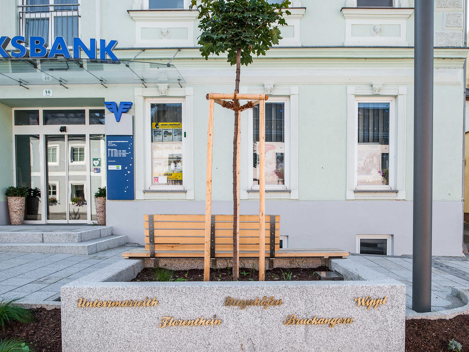Auch die Möblierung des Platzes ist zweckmäßig und ansprechend schlicht. Einfache Kandelaber begleiten den Straßenverlauf. Die ursprünglich projektierte Beleuchtung der Fassaden hat sich als zu verhandlungsintensiv für eine Realisierung erwiesen. Den Wunsch des „Forums Marktplatz“ nach einer Begrünung des Platzes haben die Planer mit Hilfe einer Maßnahme erfüllt, die dem abschüssigen Terrain zusätzlich die eine oder andere ebene Fläche abgewinnt: Im oberen Teil des Platzes weisen die Bereiche vor den Hauseingängen kein Quergefälle auf. Den Höhenunterschied zur Fahrbahn überbrücken hier schmale Staudenbeete. Sie werden von steingefassten, mit den Namen der zum Gemeindegebiet gehörenden Ortschaften versehenen Pflanztrögen für kleinkronigen Kugelahorn ergänzt, auf denen hölzerne Sitzbänke montiert sind.