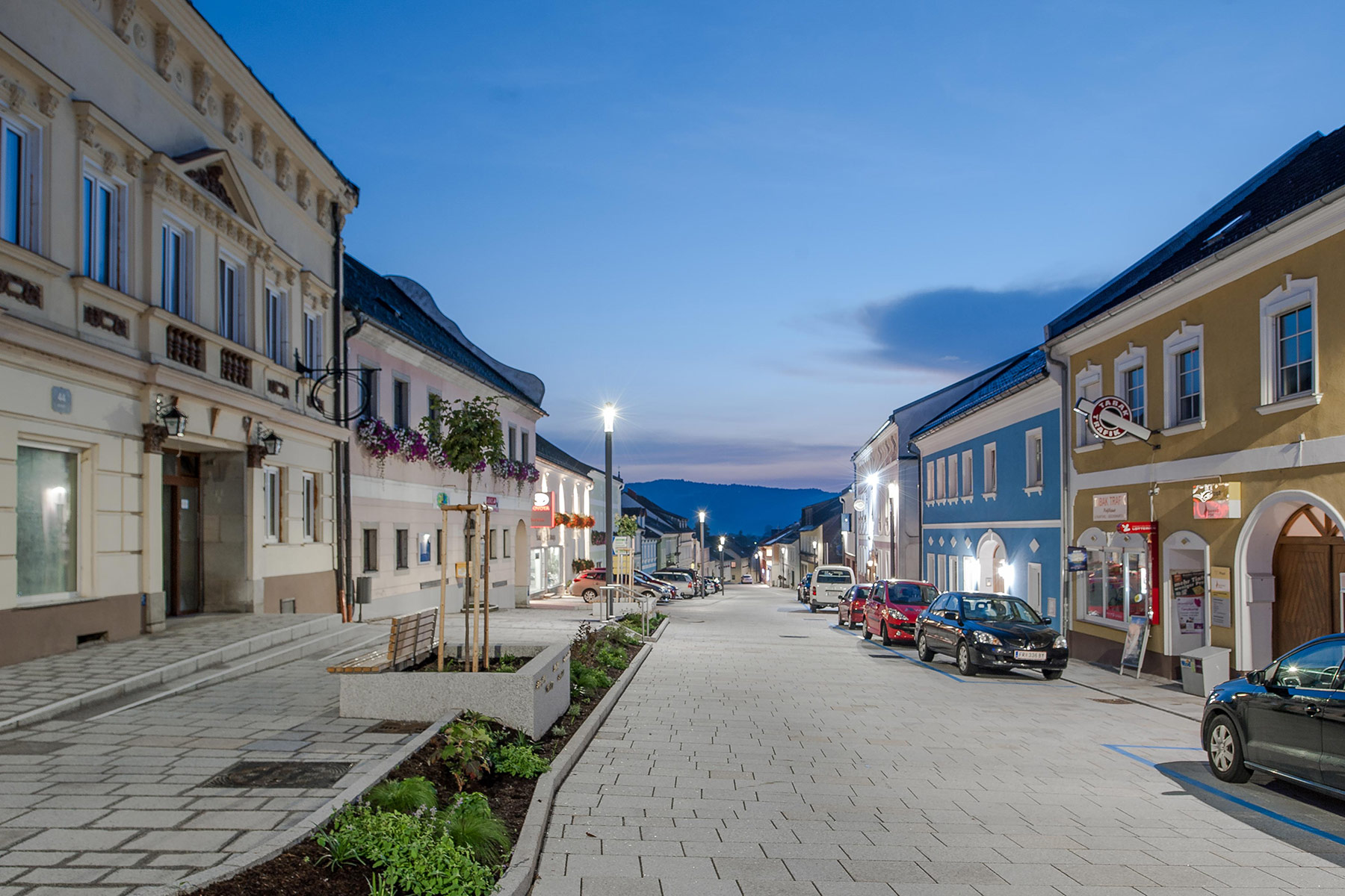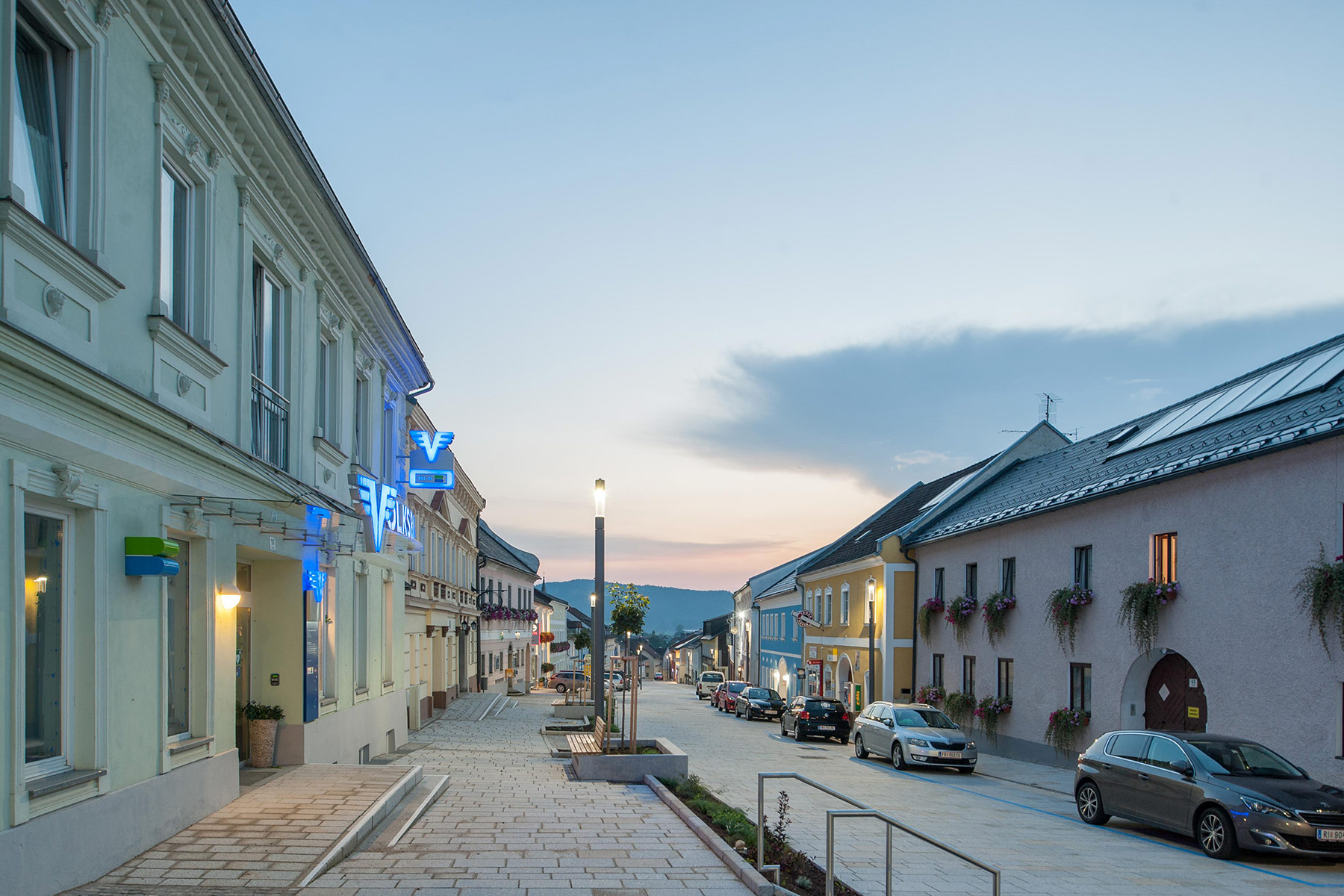 Es gehört zu den wichtigsten Qualitäten des gebauten Ergebnisses, dass es trotz der Fülle der behandelten Themen nicht zur gruseligen Leistungsschau guter Ideen geraten ist. Vielmehr haben Lobmaierstockinger gemeinsam mit dem Verkehrsplaner Hans Haller aus Kirchberg den Bestand rigoros von Überflüssigem befreit und so das darin angelegte Gemeinsame und Verbindende sichtbar gemacht. Dieses findet sich vor allem in den zwar bunten, doch nach wie vor stimmig anmutenden Fassadenfolgen zu beiden Seiten des Platzes und dem scheinbar mühelosen Reagieren des Raumes auf die anspruchsvolle Topografie des Mühlviertler Hügellands. Dazu kommt noch die Wahl eines einheitlichen, verschiedensten Situationen angemessenen Belags, sodass sich der neue Marktplatz wie ein ordentlich gefegtes Zimmer präsentiert, das in seiner Dimension und Ausstattung gleichermaßen einladend und robust genug wirkt, es mit Aktivitäten zu füllen.