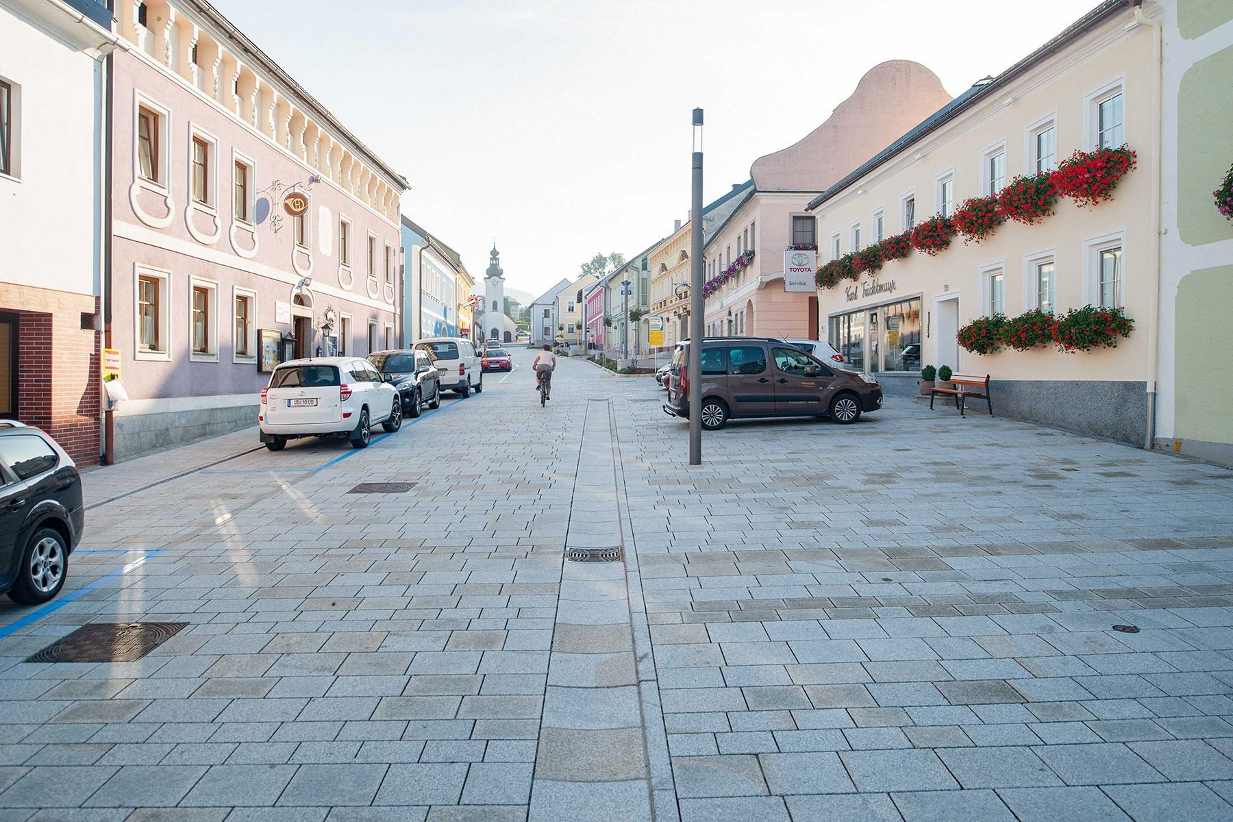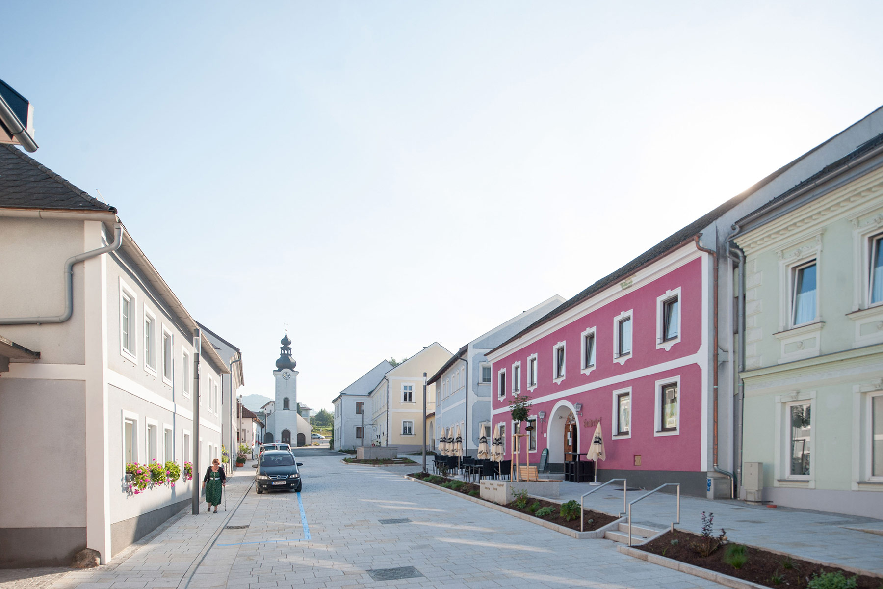 Eigentlich ist der Marktplatz von St. Oswald eine – relativ steile – Straße, die, von Westen kommend, nach Osten ansteigt und dort vom Marktturm zeichenhaft abgeschlossen wird. Der Platz ist als Begegnungszone und barrierefrei angelegt, was angesichts seiner starken, von allerlei Quergefälle durchzogenen Steigung eine große Herausforderung für die Planung war. Als Belag dient heimischer, aus dem benachbarten Niederösterreich stammender Granit. Das Material des vom oberen Ende des Marktplatzes aus sichtbaren Steinbruchs wäre in seiner stetigen Farbigkeit für das ländliche Umfeld zu gleichförmig gewesen. Immerhin konnte, nicht ohne Kampf, ein Steinimport aus China abgewendet werden. Die durch diese nachhaltige Entscheidung verursachten, nicht unbeträchtlichen Kosten konnte man durch eine sehr einfache Maßnahme in Grenzen halten: So weit das Budget reichte, findet sich der Stein in Streifen von drei Formaten quer zum Straßenverlauf von Platzwand zu Platzwand verlegt. Am oberen und am unteren Ende des Marktplatzes übernimmt kostengünstiger Asphalt, von flachen granitenen Leistensteinen gefasst, diese Funktion.