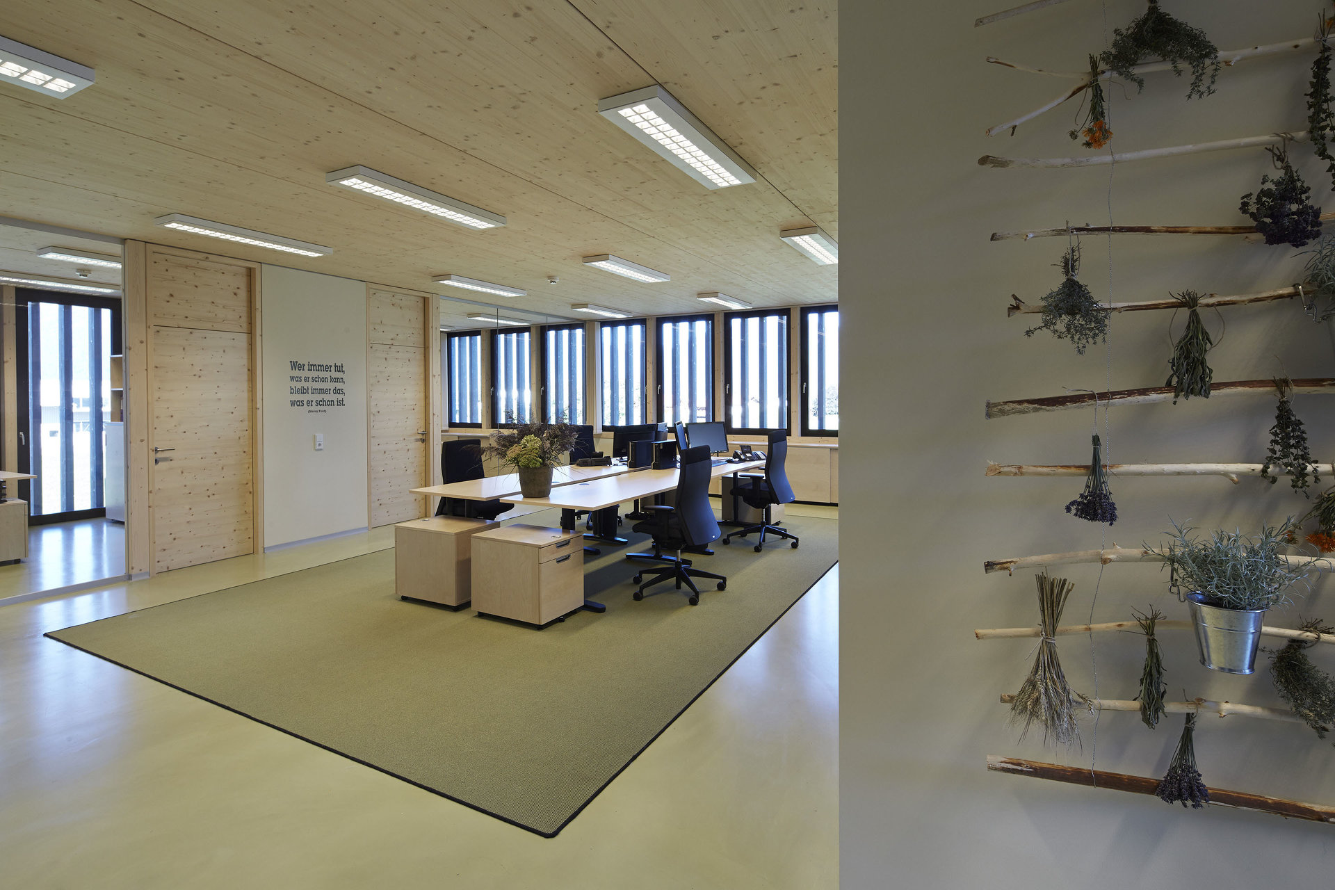 Im Erdgeschoss befinden sich der Versand- und Logistikbereich, die Technikzentrale und ein kleiner Verkaufsshop. Das Obergeschoss bietet Raum für die Büroräumlichkeiten, die Cafeteria und das Seminarzentrum. Das Herzstück des Obergeschosses bildet die Terrasse, welche als Erholungsbereich, Begegnungszone und Kräutergarten dient.