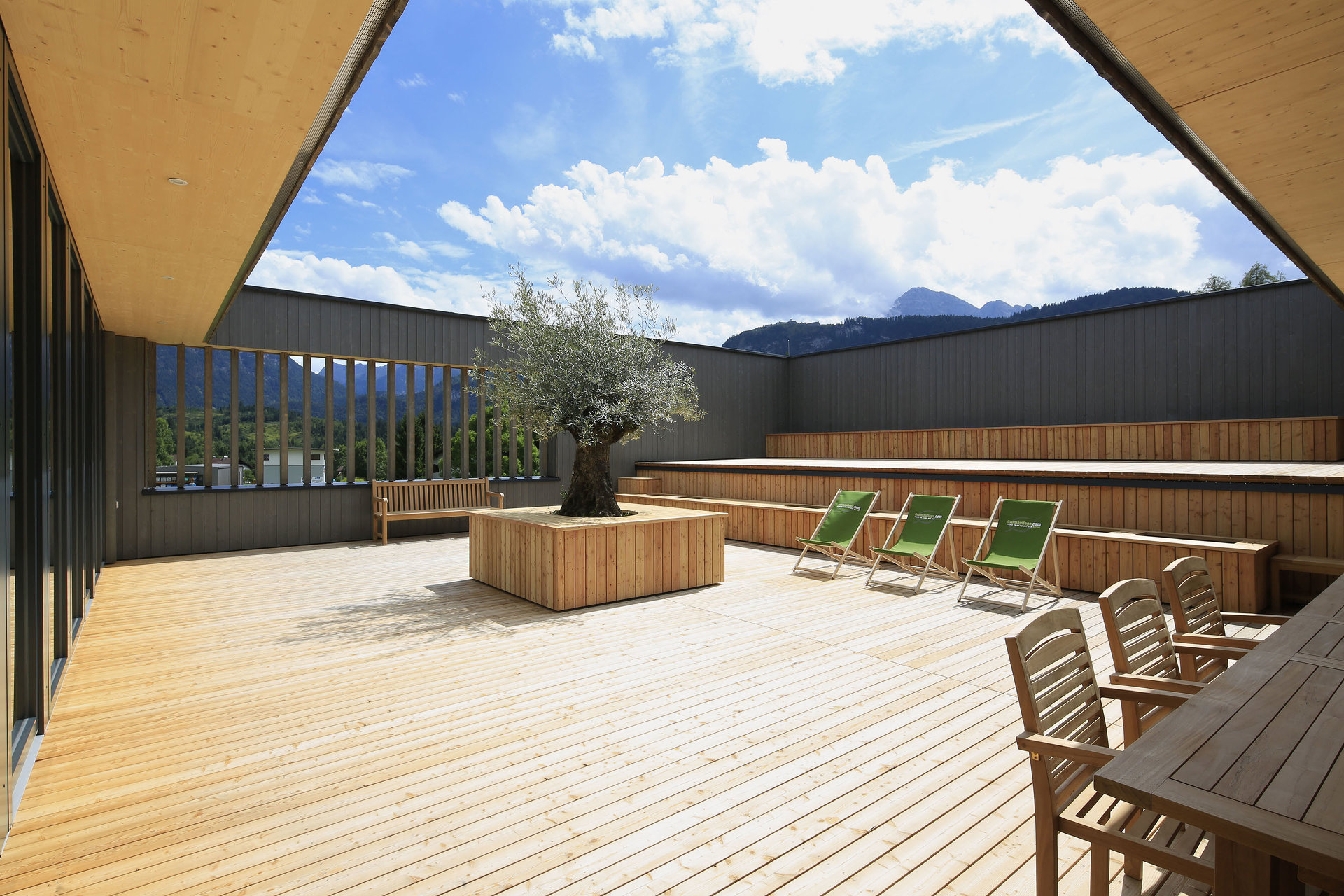 Durch die kompakte Geometrie des Gebäudes entstehen sehr kurze Wege, spannende Durch- und Einblicke und unvergleichbare Ausblicke auf das Bergmassiv des Ausserfern. Durch das Naheverhältnis von Produktion, Versand, Büro und Seminarbetrieb können Synergien zwischen den Mitarbeitern und den Seminarbesuchern auf kurzem Wege diskutiert, optimiert und verbessert werden. (Text: Architekt:innen)