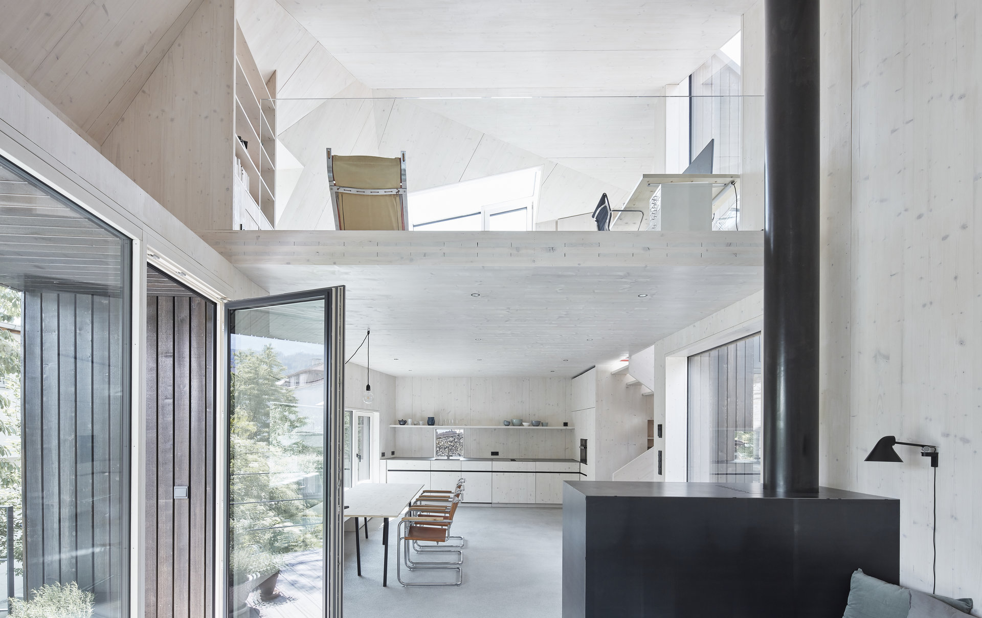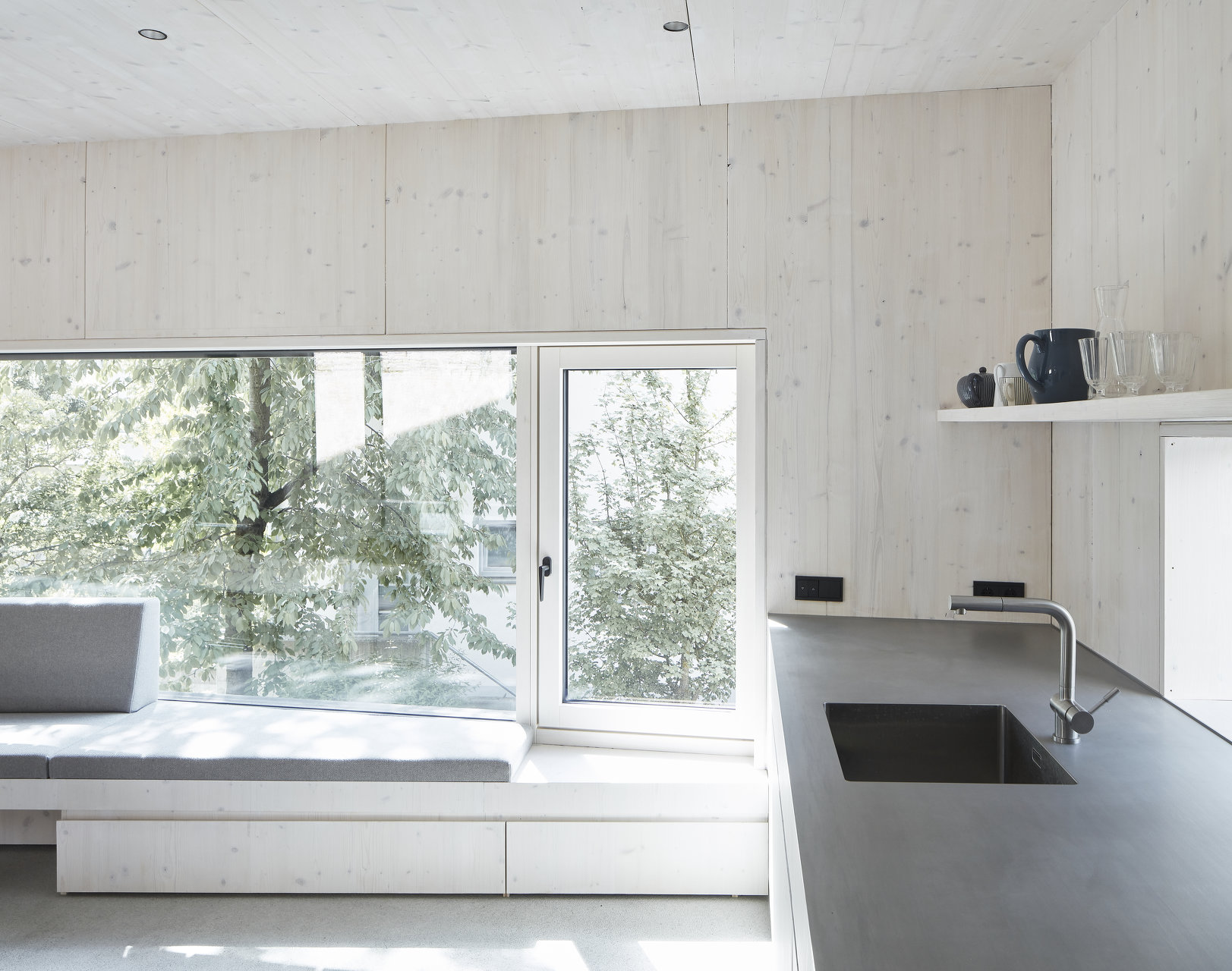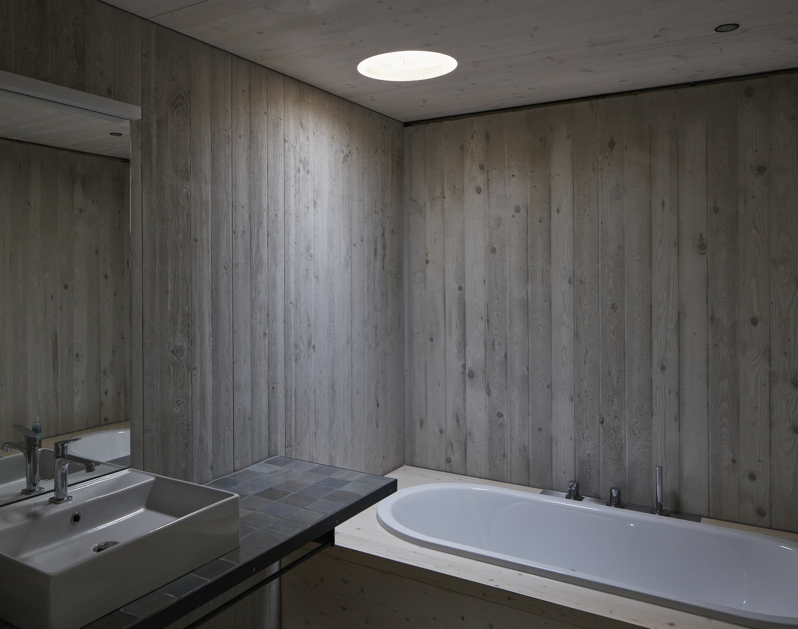 Die Konstruktion in Massivholz und Beton wurde mit Sichtoberflächen belassen, es gilt der Grundsatz: Es ist, was es ist.
