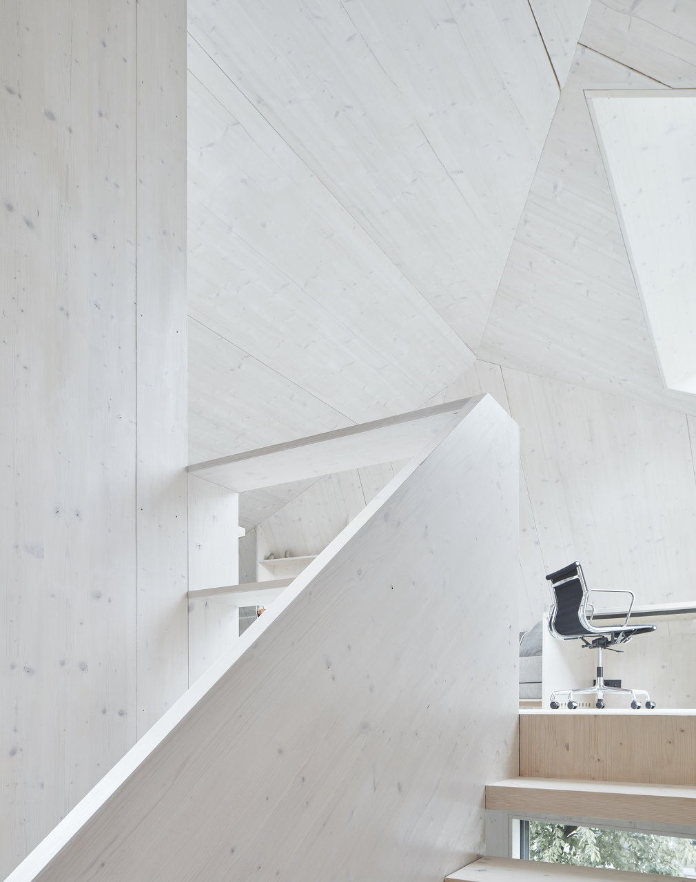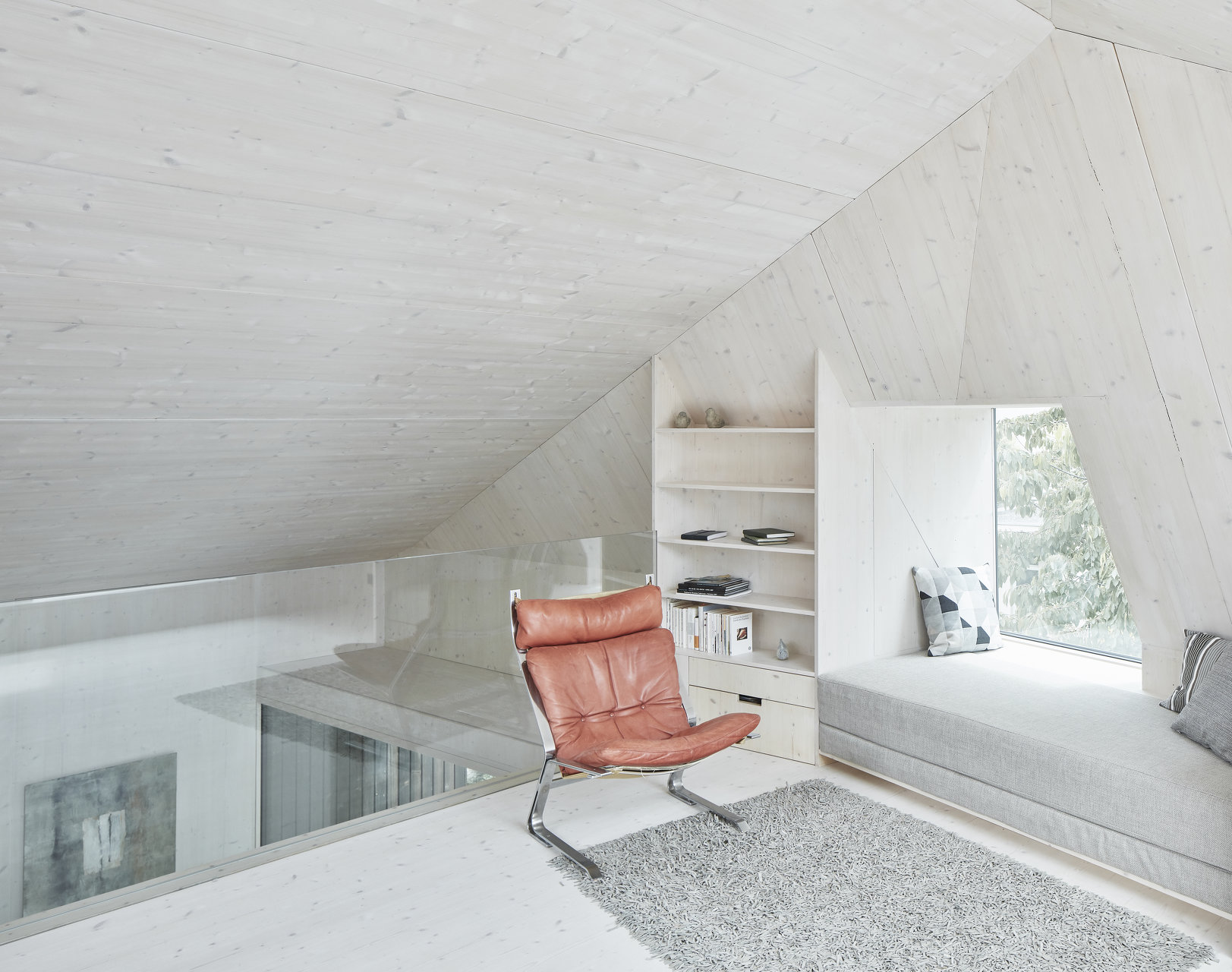 Im Eingangsgeschoss befinden sich jeweils Diele, Wirtschaftsraum, Schlafen, Schrankraum und Badezimmer. Die Holztreppen sind in beiden Häusern als benutzbare Oberflächen in Form von Regalen gebaut. Das erste Obergeschoss ist ein offener, teilweiser zweigeschossiger Wohnraum mit Glasfront, Loggia und grossem Sitzfenster für den Blick in den Garten. Die Galerien im Dachgeschoss sind zum Wohnraum offene Arbeits- und Chillbereiche. Einschnitte im Dach bilden kleine Terrassen aus.