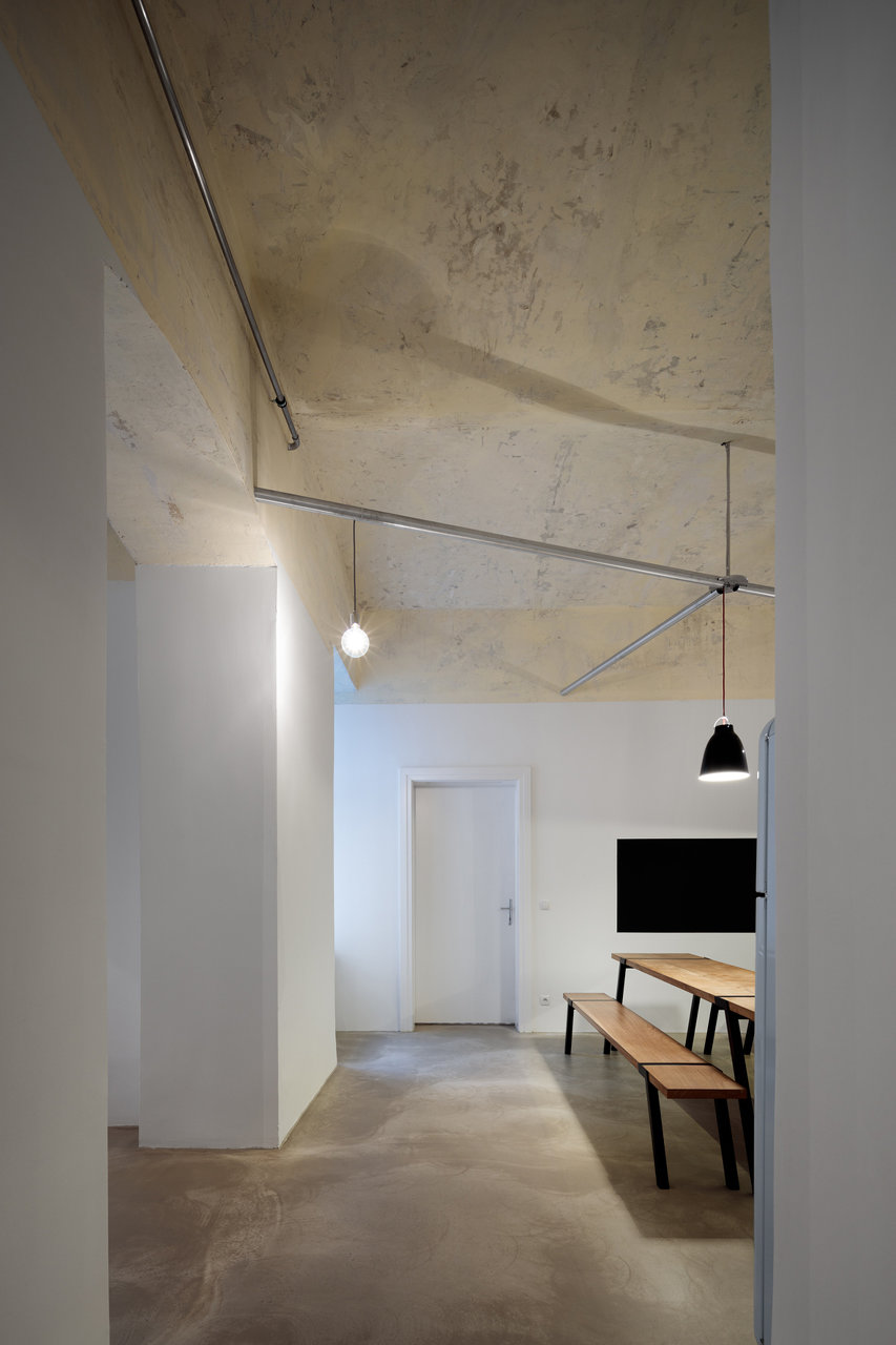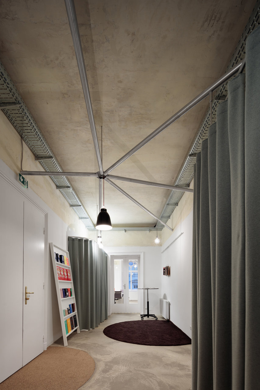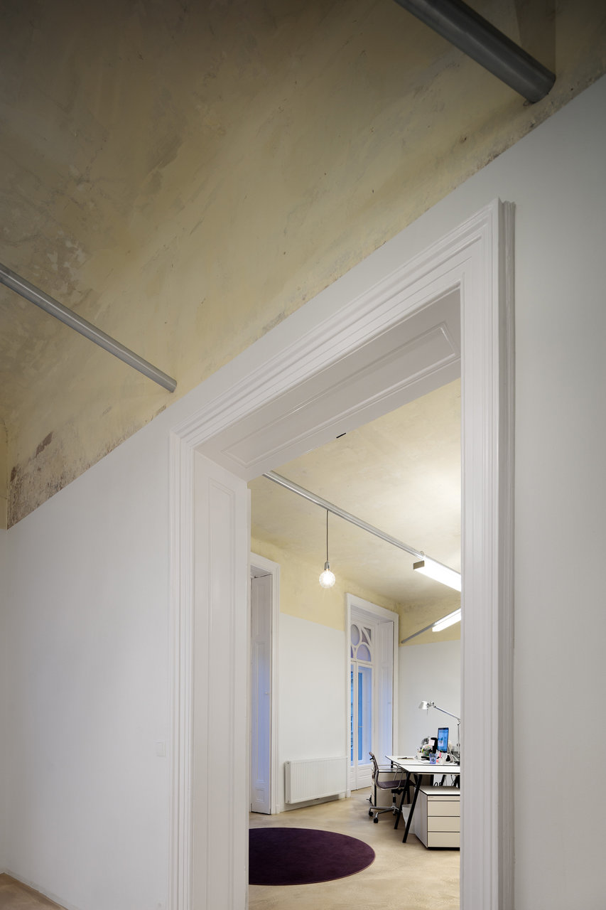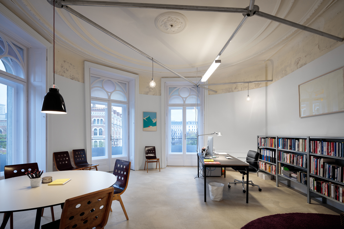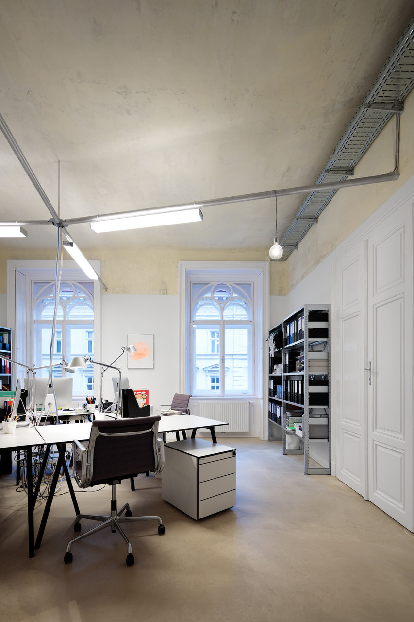 Alte Farbschichten an der Decke kontrastieren mit weisser Wandfarbe, Doppelflügeltüren und Fensterläden aus der Gründerzeit mit Industrieböden, Vintagemöbel mit Industrieregalen, hochwertige Arbeitplatzbeleuchtung mit heimeligen Glühbirnen. Das Ausbrechen aus vorgefundenen Strukturen und das Aufzeigen von grenzüberschreitenden Lösungsvorschlägen beschreibt die Arbeitsmethodik und diesen Geist zeigt auch das Büro. (Text: Architekt:innen)