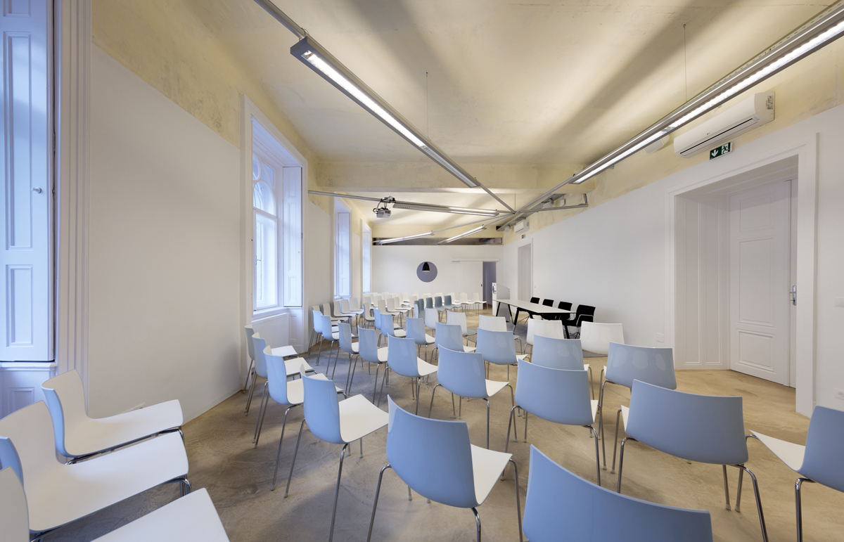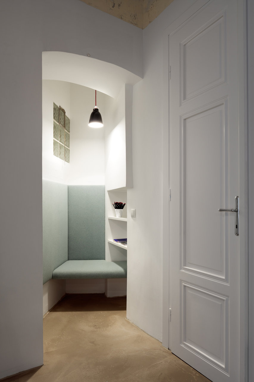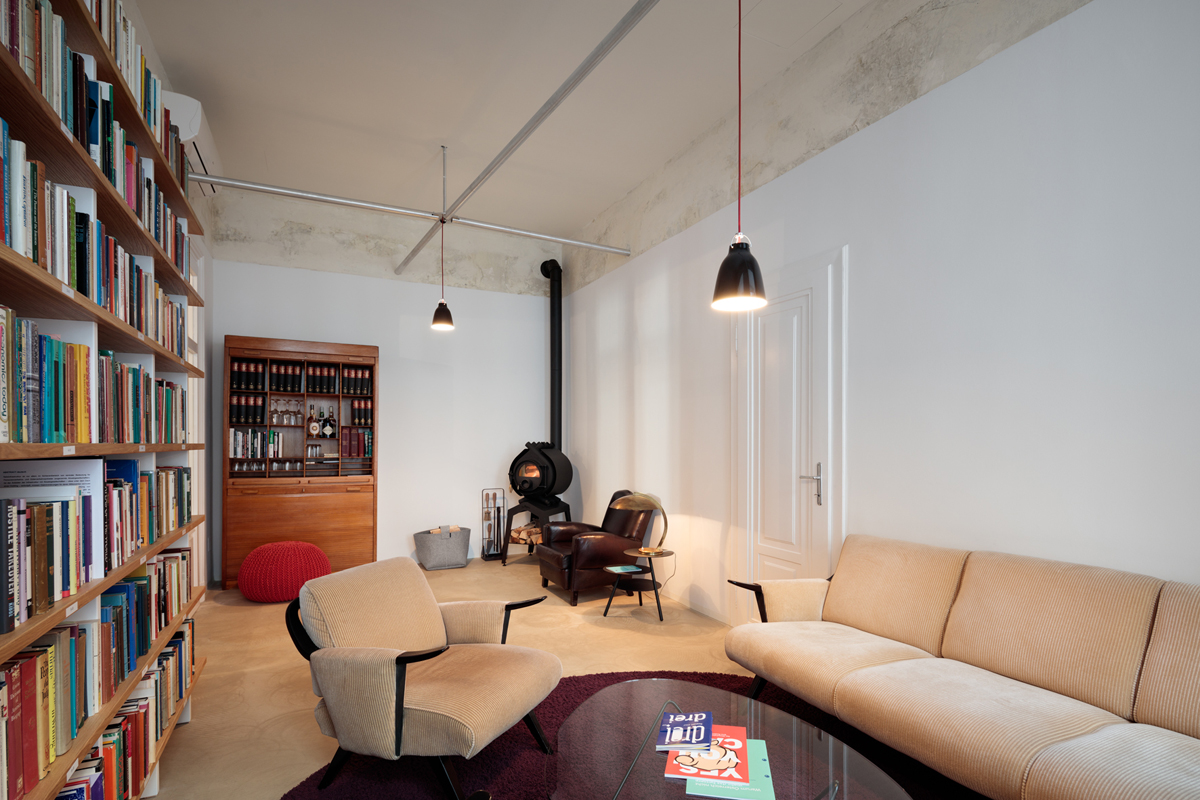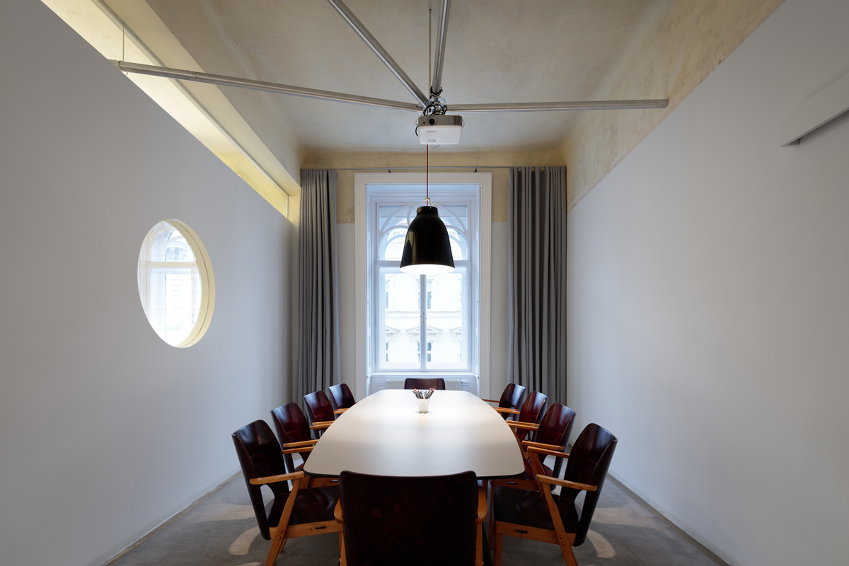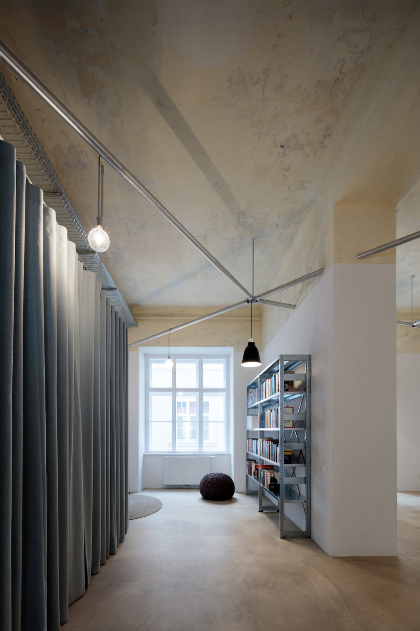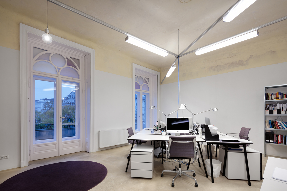 Alte Farbschichten an der Decke kontrastieren mit weisser Wandfarbe, Doppelflügeltüren und Fensterläden aus der Gründerzeit mit Industrieböden, Vintagemöbel mit Industrieregalen, hochwertige Arbeitplatzbeleuchtung mit heimeligen Glühbirnen. Das Ausbrechen aus vorgefundenen Strukturen und das Aufzeigen von grenzüberschreitenden Lösungsvorschlägen beschreibt die Arbeitsmethodik und diesen Geist zeigt auch das Büro. (Text: Architekt:innen)