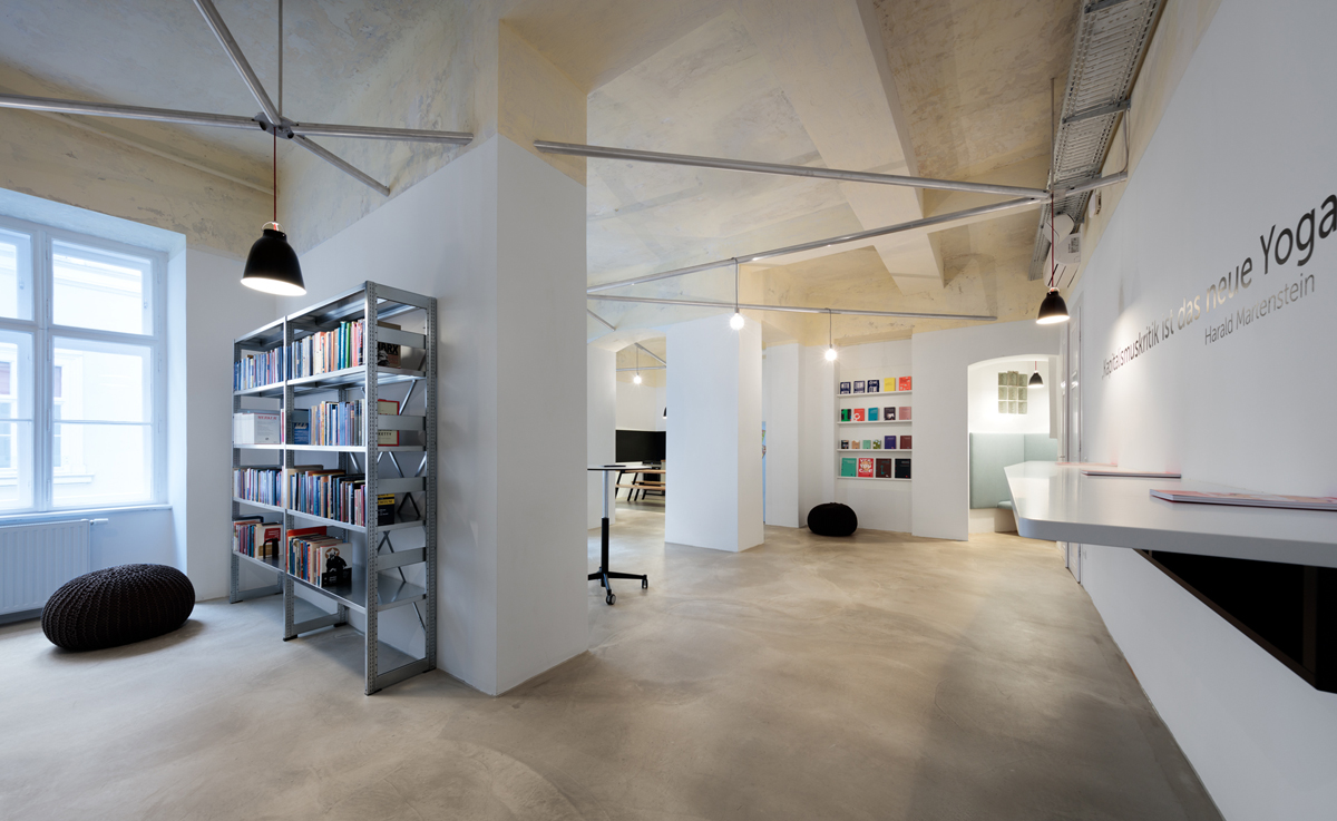 Die Arbeitsbereiche befinden sich in den nicht frequentierten Zonen, die sich ergeben, wenn man das Büro durchquert, sind inselartig und lassen sowohl konzentriertes Arbeiten in Kleingruppen als auch Besprechungen, Rückzugsmöglichkeiten und informellen Austausch zu. Gegendenken ist dem think-tank wichtig und das wird auch durch die Bürogestaltung veranschaulicht, die mit Gegensätzen spielt.