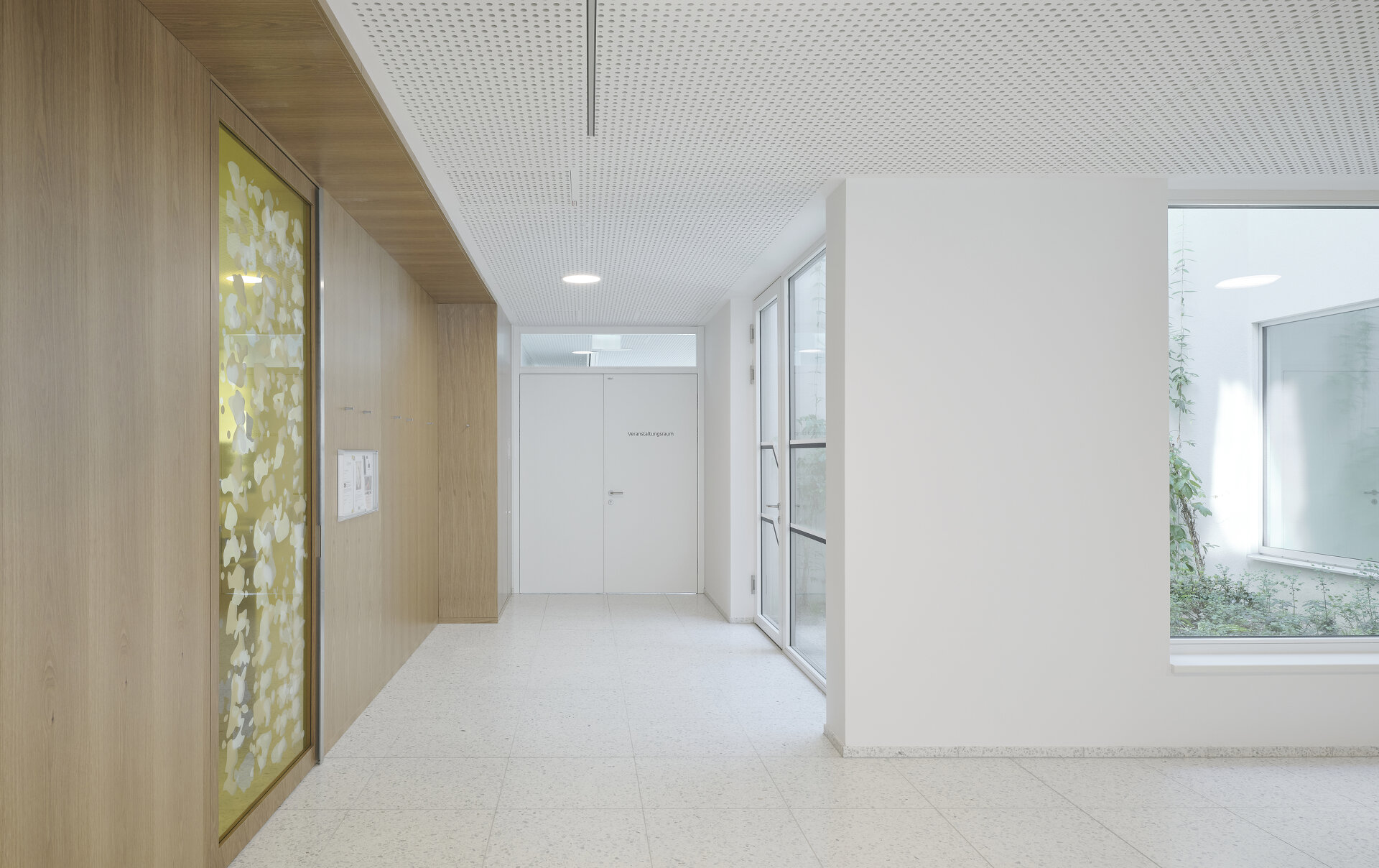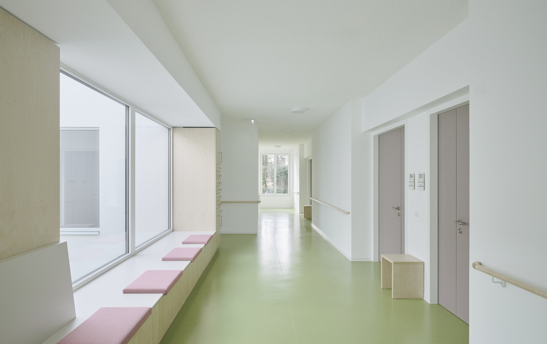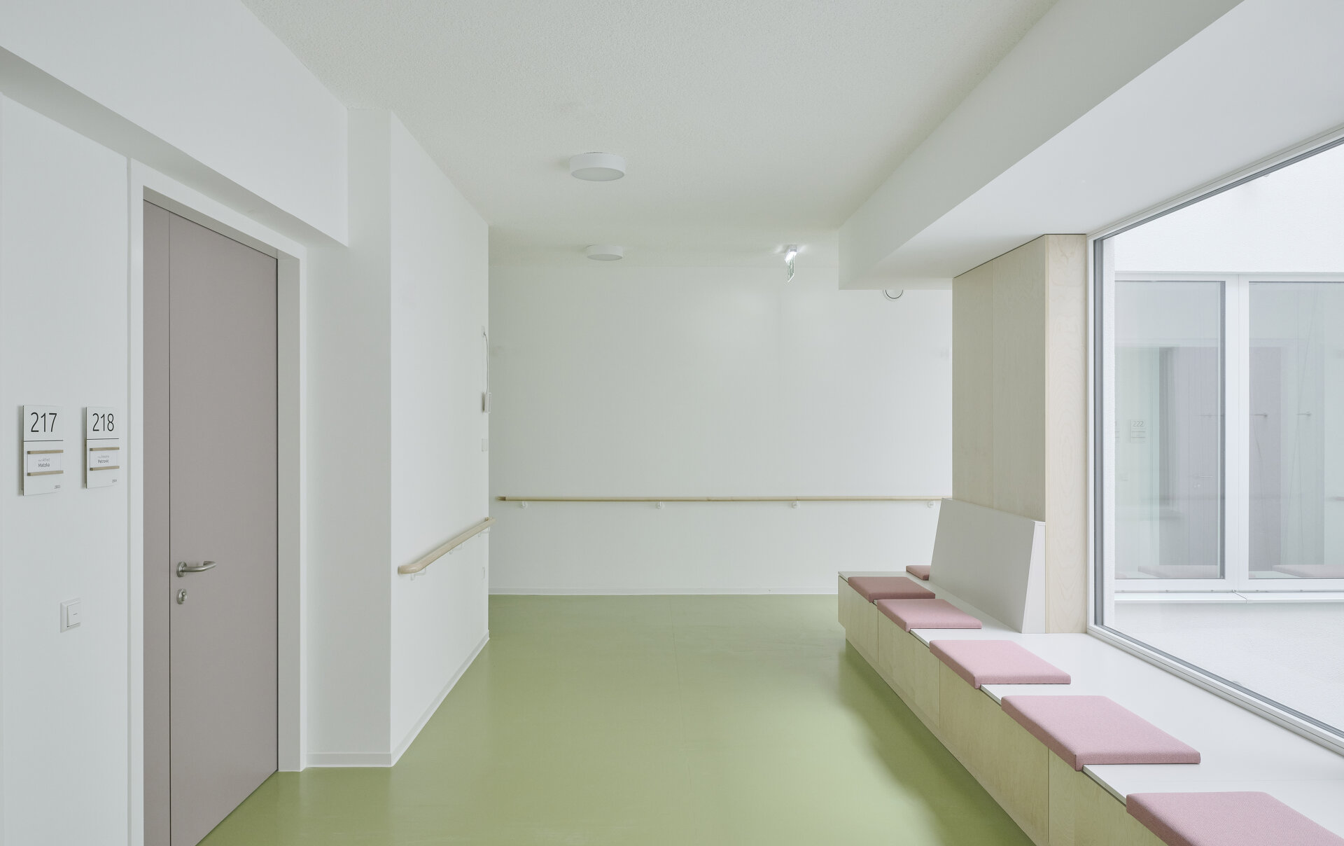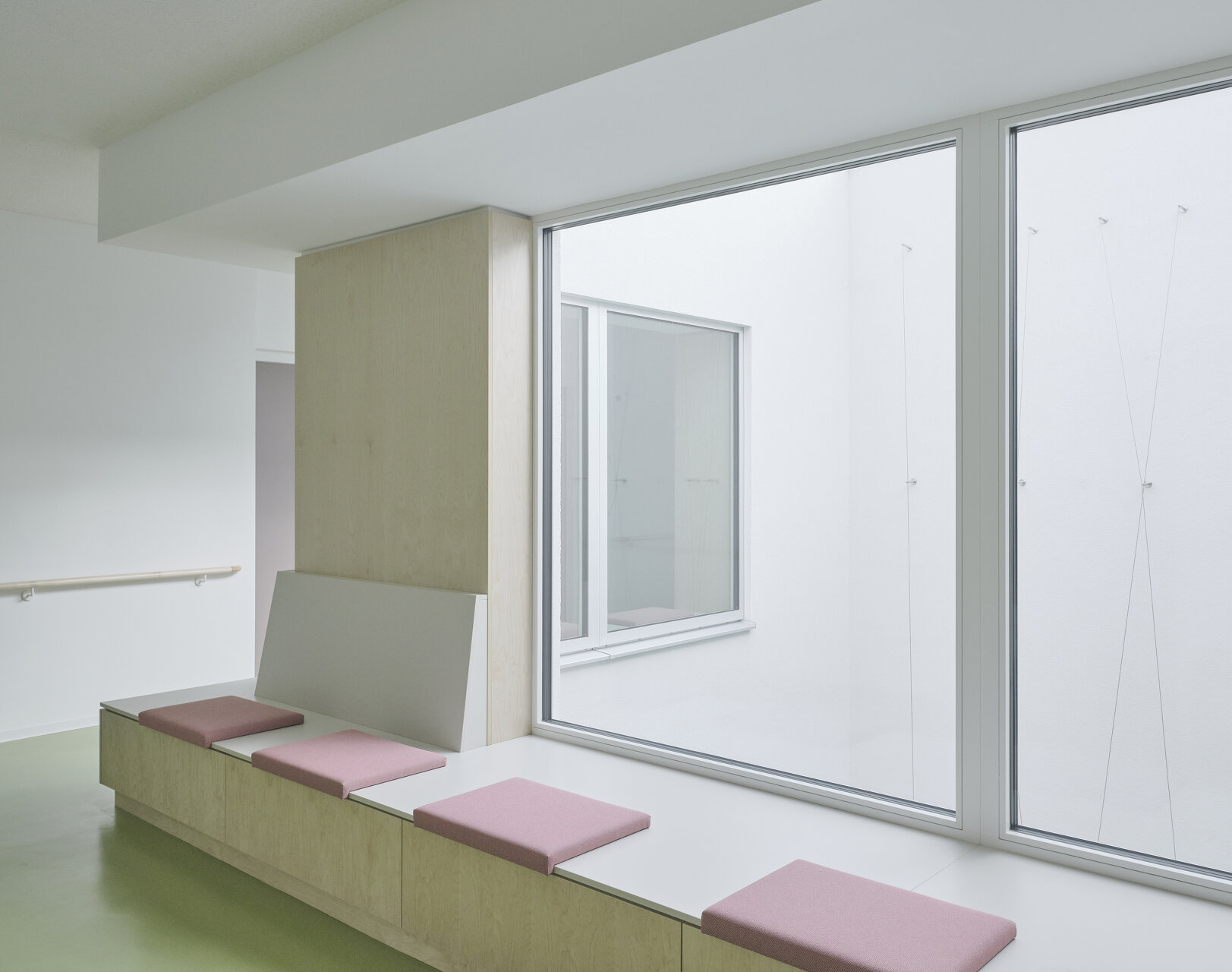 Um einen zentralen Wohnbereich ordnen sich radial die Individualzimmer. Die Nutzungen überlagern sich und es entsteht eine familiäre Atmosphäre. Die großzügige Küche bildet das Herz der jeweiligen Gruppe, bewachsene Patios gliedern den Baukörper. Die Zimmer bieten Rückzugsmöglichkeit mit Bezug zum Außenraum, Tiefe Fensternischen mit Leibungs-Sitzmöbel in Erschließungszonen Aufenthaltsqualität.