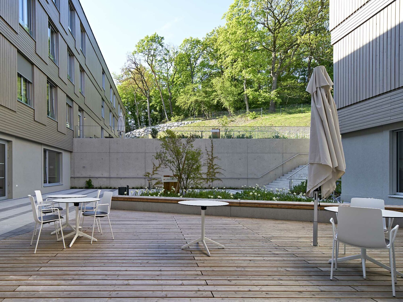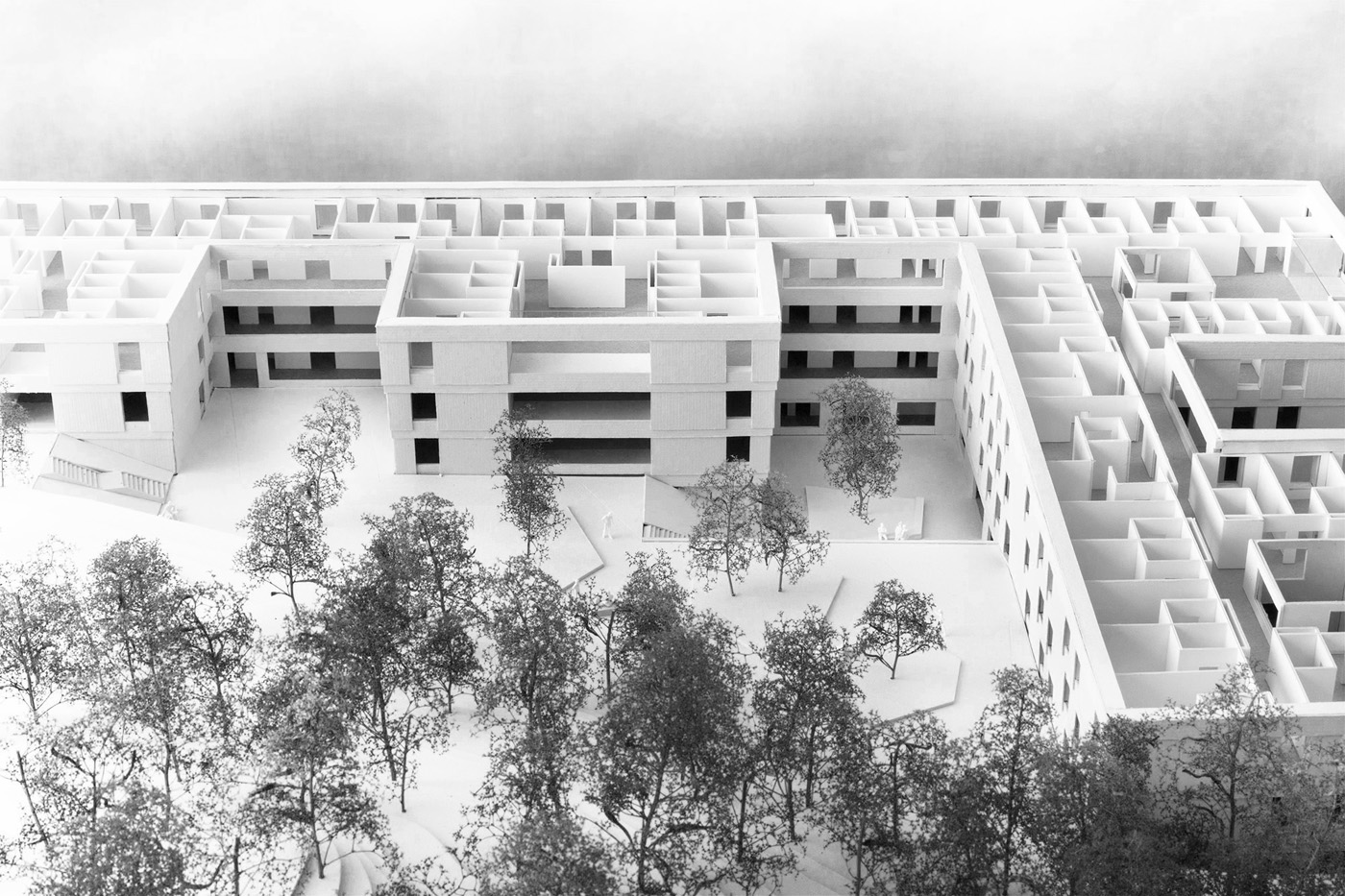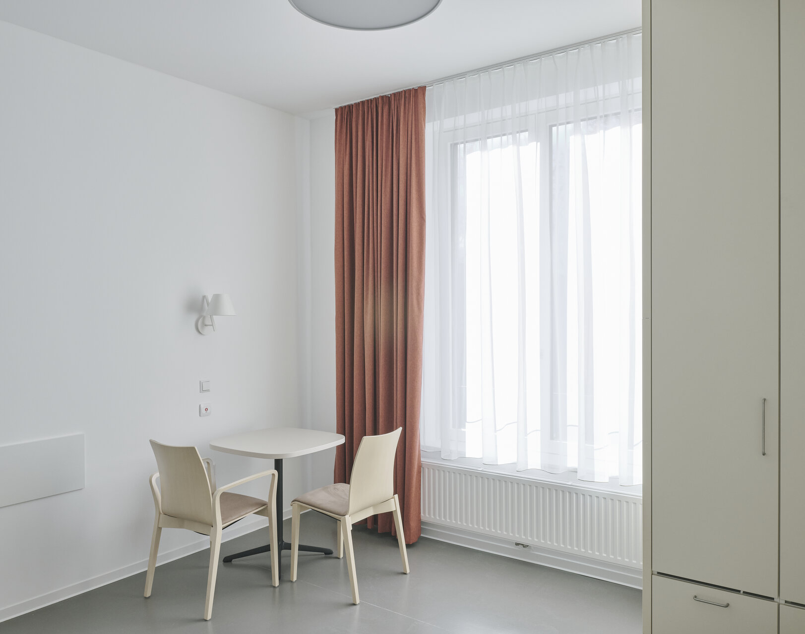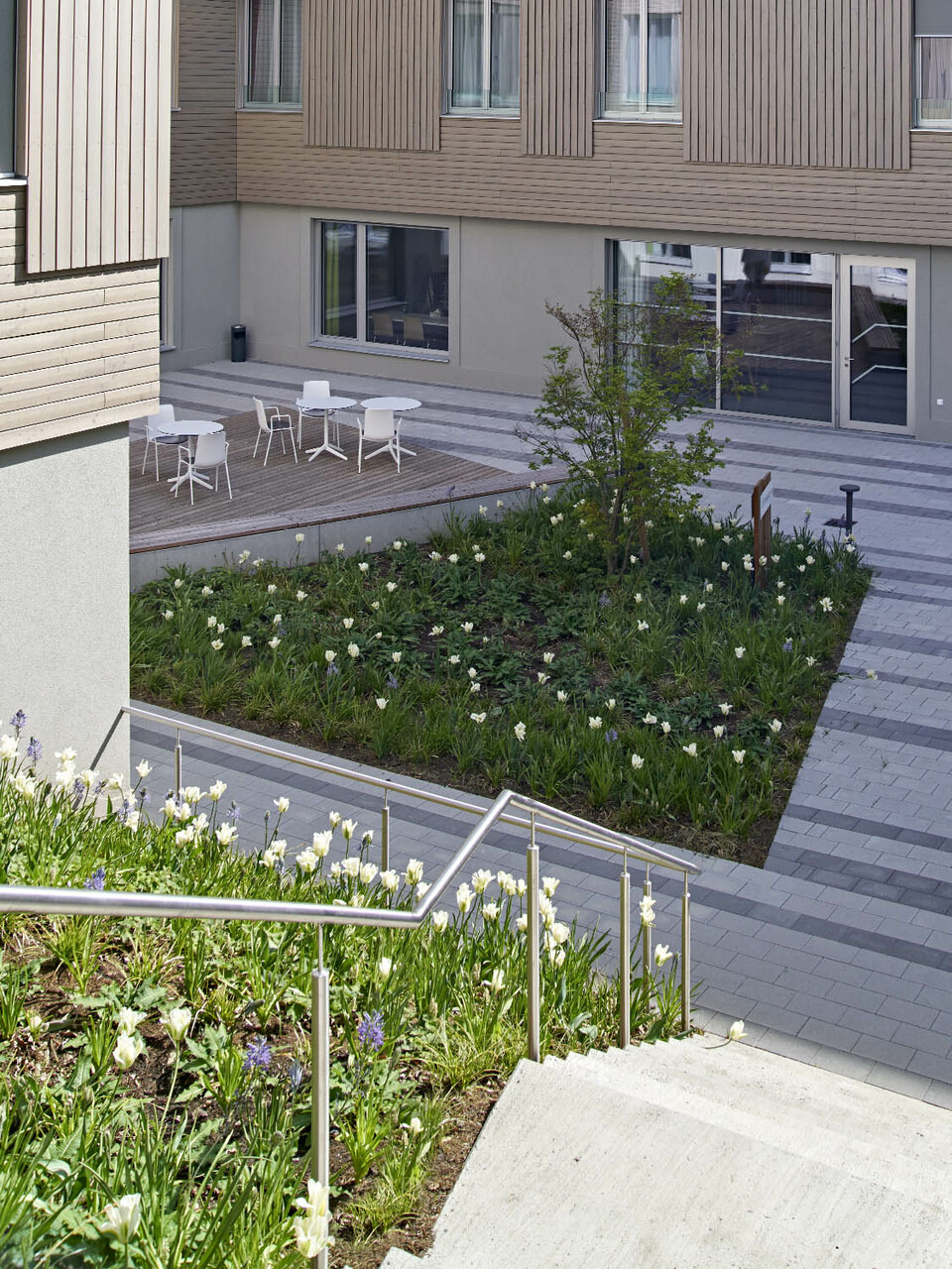 Um einen zentralen Wohnbereich ordnen sich radial die Individualzimmer. Die Nutzungen überlagern sich und es entsteht eine familiäre Atmosphäre. Die großzügige Küche bildet das Herz der jeweiligen Gruppe, bewachsene Patios gliedern den Baukörper. Die Zimmer bieten Rückzugsmöglichkeit mit Bezug zum Außenraum, Tiefe Fensternischen mit Leibungs-Sitzmöbel in Erschließungszonen Aufenthaltsqualität.