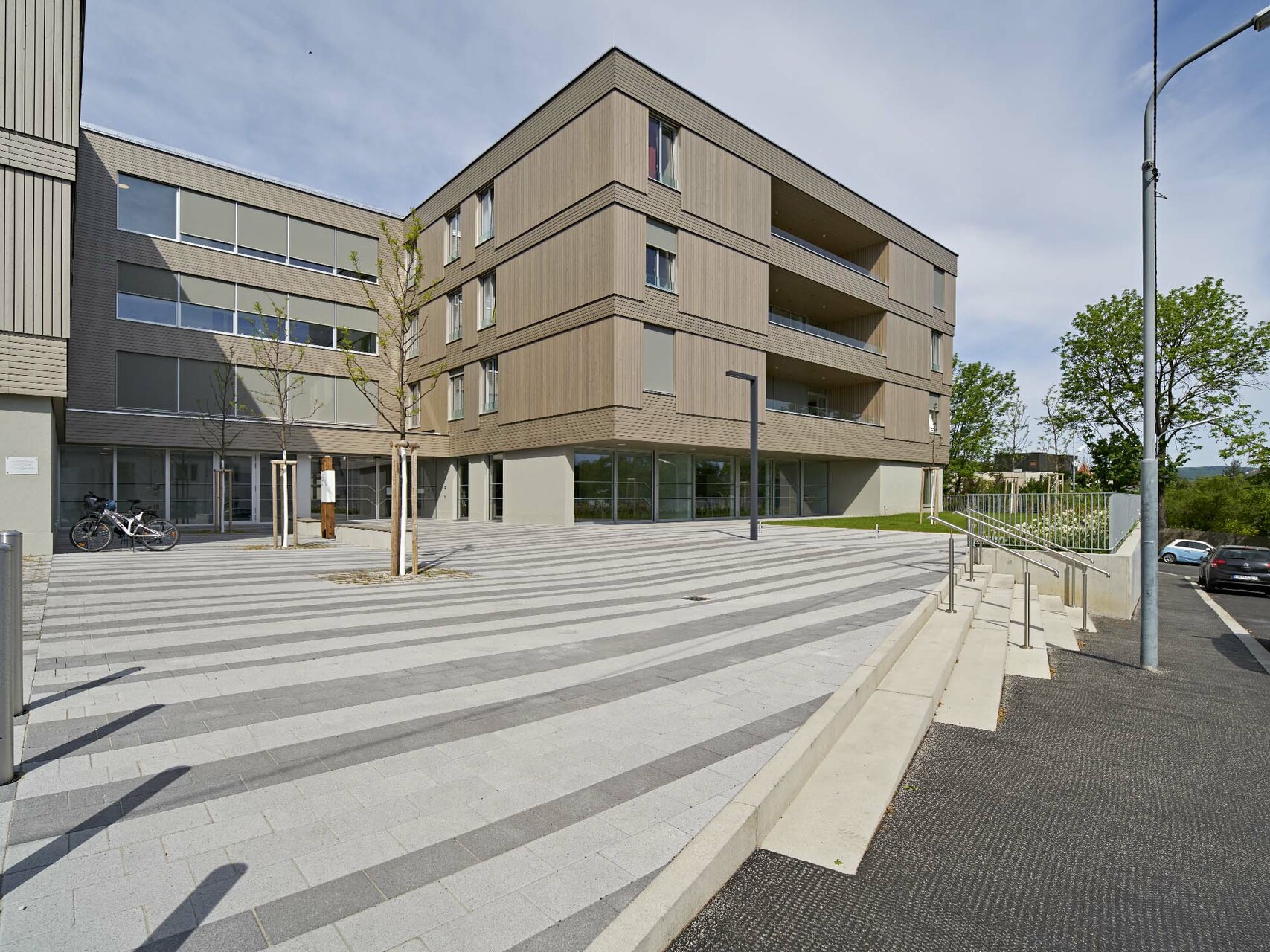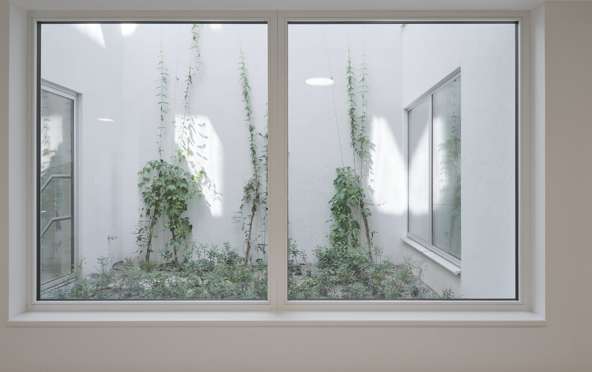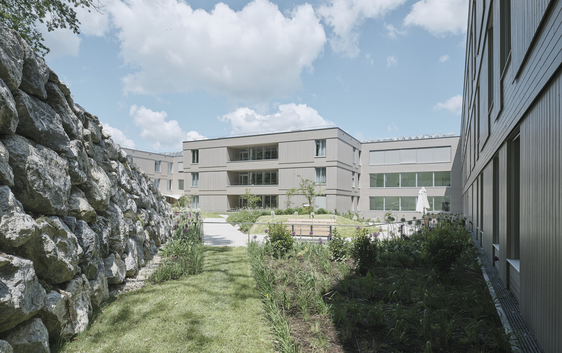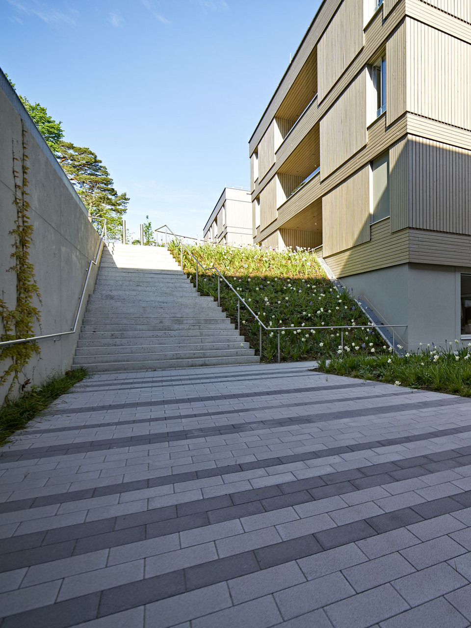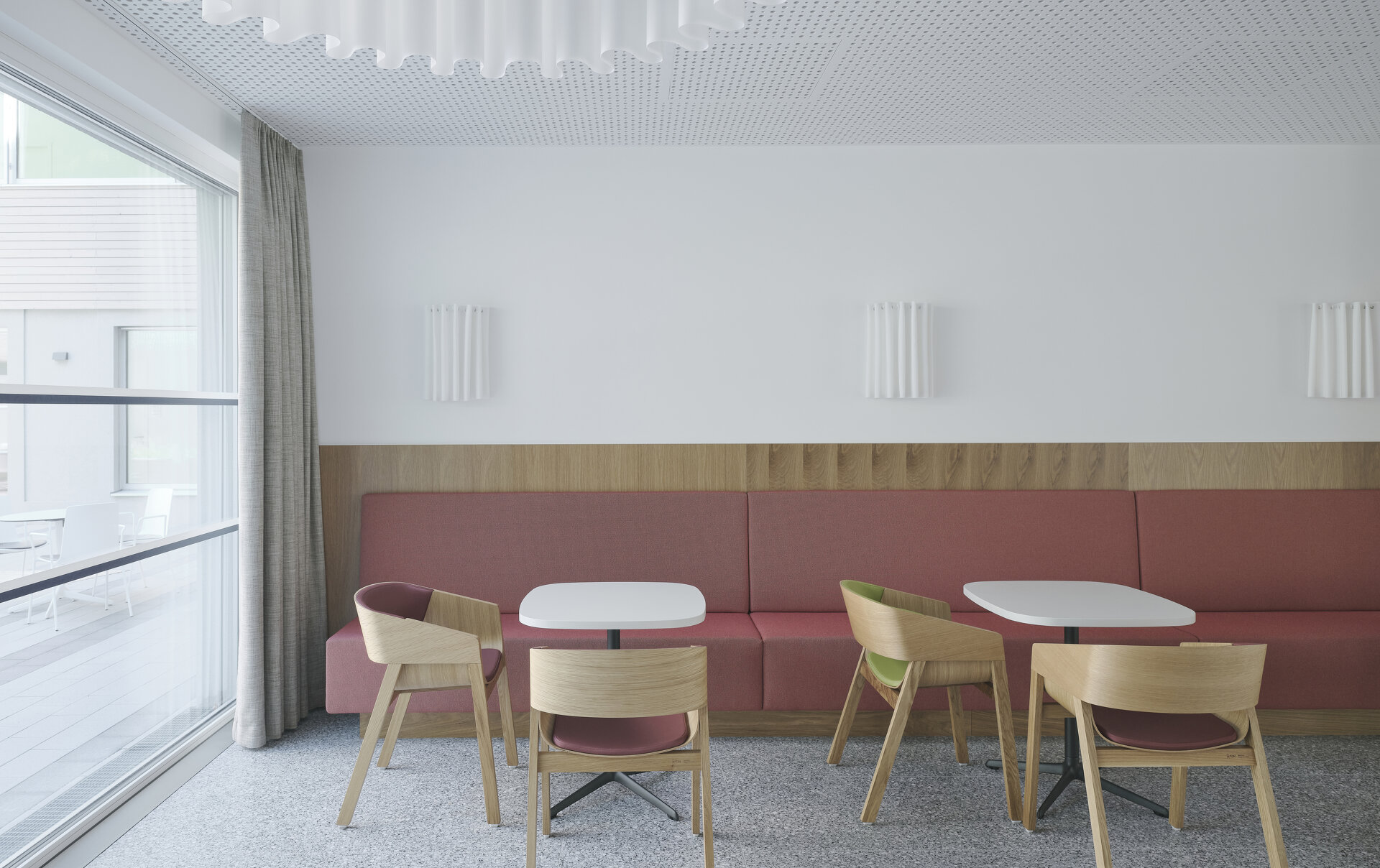 Um einen zentralen Wohnbereich ordnen sich radial die Individualzimmer. Die Nutzungen überlagern sich und es entsteht eine familiäre Atmosphäre. Die großzügige Küche bildet das Herz der jeweiligen Gruppe, bewachsene Patios gliedern den Baukörper. Die Zimmer bieten Rückzugsmöglichkeit mit Bezug zum Außenraum, Tiefe Fensternischen mit Leibungs-Sitzmöbel in Erschließungszonen Aufenthaltsqualität.