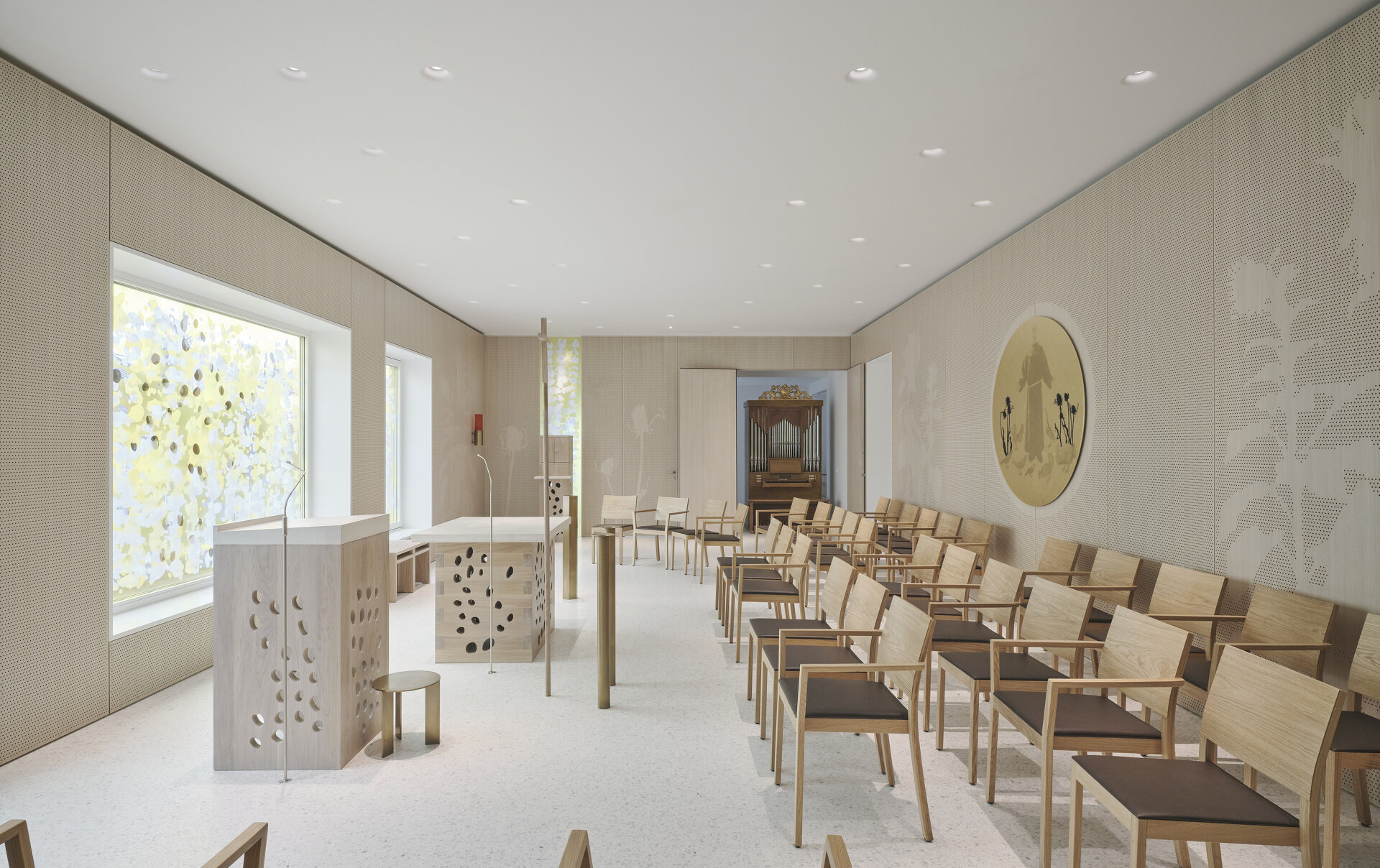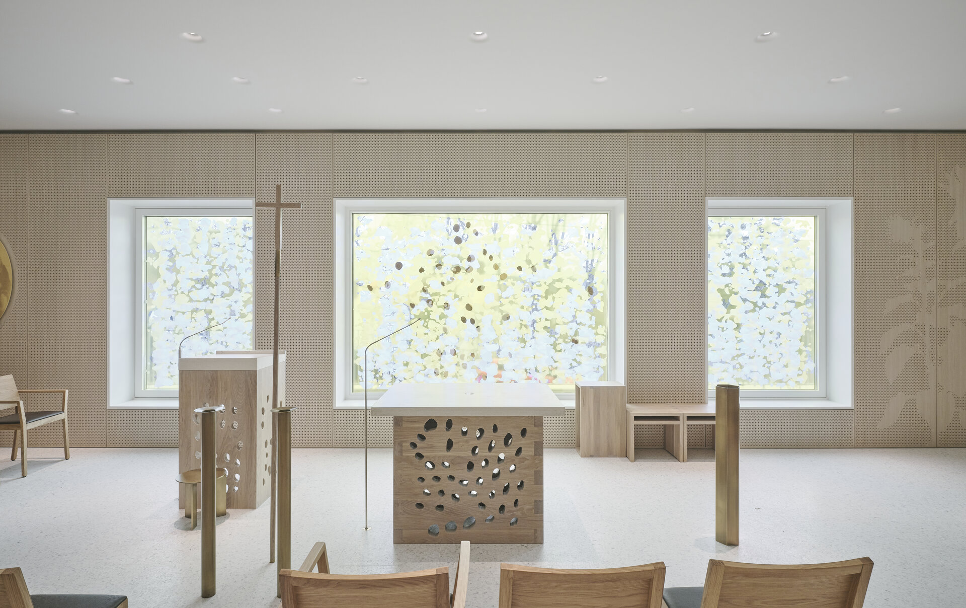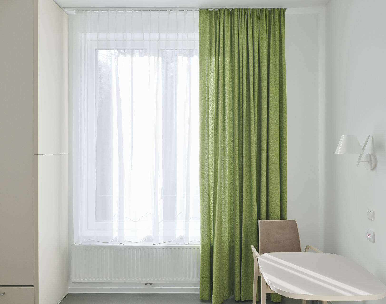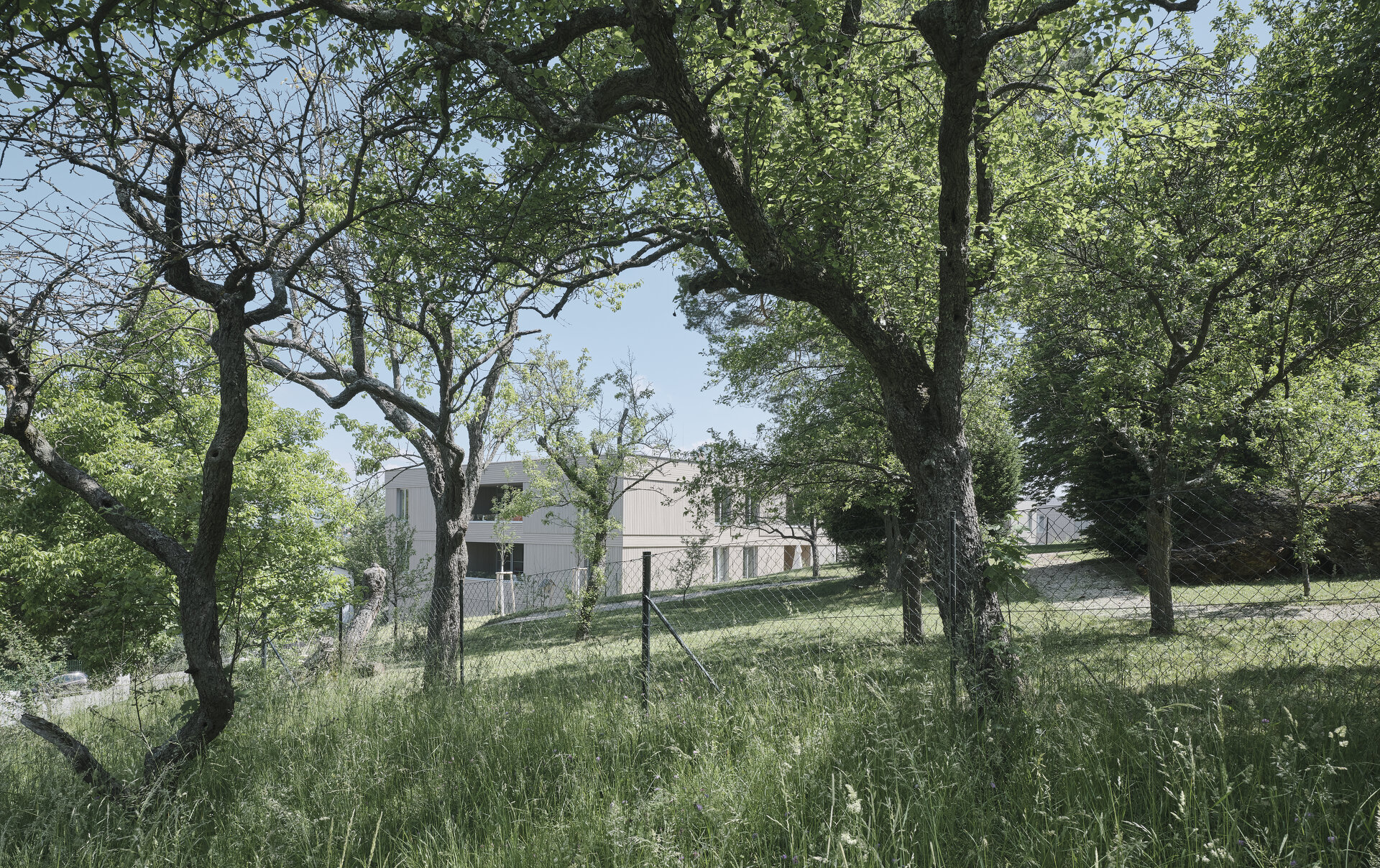 Um einen zentralen Wohnbereich ordnen sich radial die Individualzimmer. Die Nutzungen überlagern sich und es entsteht eine familiäre Atmosphäre. Die großzügige Küche bildet das Herz der jeweiligen Gruppe, bewachsene Patios gliedern den Baukörper. Die Zimmer bieten Rückzugsmöglichkeit mit Bezug zum Außenraum, Tiefe Fensternischen mit Leibungs-Sitzmöbel in Erschließungszonen Aufenthaltsqualität.