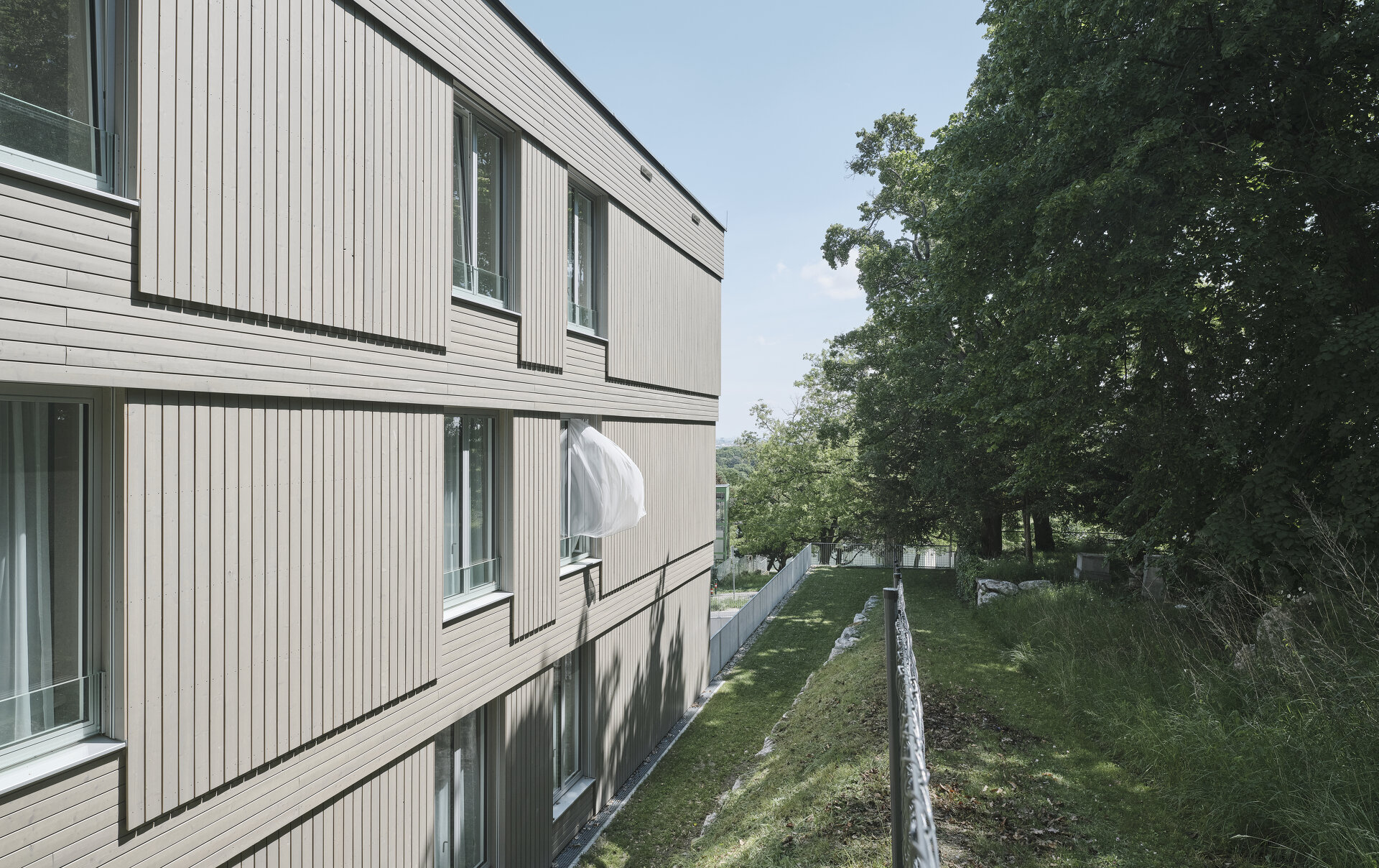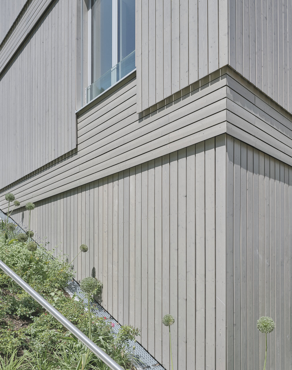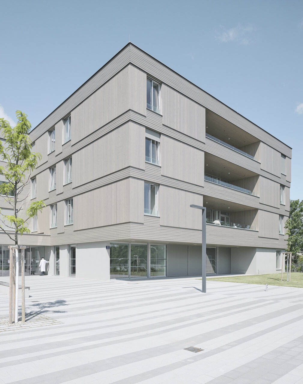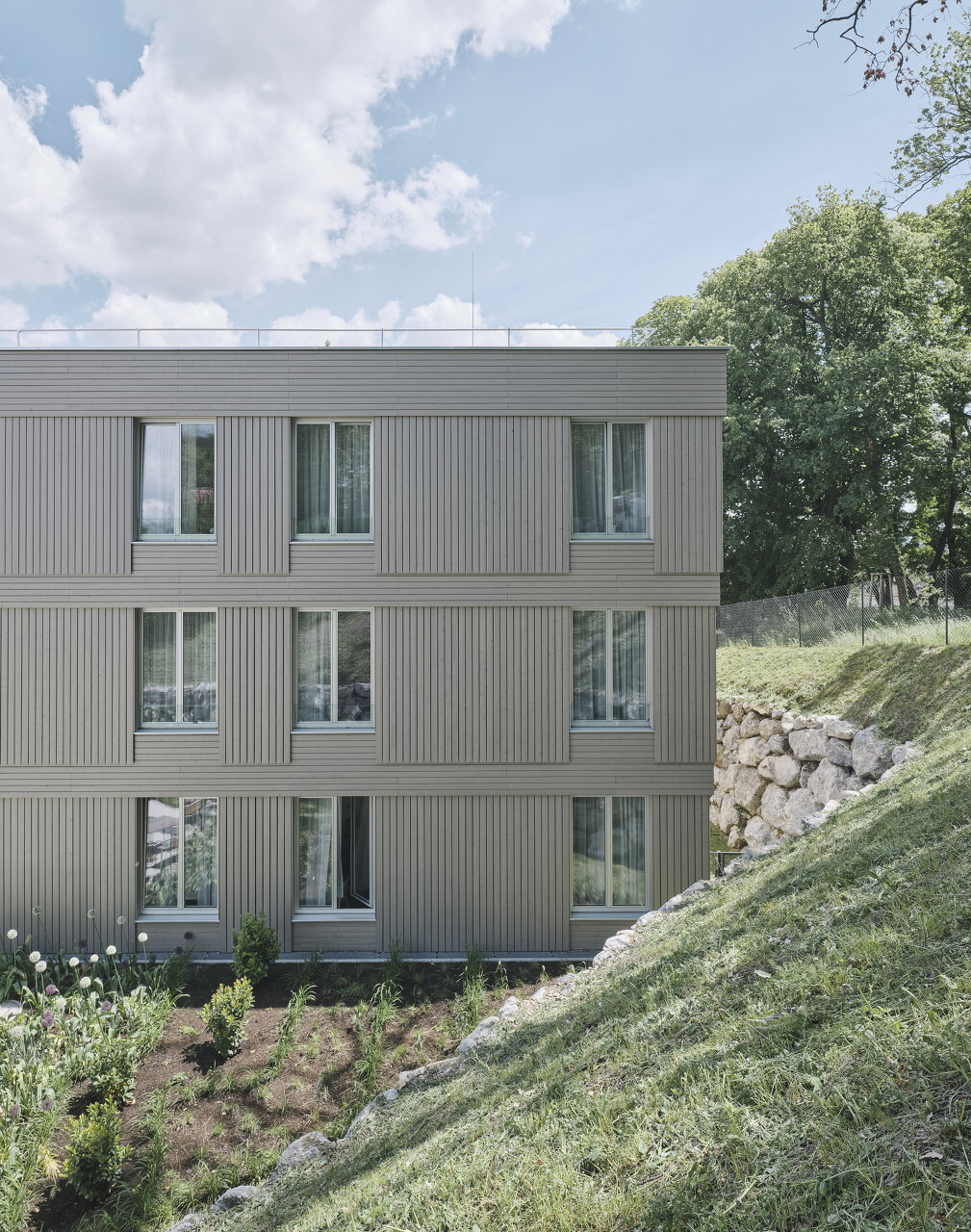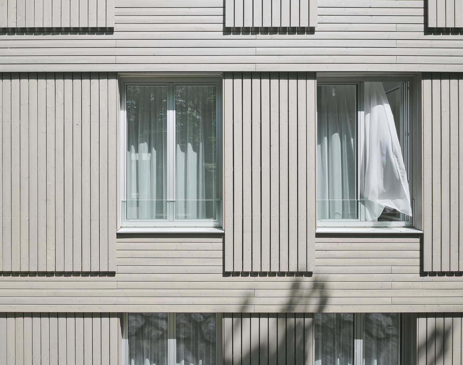 Die geschossweise gestaffelte Holzbaufassade webt die Fenster der Individualzimmer subtil in den Baukörper ein. Die Holzfarbe oszilliert zwischen Bronze und Silbergrau – ein Spiel aus horizontalen und vertikalen Stäben. (Text: Architekten, bearbeitet)