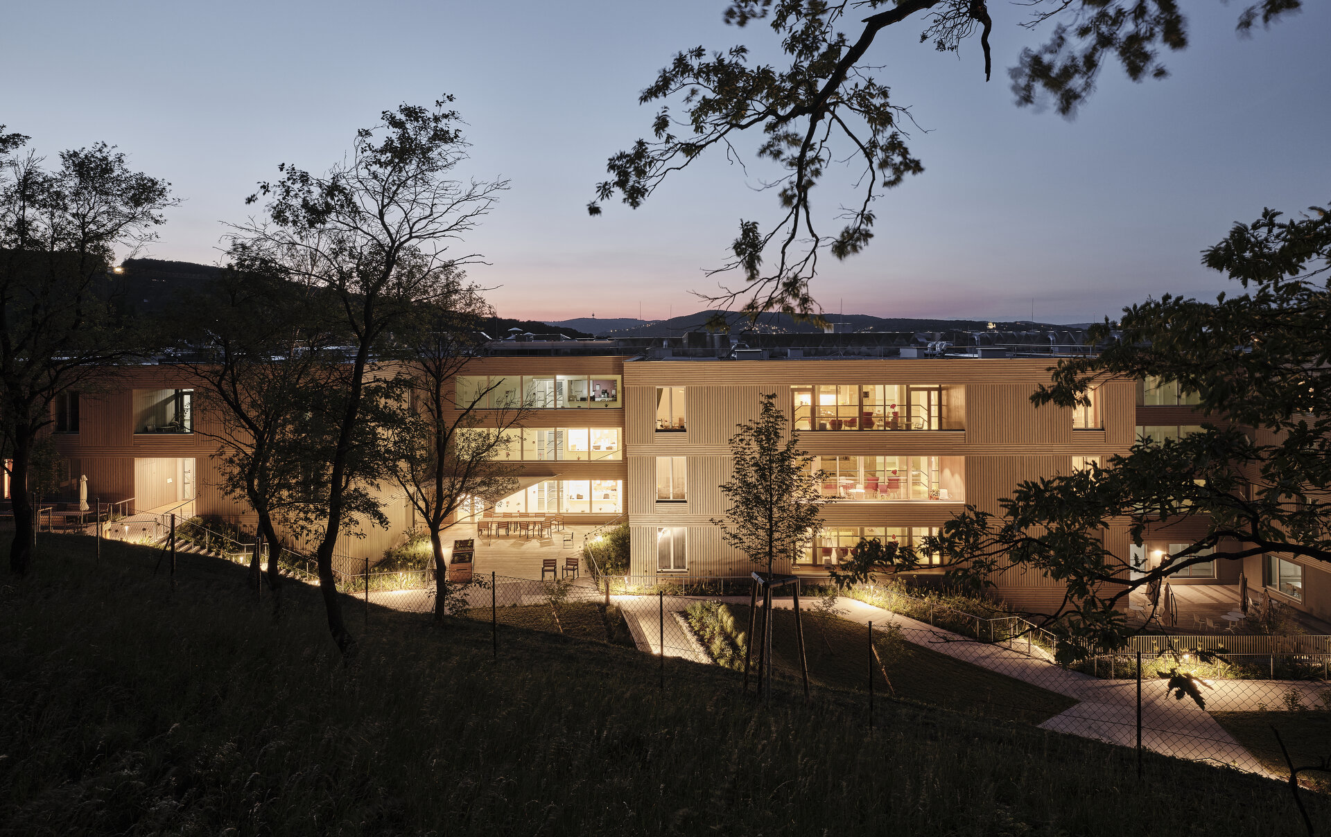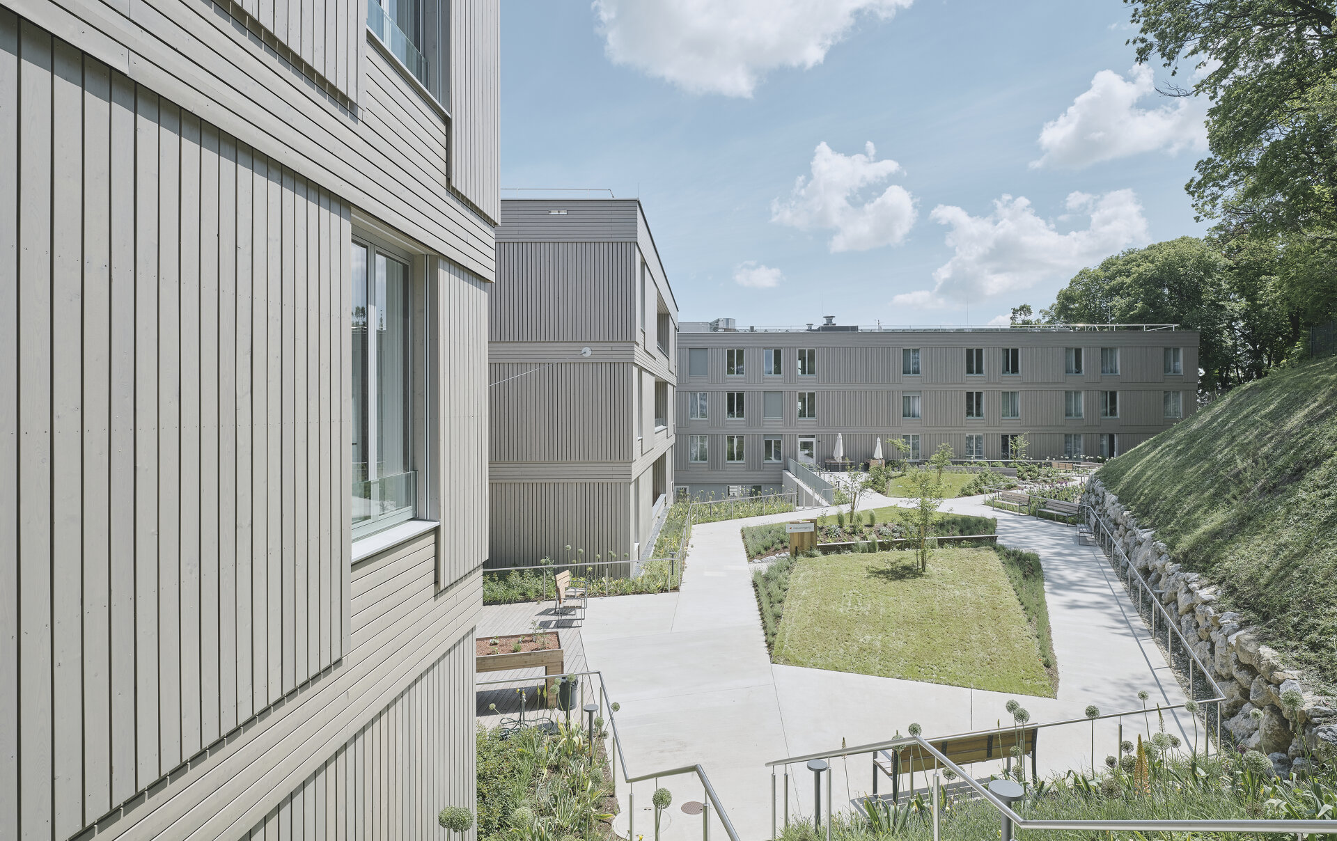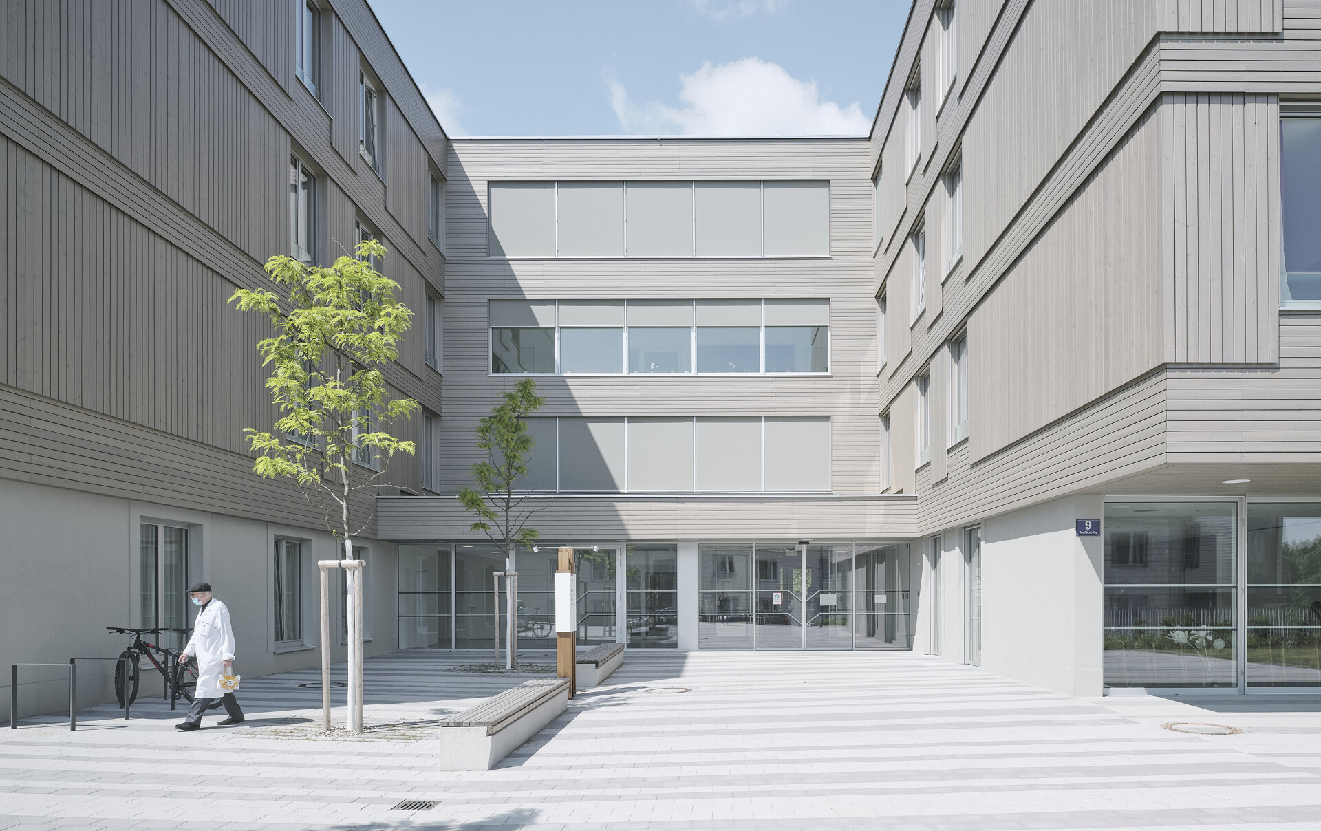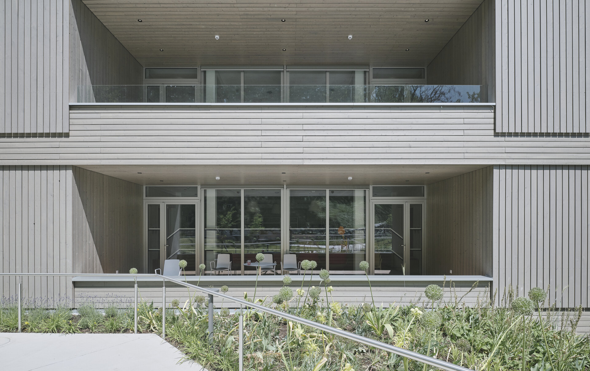 Die geschossweise gestaffelte Holzbaufassade webt die Fenster der Individualzimmer subtil in den Baukörper ein. Die Holzfarbe oszilliert zwischen Bronze und Silbergrau – ein Spiel aus horizontalen und vertikalen Stäben. (Text: Architekten, bearbeitet)
