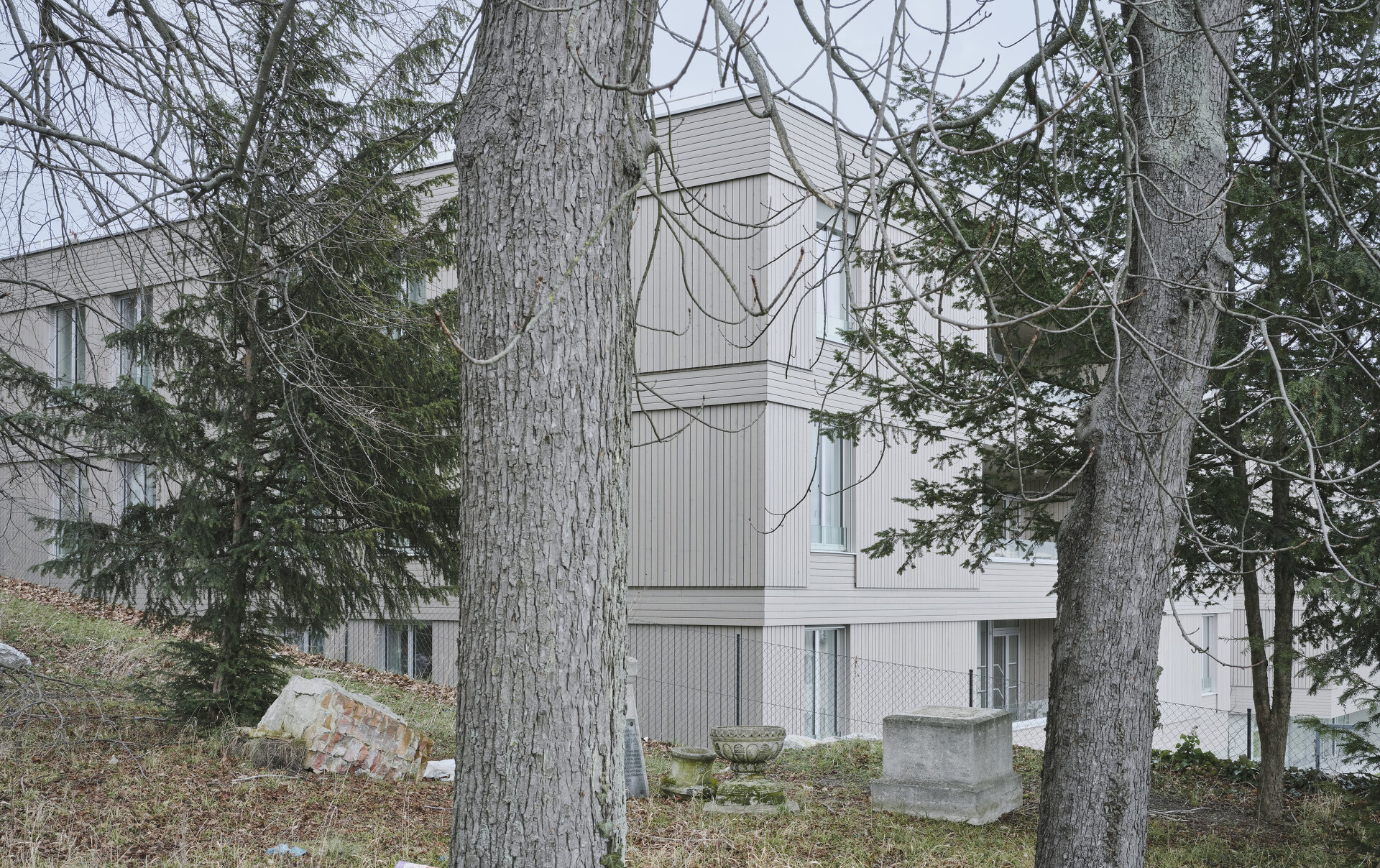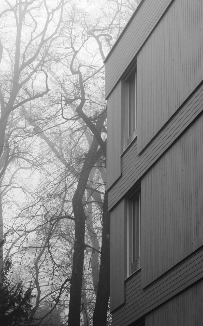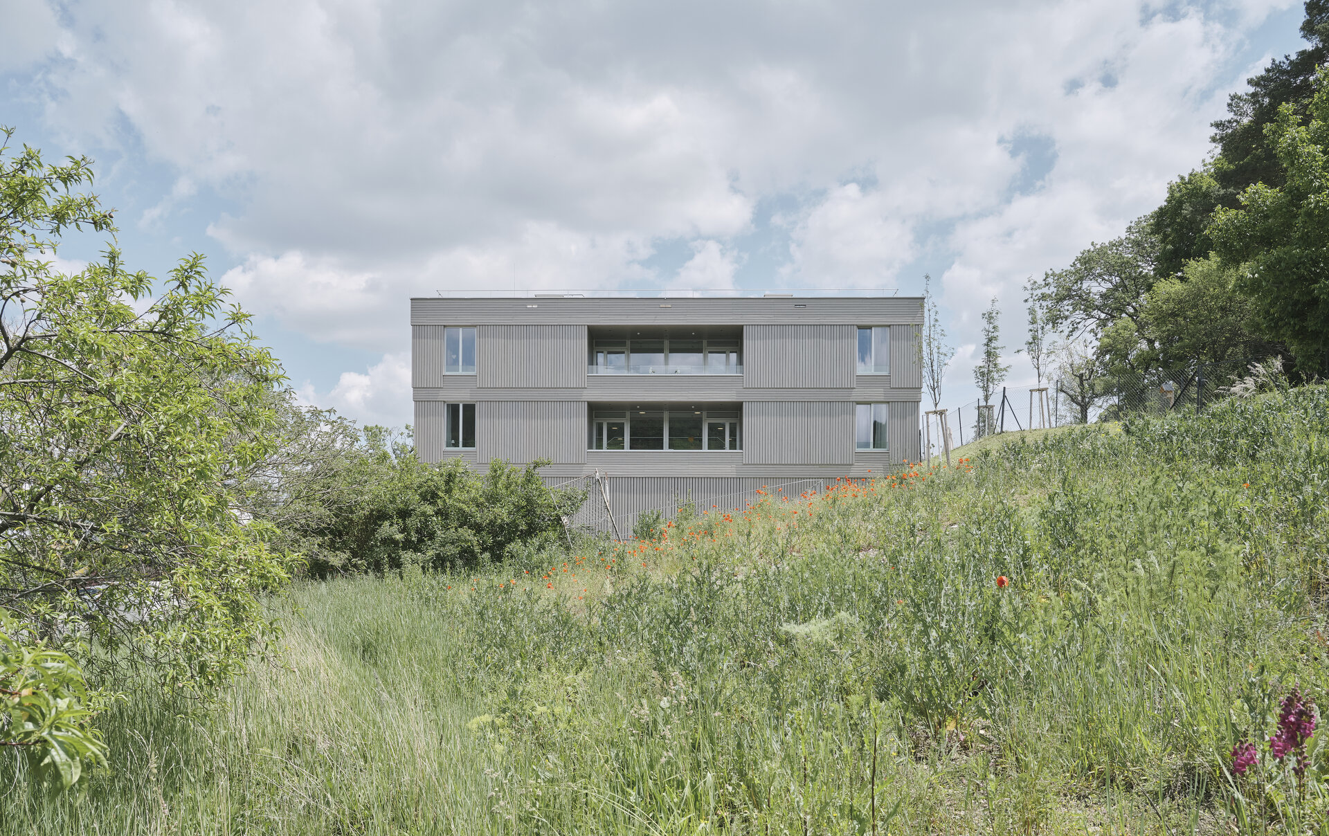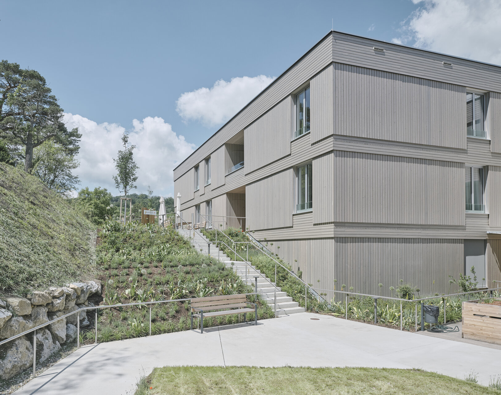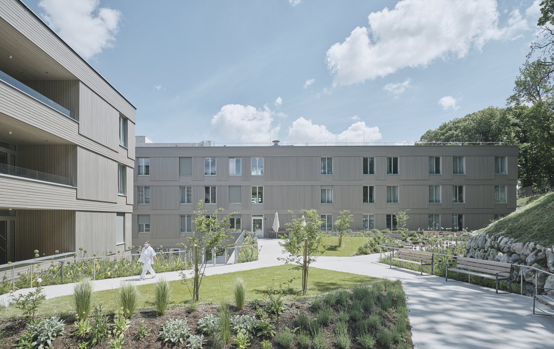 Die geschossweise gestaffelte Holzbaufassade webt die Fenster der Individualzimmer subtil in den Baukörper ein. Die Holzfarbe oszilliert zwischen Bronze und Silbergrau – ein Spiel aus horizontalen und vertikalen Stäben. (Text: Architekten, bearbeitet)