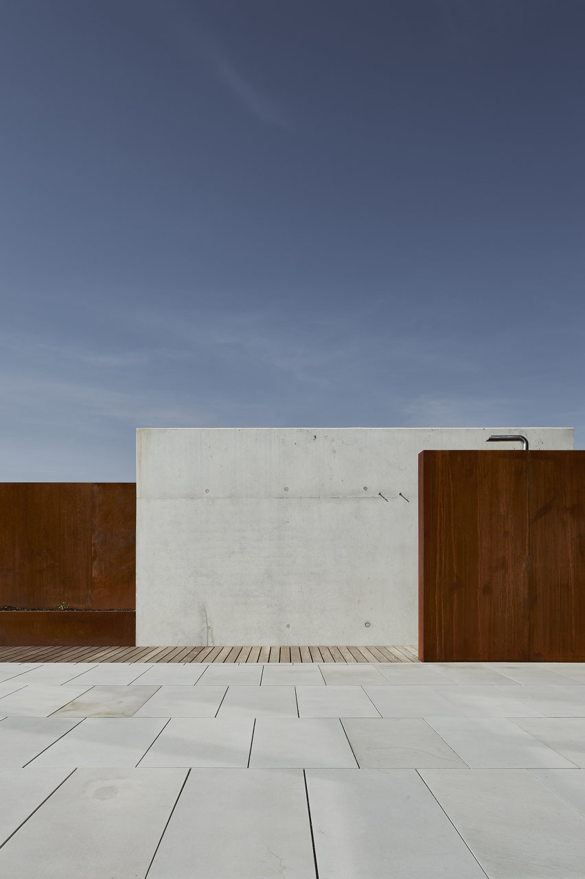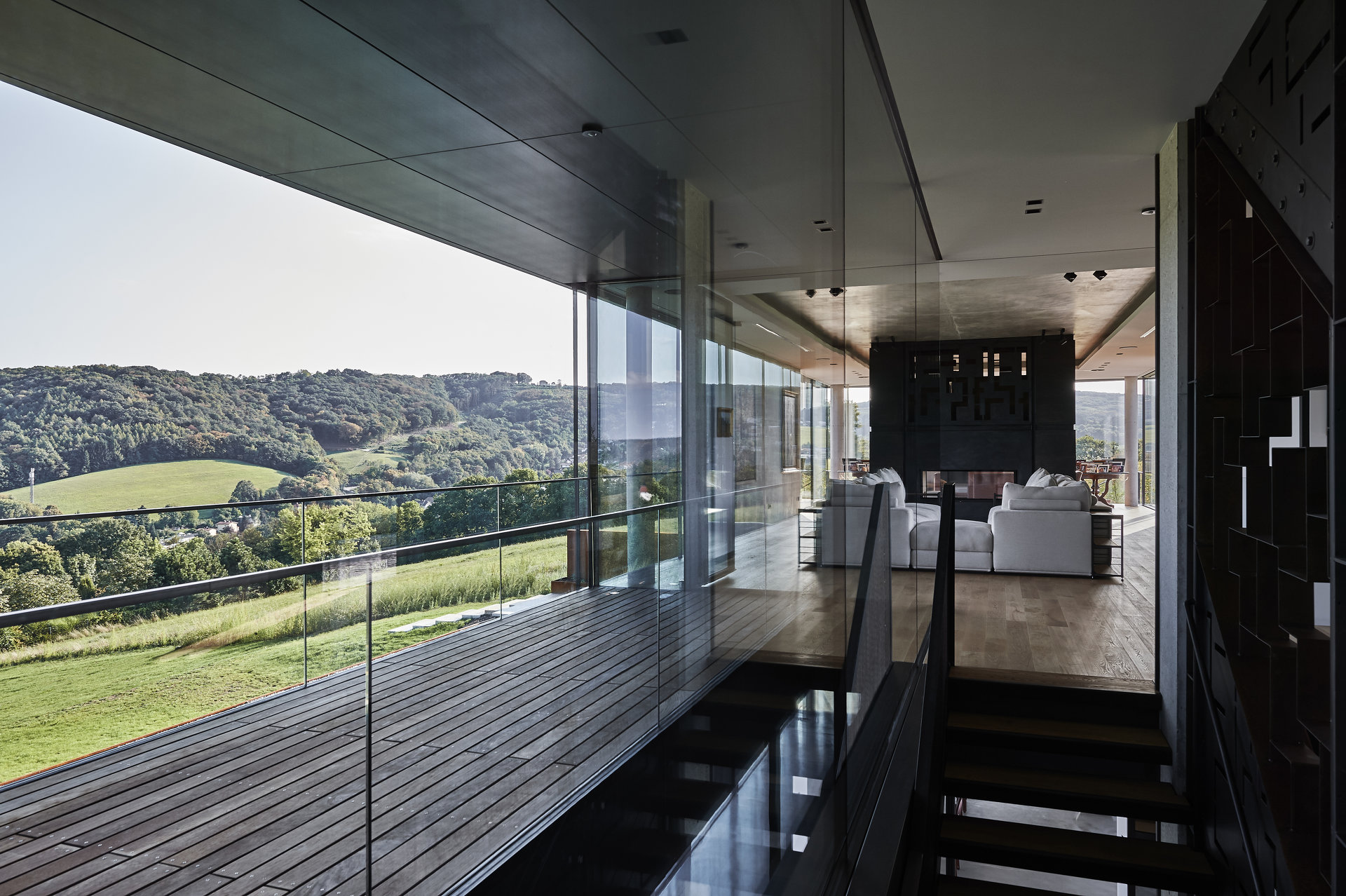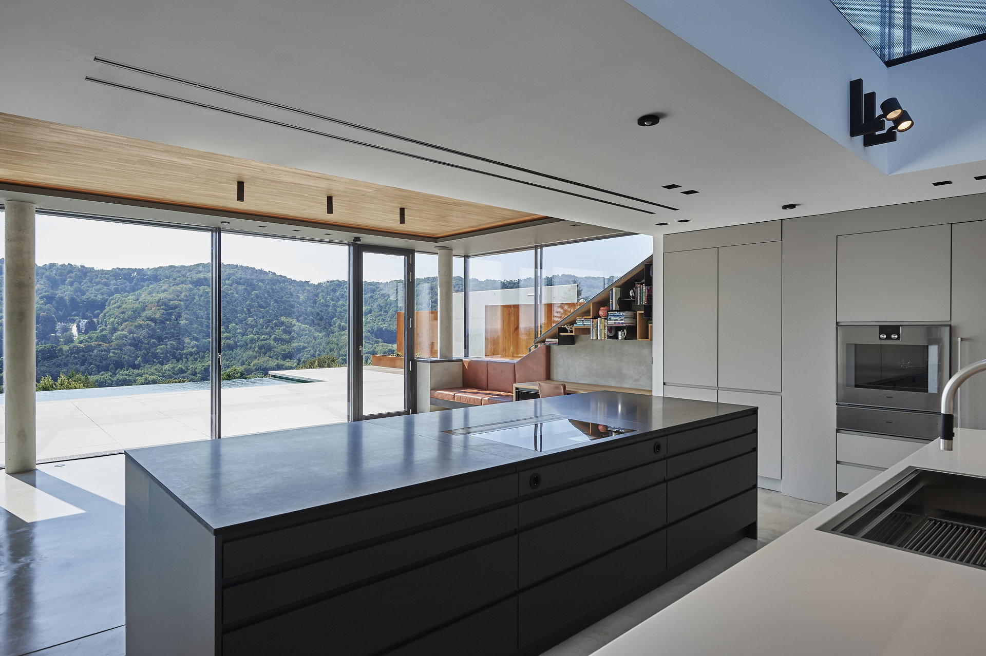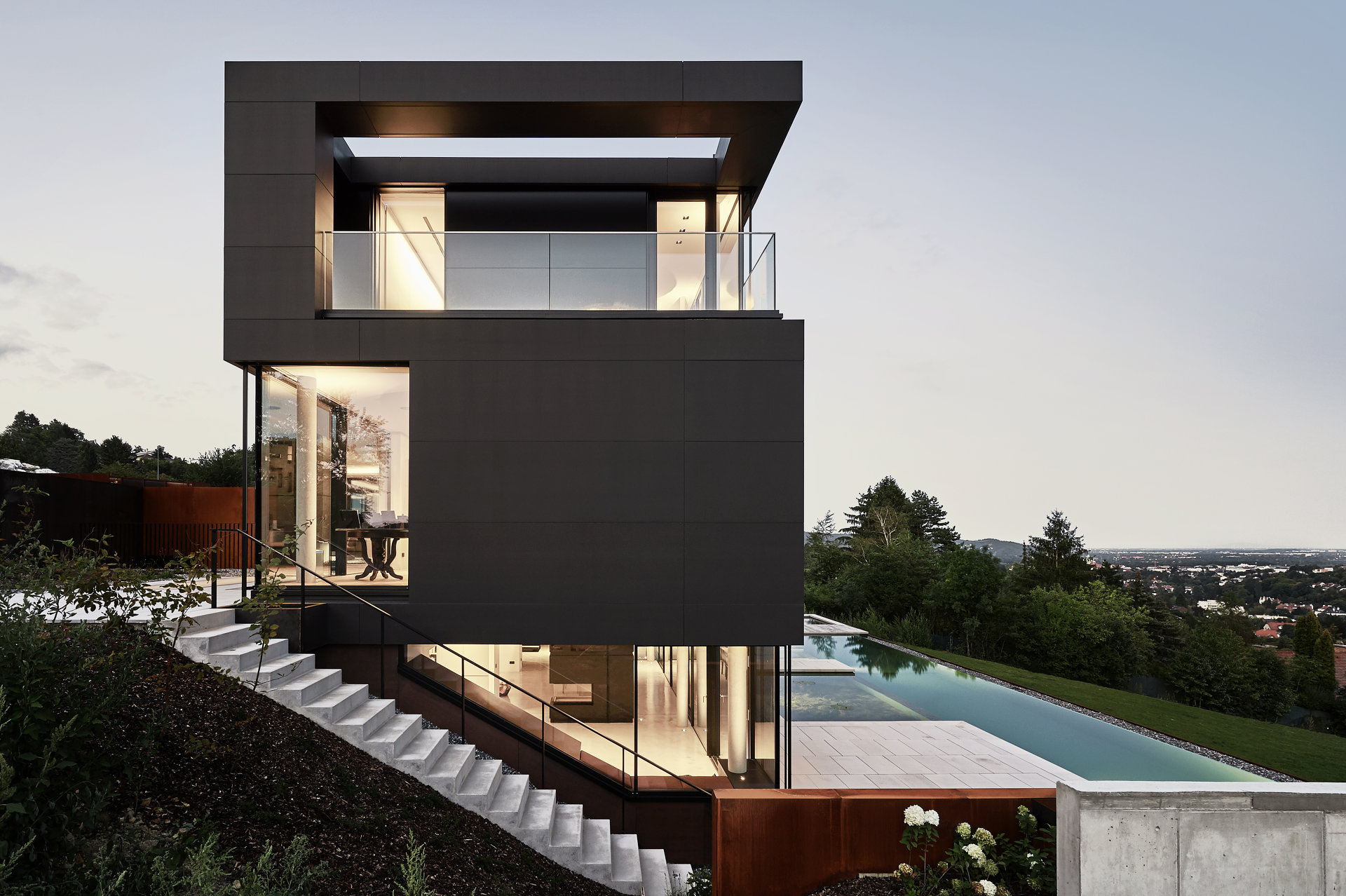 Alle Ebenen sind durch eine Treppenanlage aus Cortenstahl verbunden, die Dachverglasung bildet die helle Mitte und das Rückgrat des Hauses. Die im Tagesverlauf changierende vorgehängte Zink-Titan Platten-Fassade bettet das Haus in die Landschaft ein.