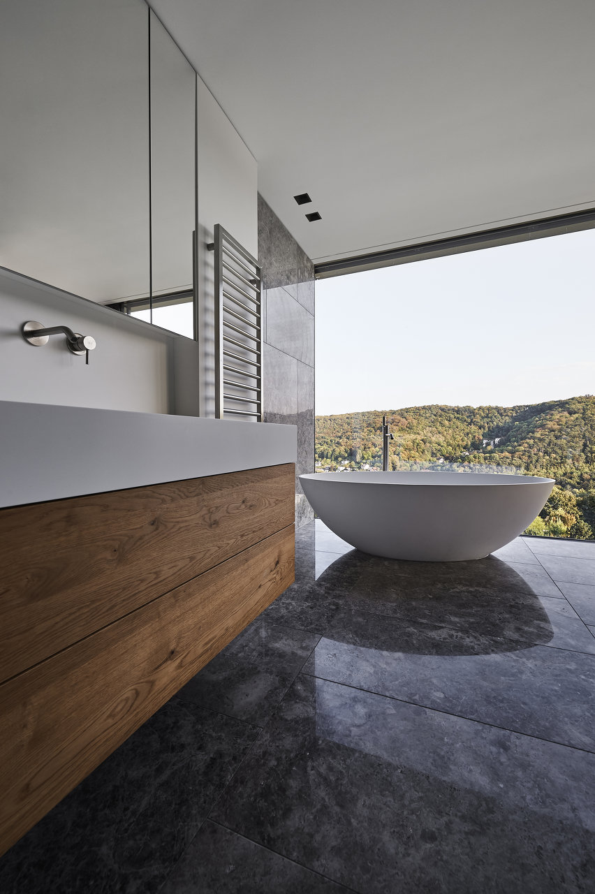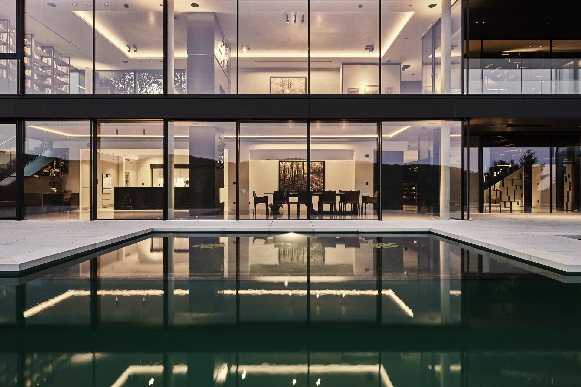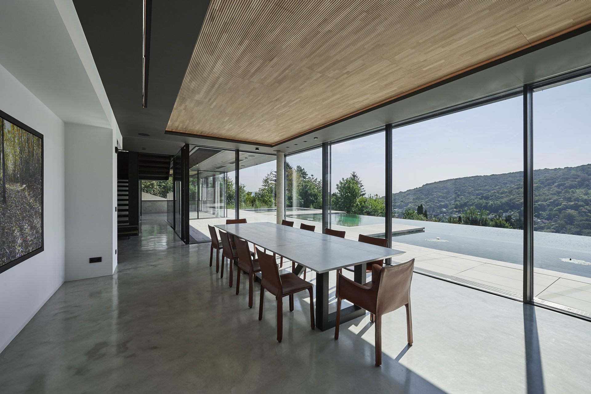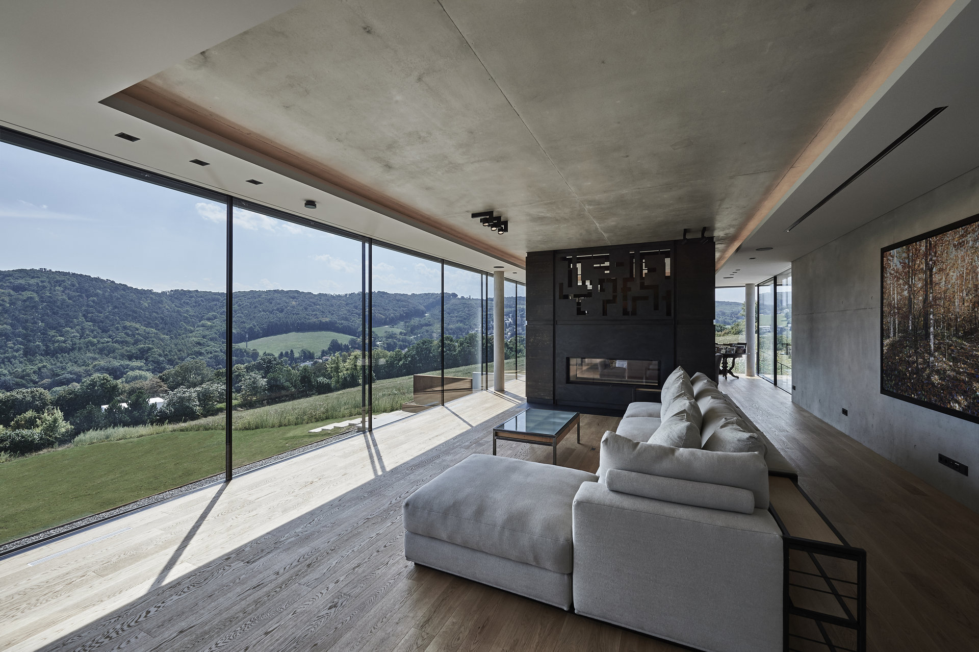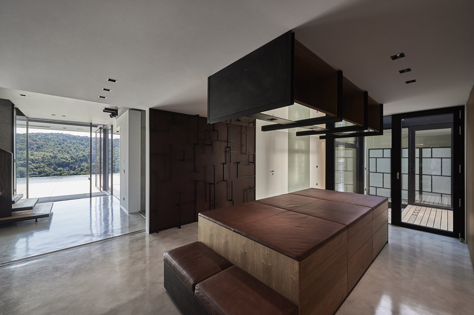 Die diagonale Eingangstreppe führt zum Haupteingang in der mittleren Wohnebene. Hier gibt es zwei, durch einen Kamin getrennte Wohnbereiche, den Fernseh-Raum, der auch als Gästezimmer mit Bad nutzbar ist sowie ein Büro. In der unteren Ebene sind die gemeinschaftlichen Räume des Hauses untergebracht, wie Wohnküche mit Essbereich und einem Kaminplatz, der Wellnessbereich mit Sauna, diverse Hobbyräume, und in der Zwischenzone zur unterirdischen Garage, die mit zwei Atrien belichtet ist, die technischen Bereiche und eine große Garderobe. Die Südterrasse endet auf dieser Ebene mit einem Endlos-Naturpool an der steilen Wiesenkannte und verstärkt nochmals den unverbaubaren Blick in die Natur. In der obersten Ebene sind die Zimmer und Bäder untergebracht, als persönliche Rückzugsbereiche gibt hier jedoch Türen.
