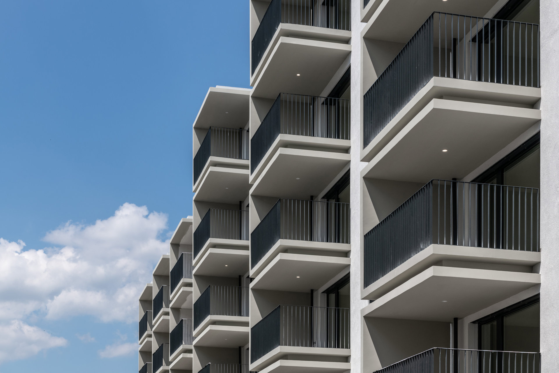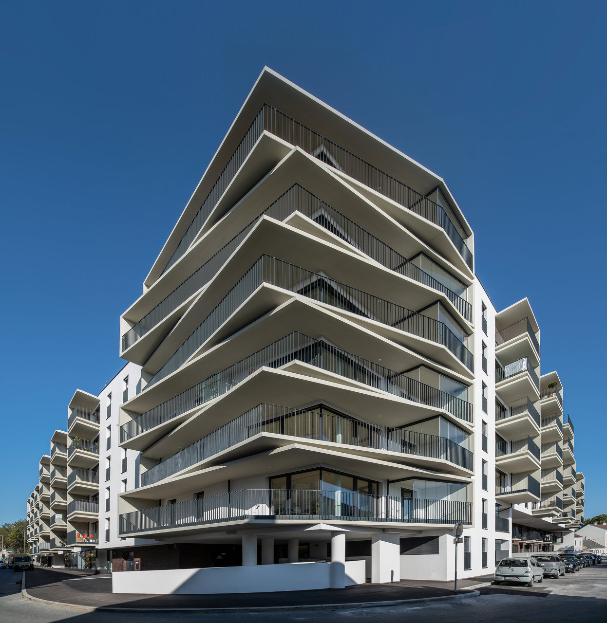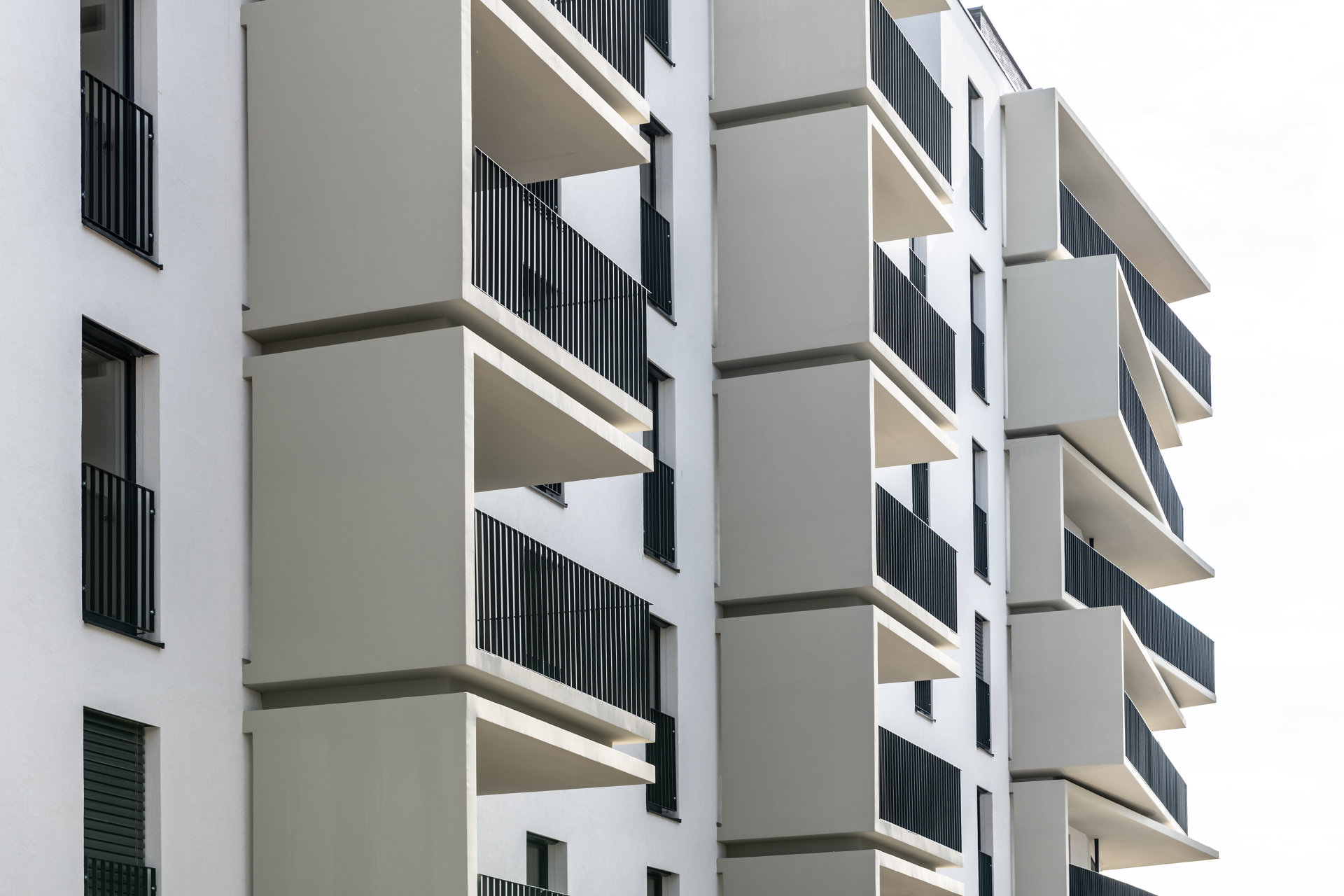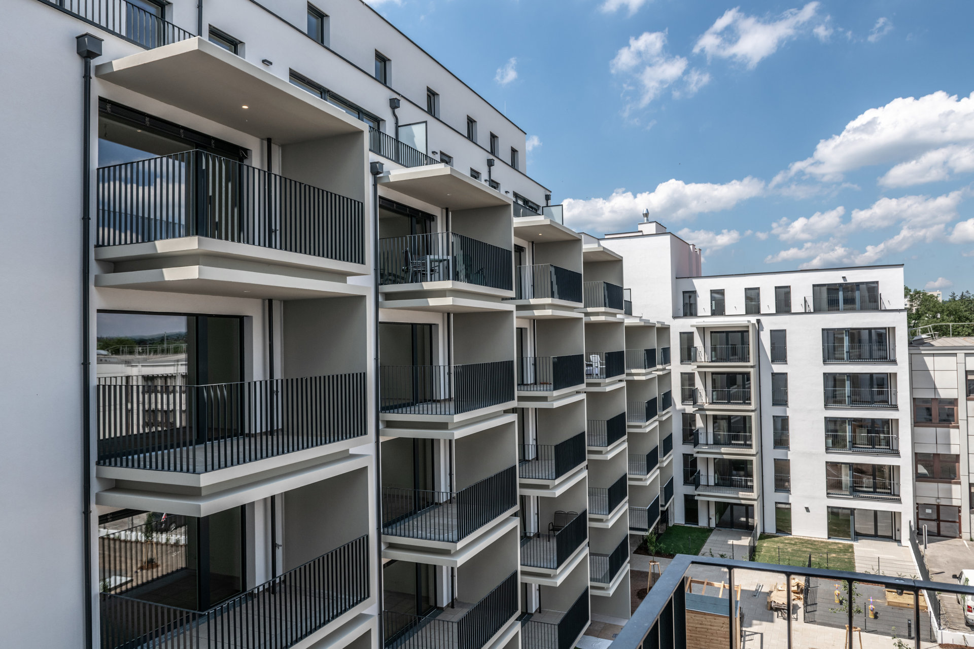 Der westliche Baukörper umfasst kleinere, seniorengerechte Wohnungstypen mit Option auf ein Rundum-Service. Markant ausformulierte Balkonelemente in C-Form strukturieren das Volumen. Bei den Eckwohnungen sind die Terrassenflächen effektvoll aufgefächert. Großzügige Verglasungen stellen den unmittelbaren Bezug zum grünem Umfeld her. Die Grundrisse sind flexibel gestaltet und können in Größe und Anzahl der Zimmer mit minimalem Aufwand individuell angepasst werden.