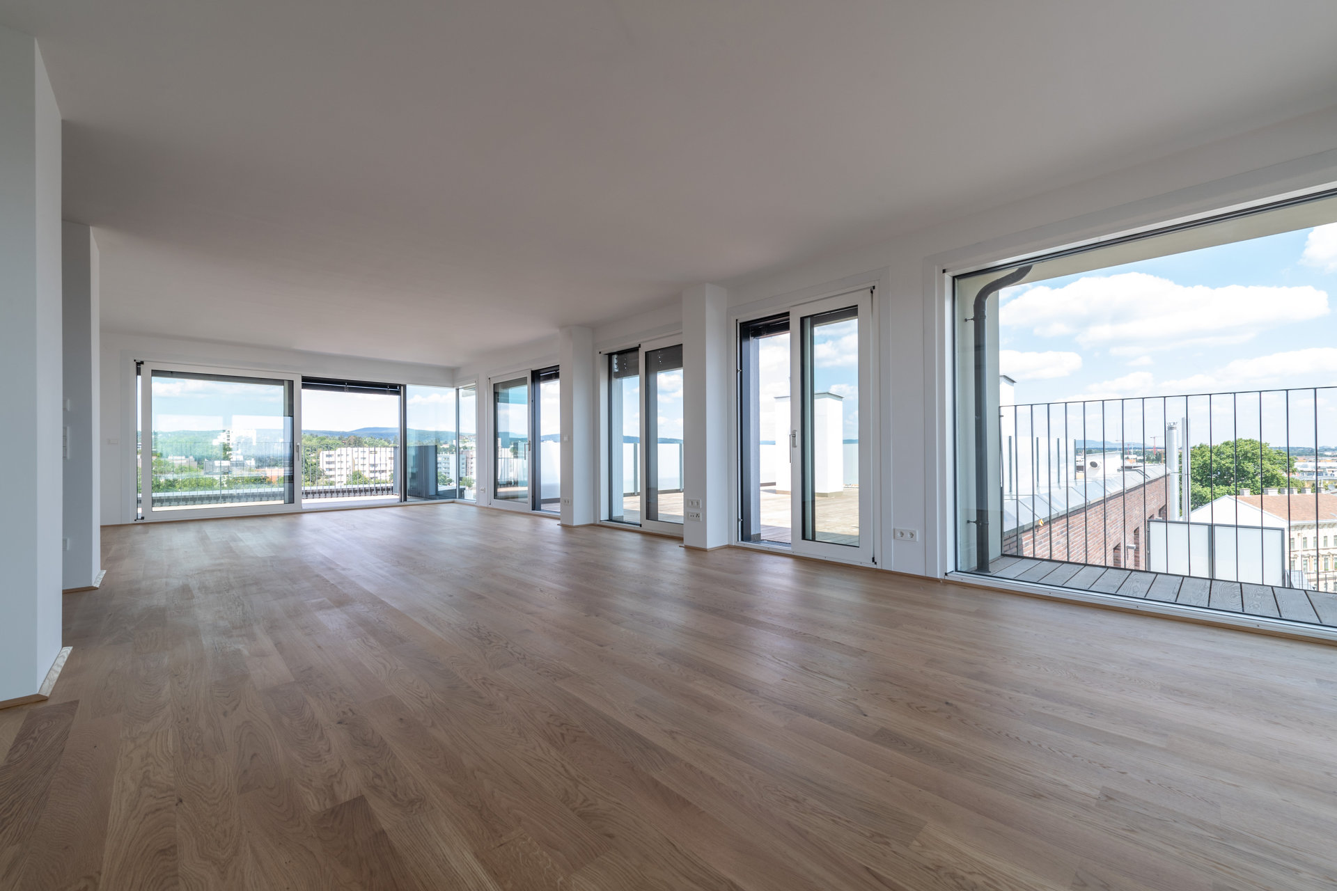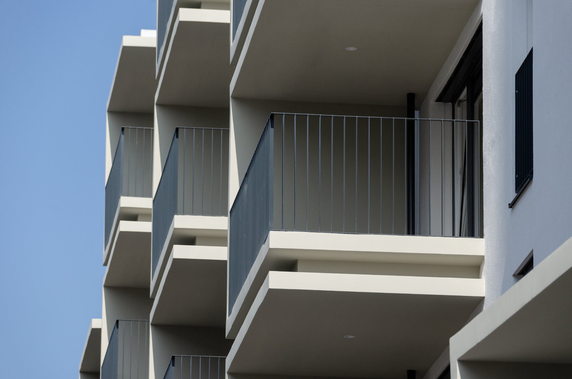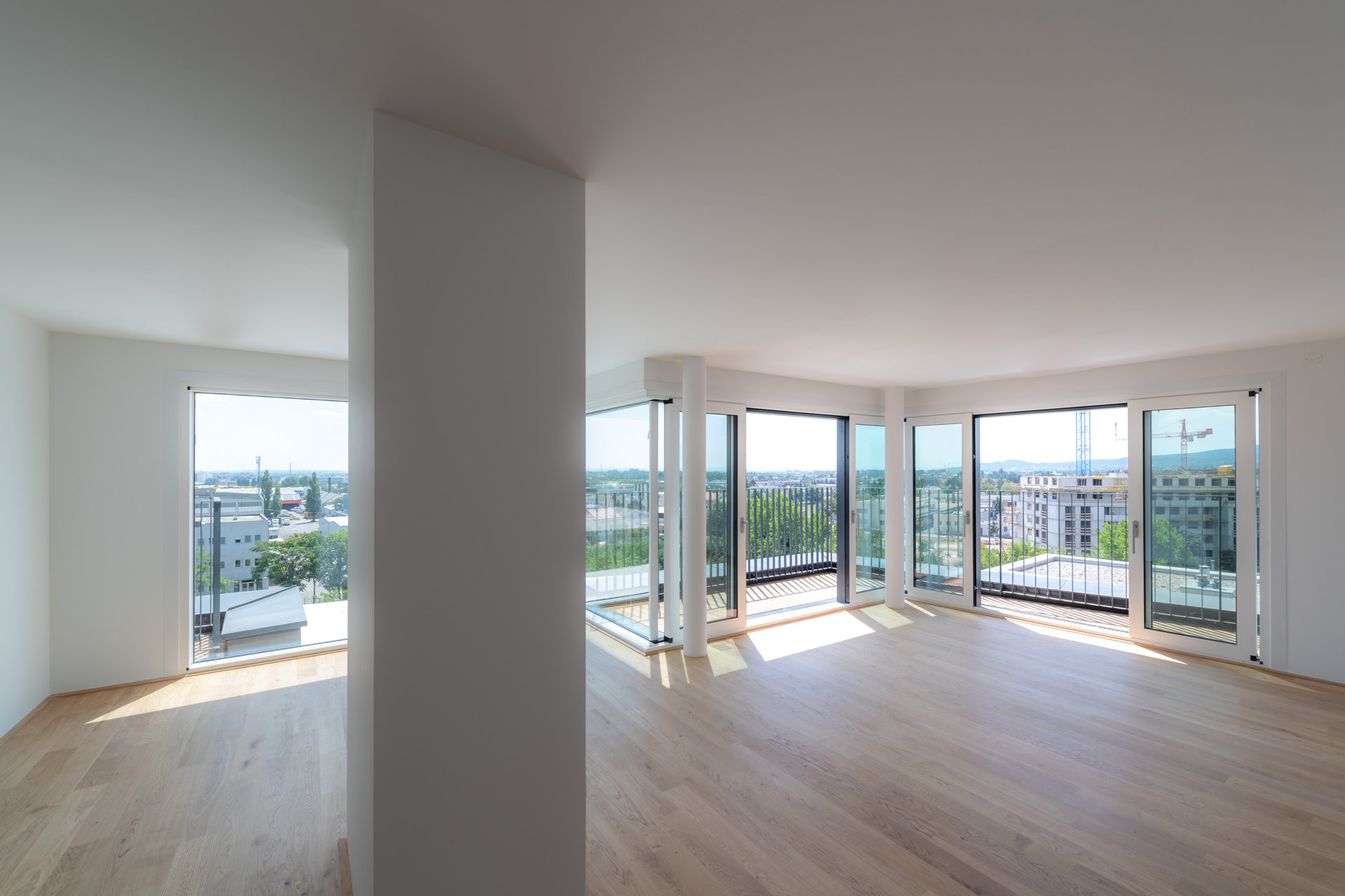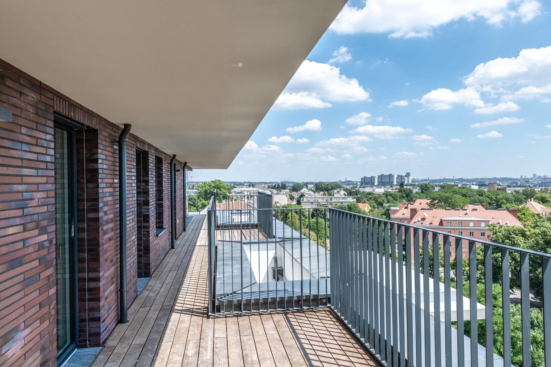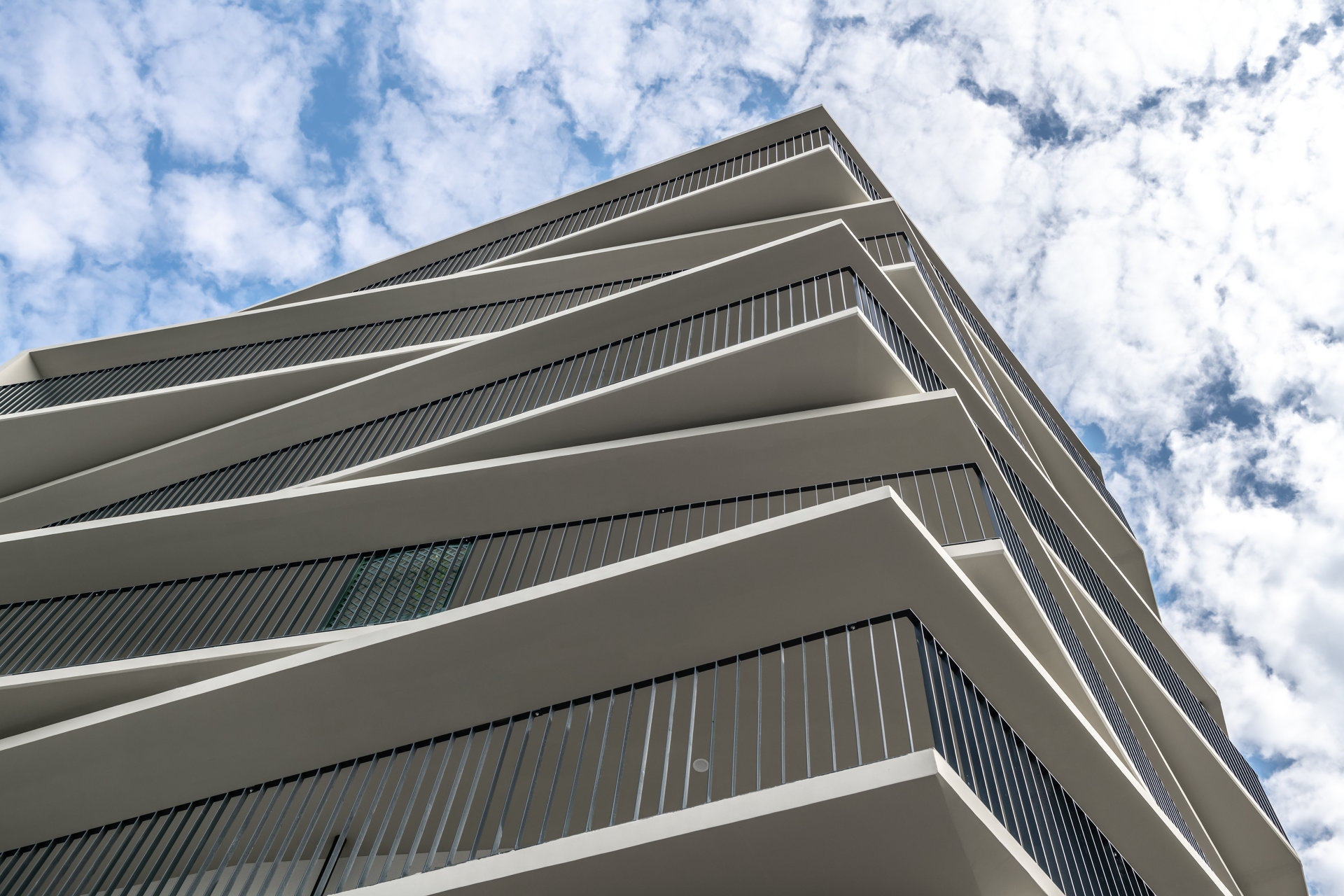 Der westliche Baukörper umfasst kleinere, seniorengerechte Wohnungstypen mit Option auf ein Rundum-Service. Markant ausformulierte Balkonelemente in C-Form strukturieren das Volumen. Bei den Eckwohnungen sind die Terrassenflächen effektvoll aufgefächert. Großzügige Verglasungen stellen den unmittelbaren Bezug zum grünem Umfeld her. Die Grundrisse sind flexibel gestaltet und können in Größe und Anzahl der Zimmer mit minimalem Aufwand individuell angepasst werden.