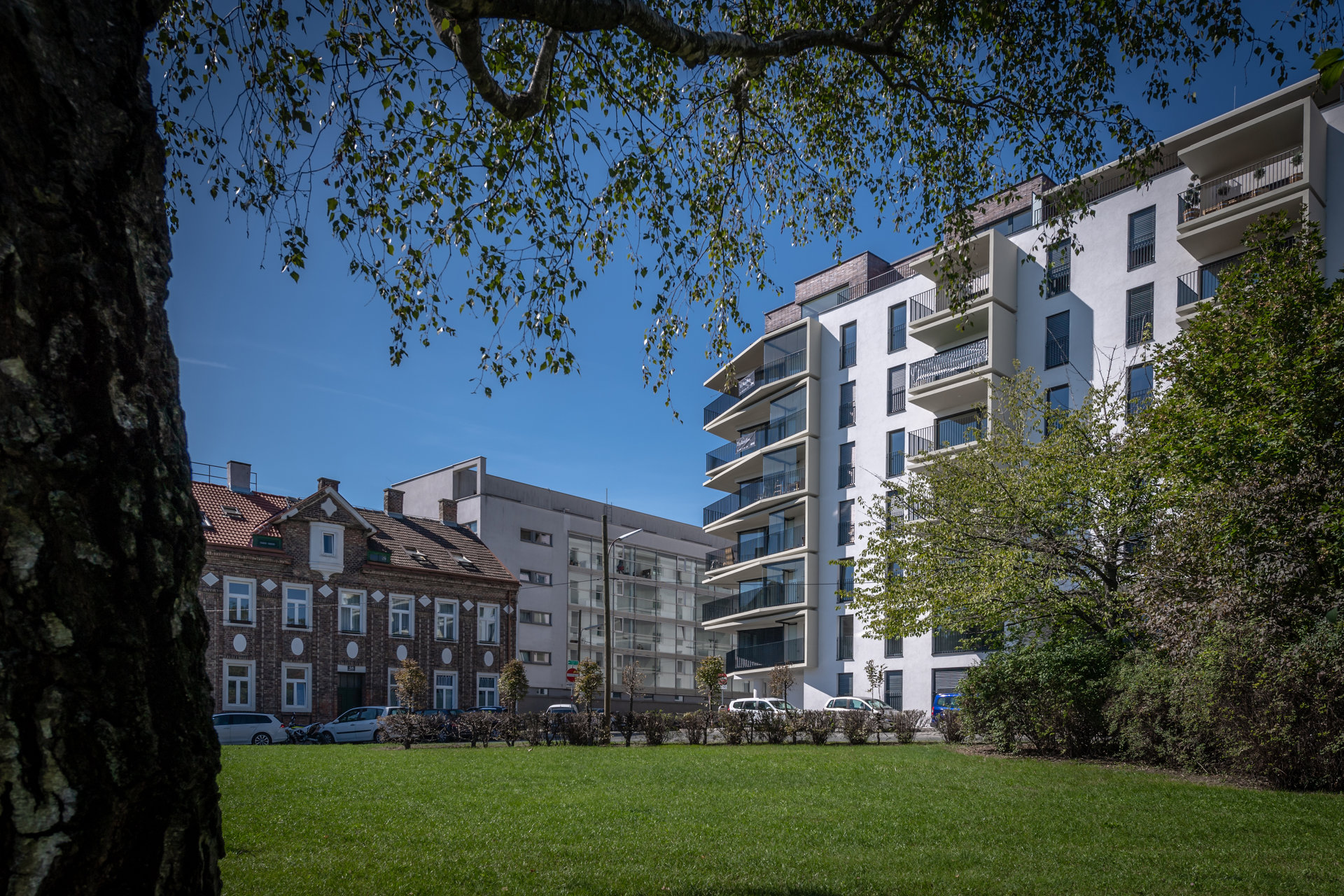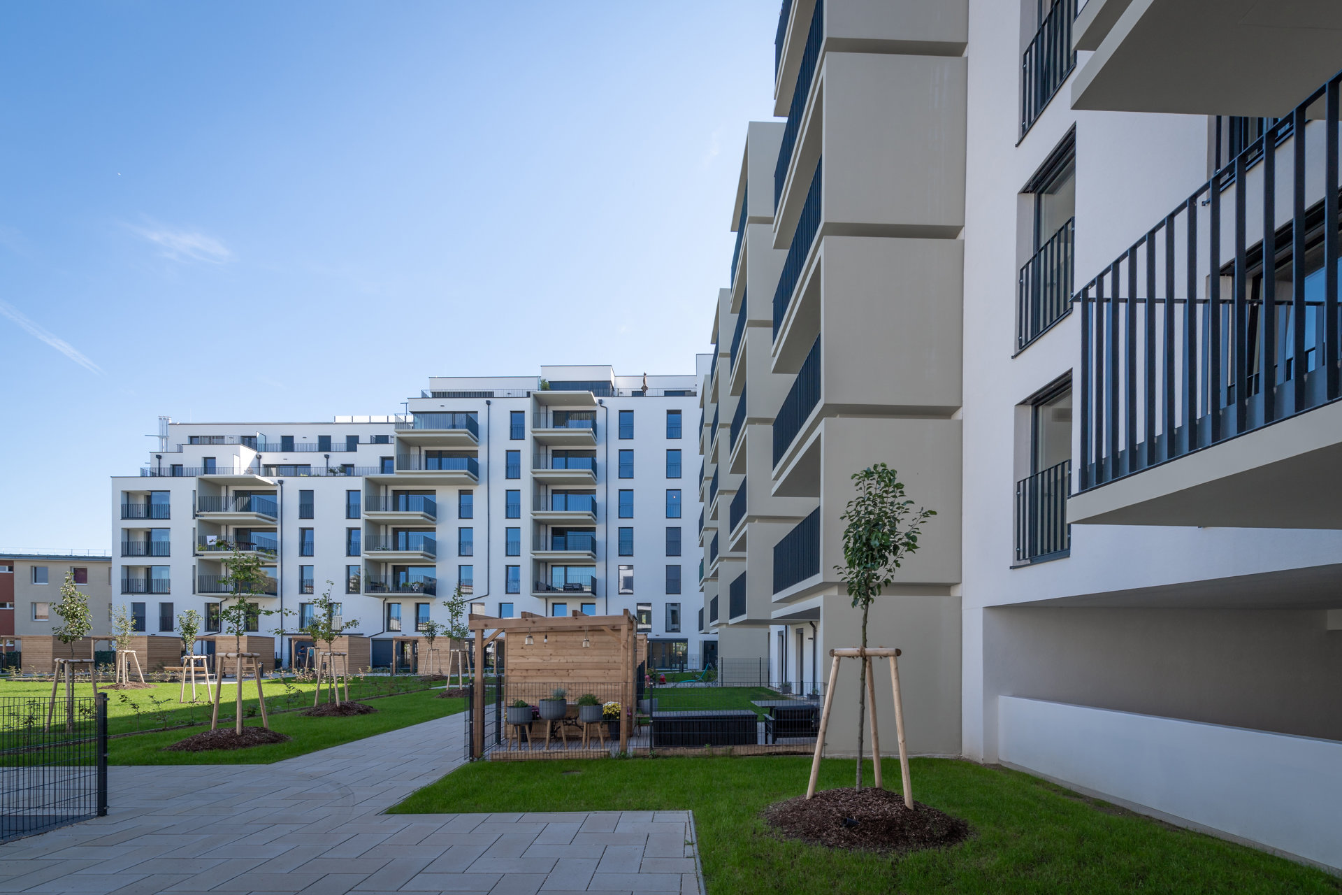 Die beiden Bauteile umfassen einen großen Innenhof mit Kinderspielplatz und Mietergärten und teilen sich die eingeschossige Tiefgarage. Gemeinschaftseinrichtungen haben einen hohen Stellenwert: breite Gänge, helle Atrien, Gemeinschaftsterrassen und im Erdgeschoss ein Heimkino seien exemplarisch genannt. (Text: Architekten, bearbeitet)