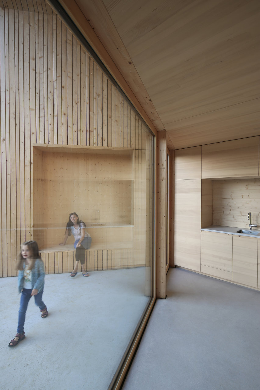 Die gesamte Holzkonstruktion besteht aus vorgefertigten Massivholzelementen mit Weißtannendeckschicht. Gedämmt wurde mit Holzwolle, die Fassade aus sägerauhen Fichtenbrettern vertikal angeschlagen. Großen Wert wurde auf die Verwendung von unbehandelten, natürlichen Materialien gelegt.