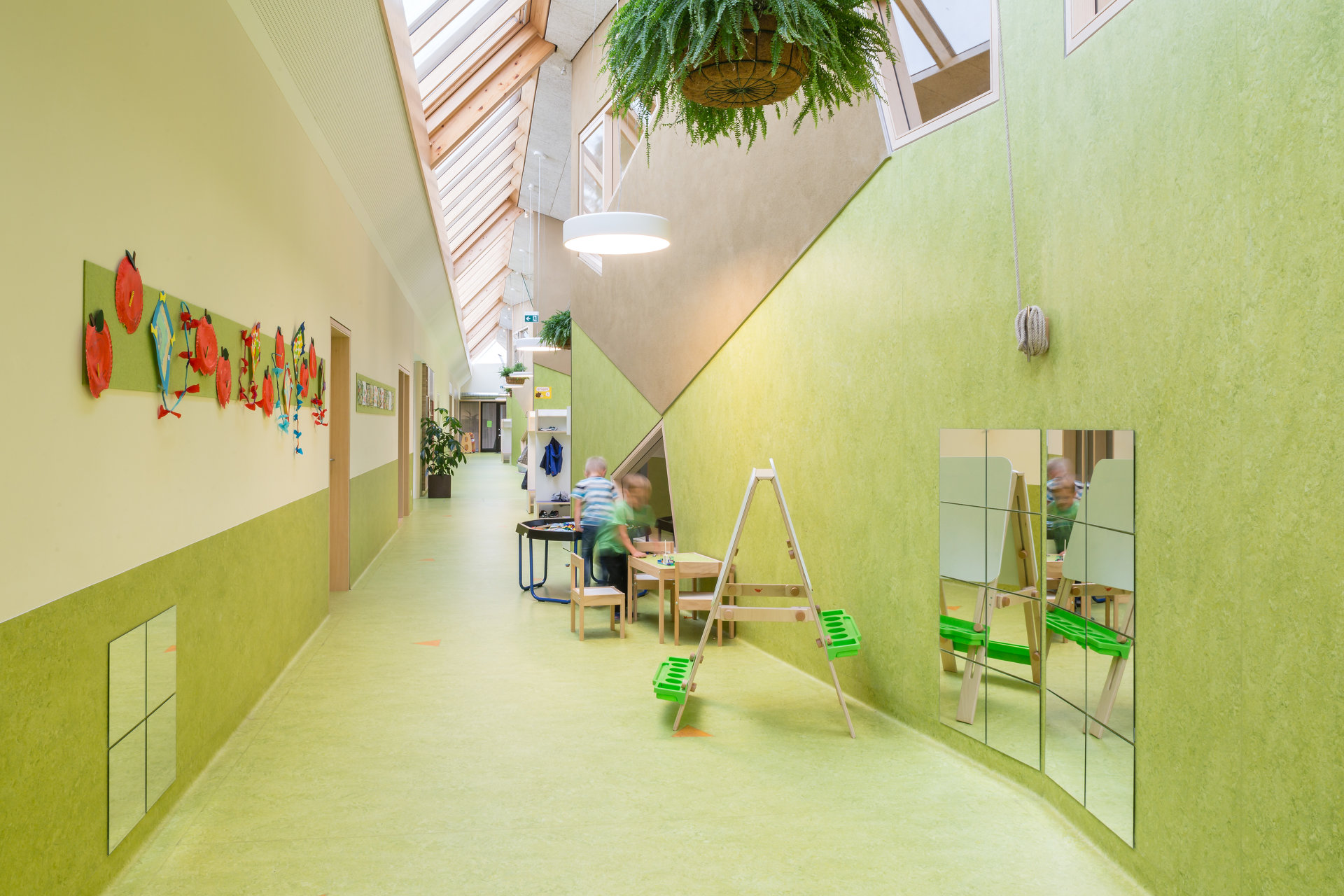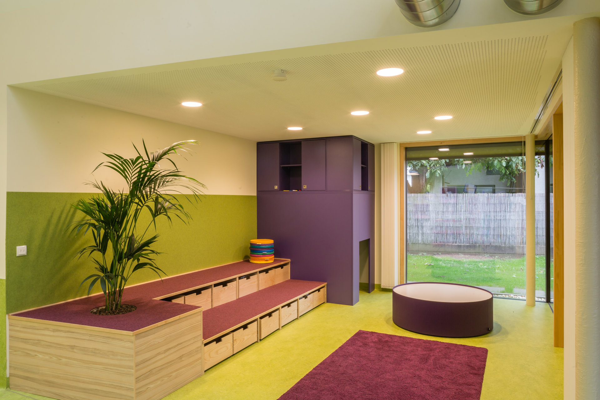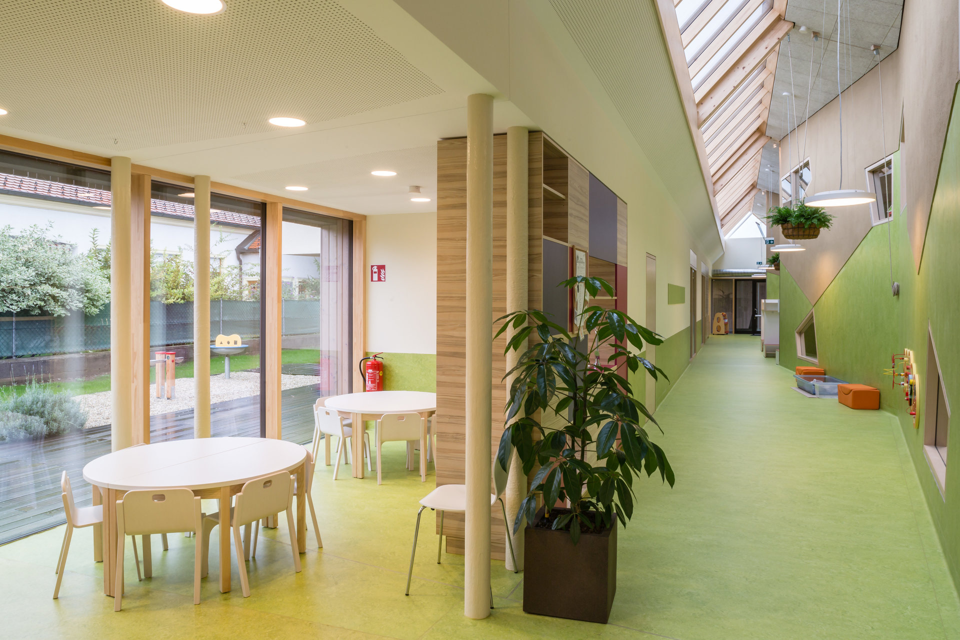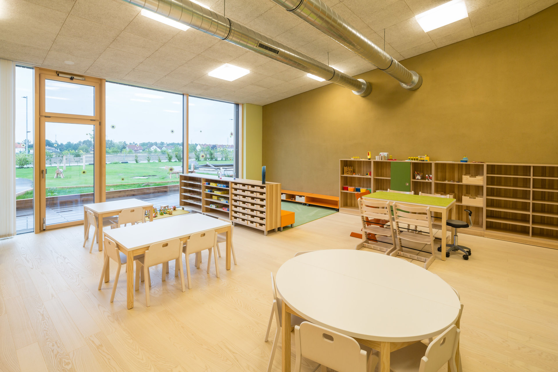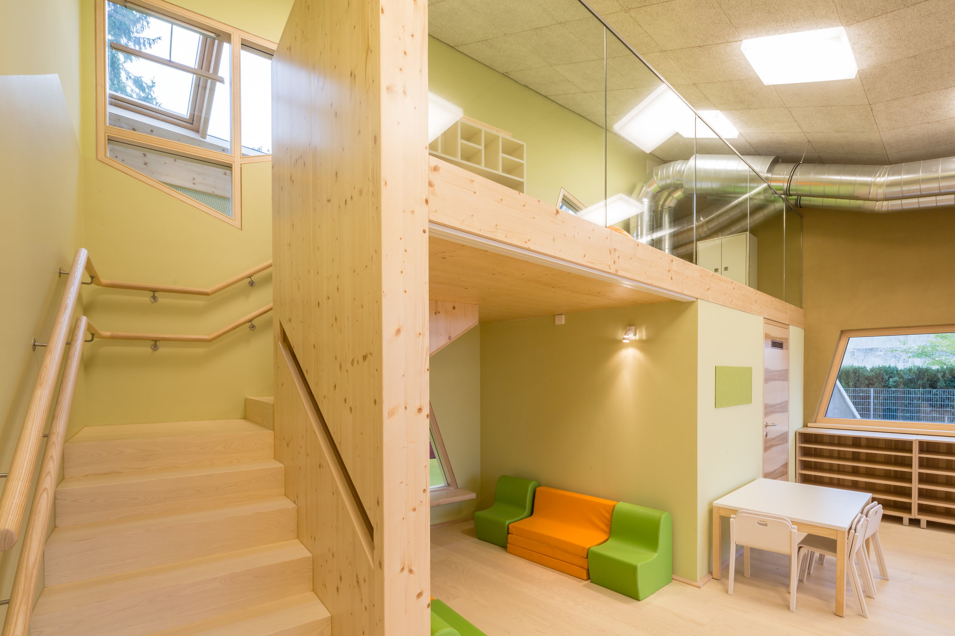 - Der Kindergarten verfügt über ein kontrolliertes Lüftungssystem mit hocheffizienter Wärmerückgewinnung und Frischluft. Im Sommer und in den Übergangszeiten kann bei Bedarf brunnenwassergekühlte Luft eingebracht werden. Zusätzlich ermöglicht Schwerkraftlüftung eine Auskühlung des Gebäudes in der Nacht. Dazu können Lüftungsflügel und die zentrale Lichtkuppel automatisch angesteuert werden.