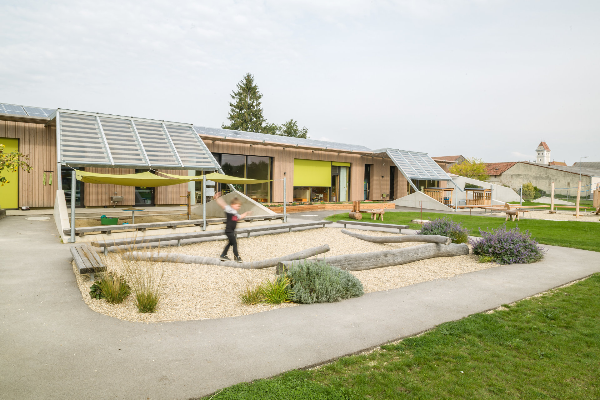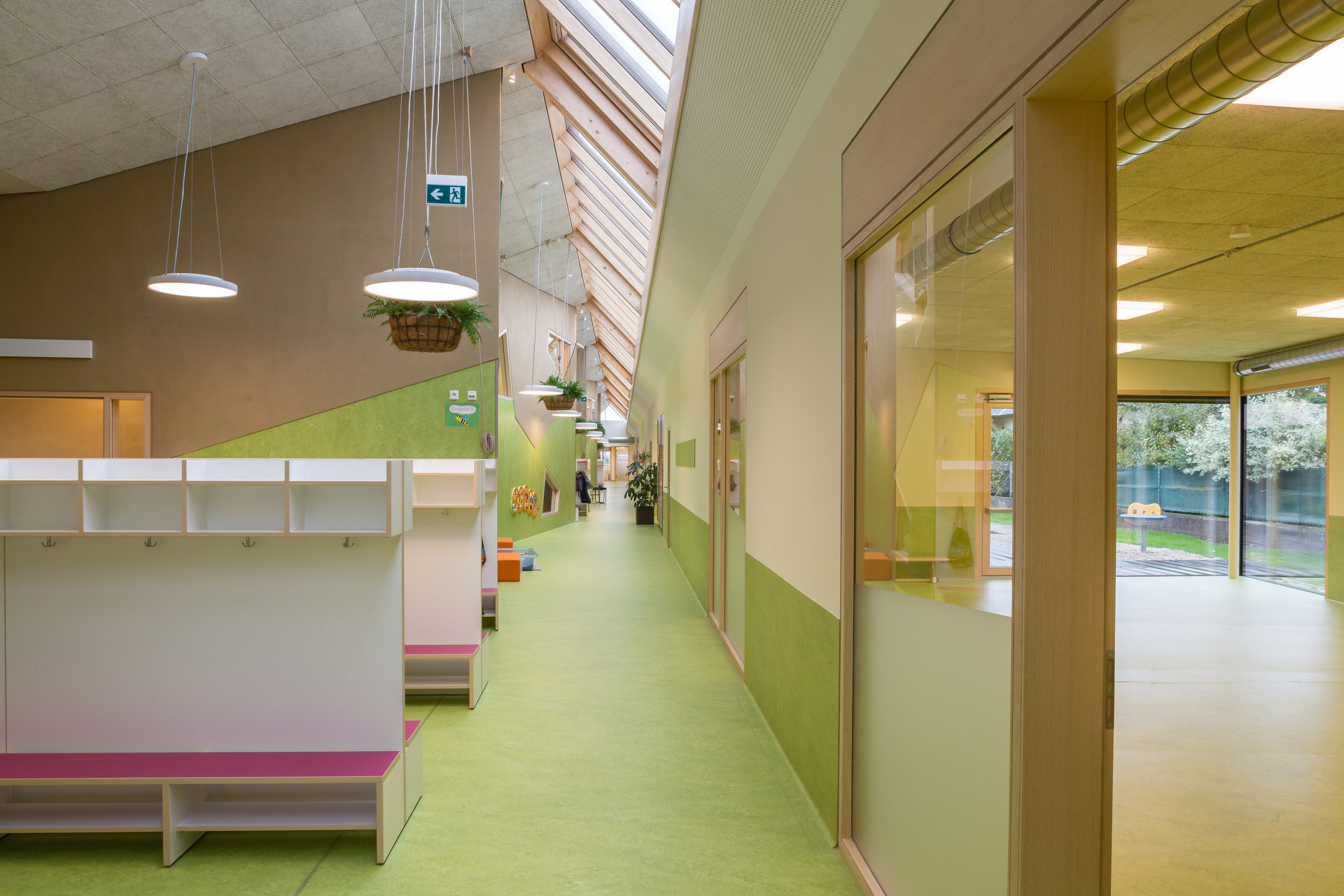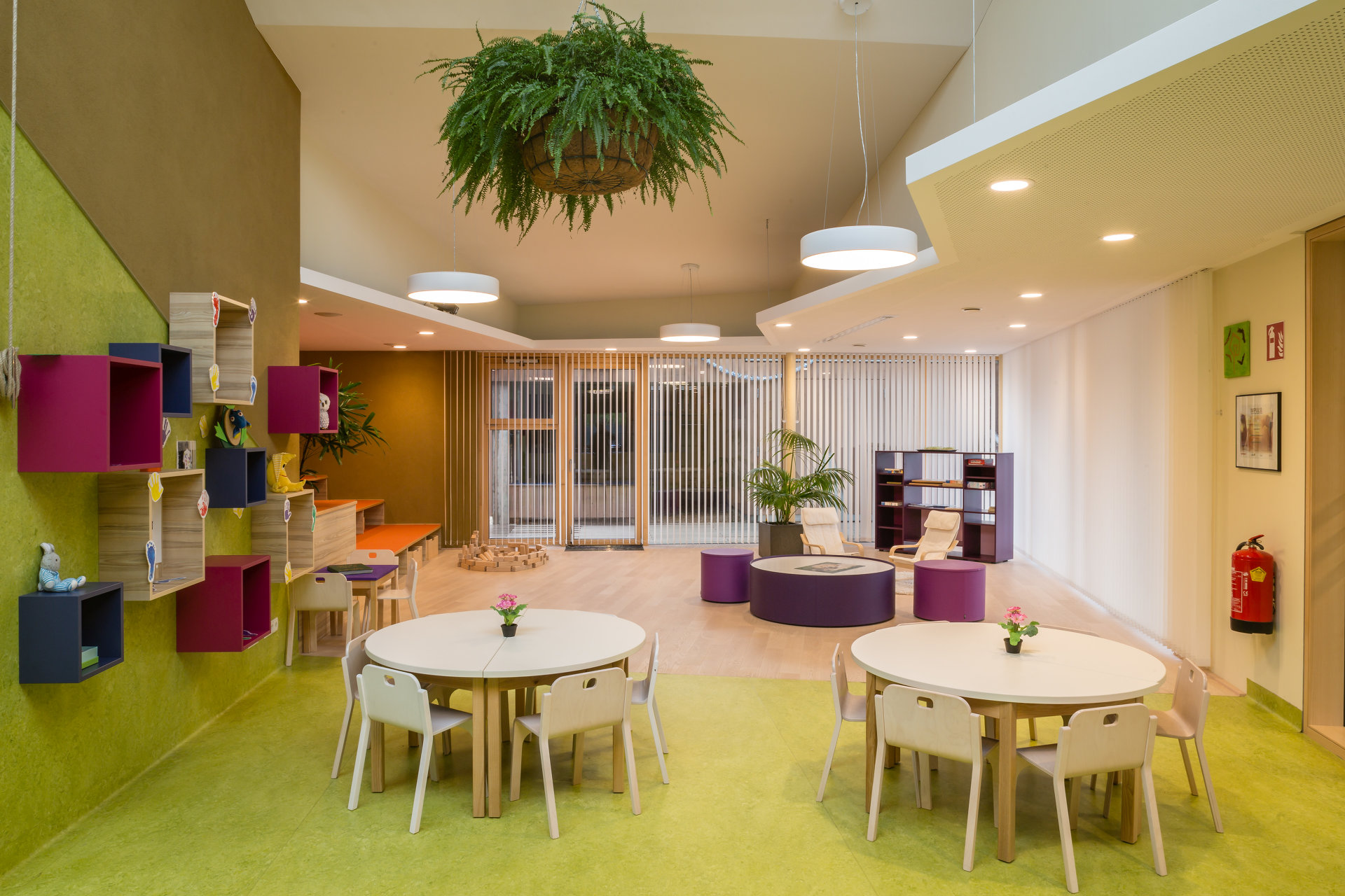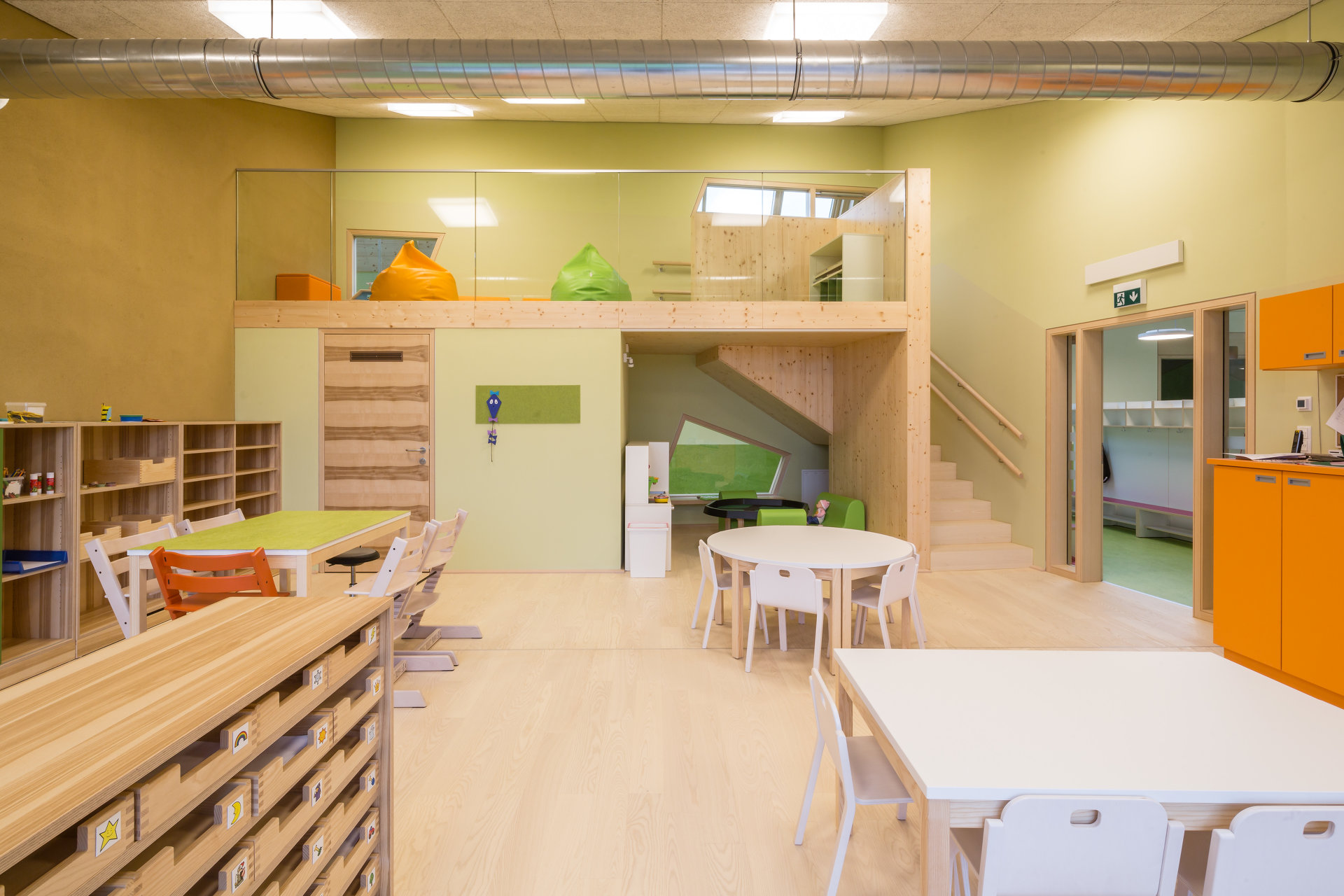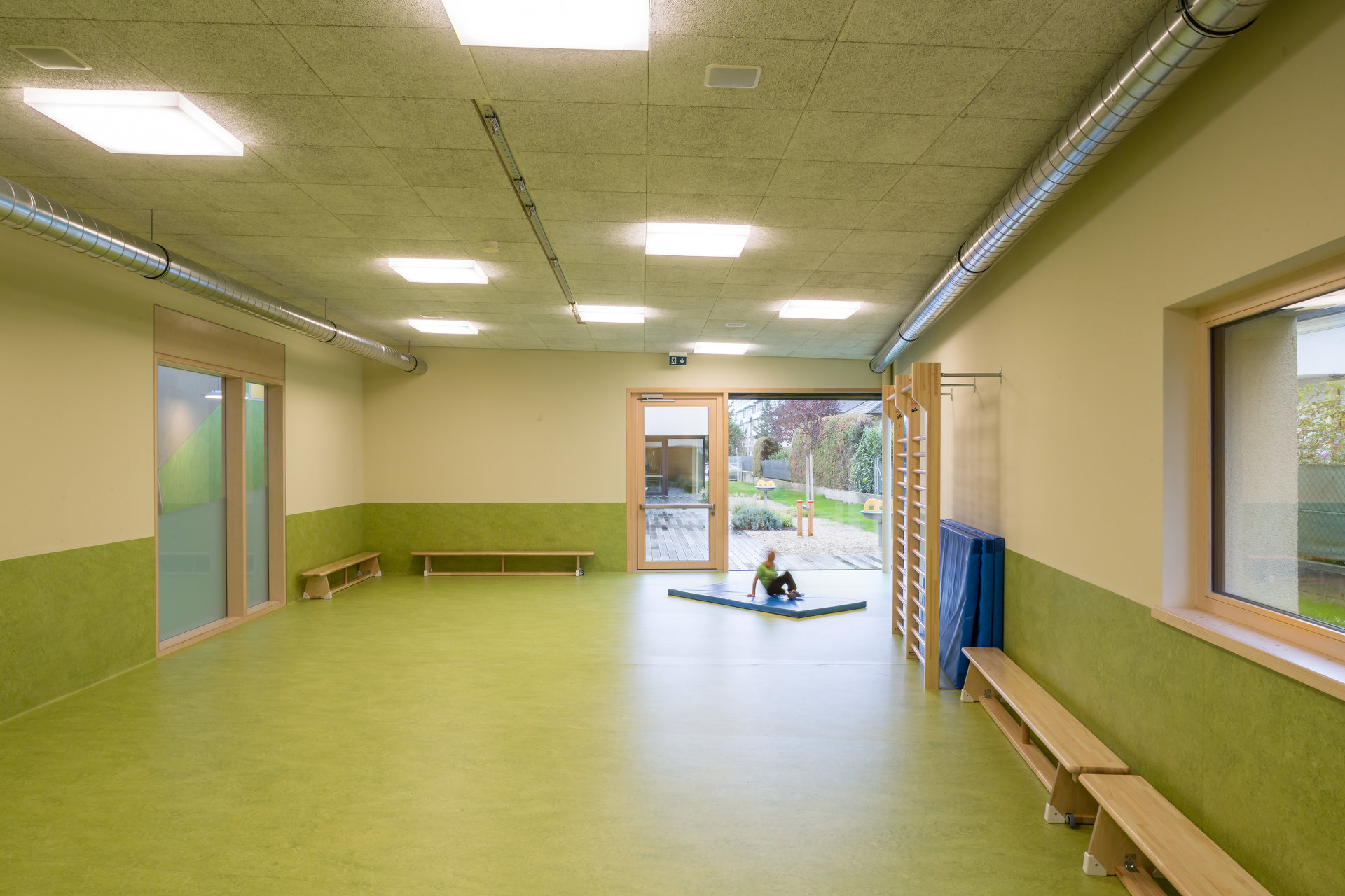 - Der Kindergarten verfügt über ein kontrolliertes Lüftungssystem mit hocheffizienter Wärmerückgewinnung und Frischluft. Im Sommer und in den Übergangszeiten kann bei Bedarf brunnenwassergekühlte Luft eingebracht werden. Zusätzlich ermöglicht Schwerkraftlüftung eine Auskühlung des Gebäudes in der Nacht. Dazu können Lüftungsflügel und die zentrale Lichtkuppel automatisch angesteuert werden.