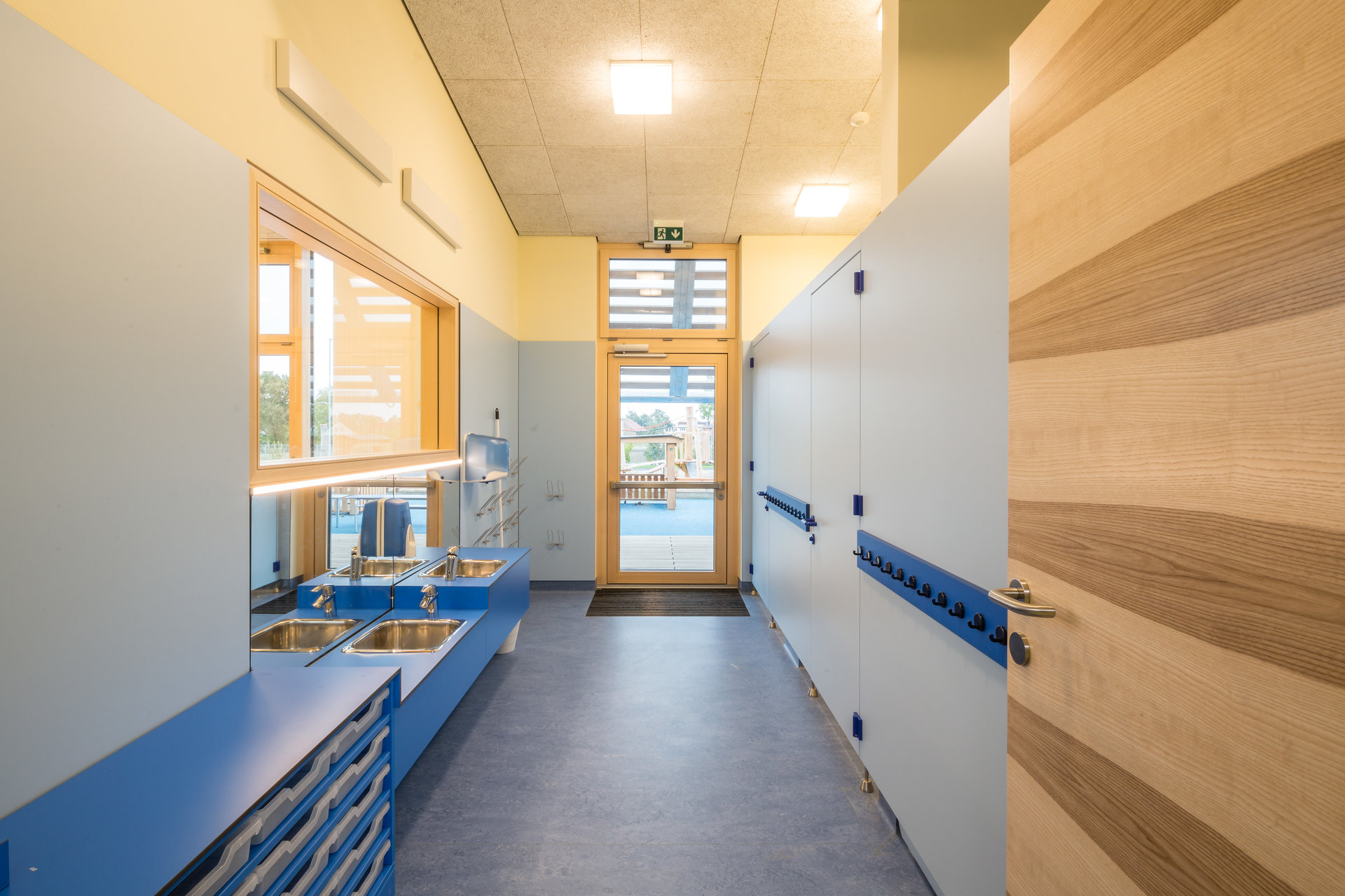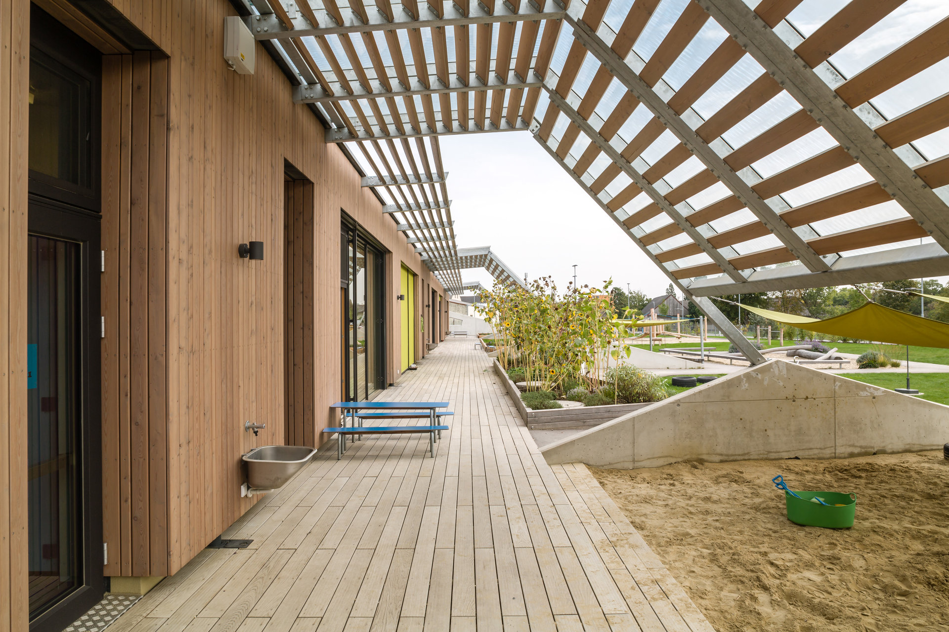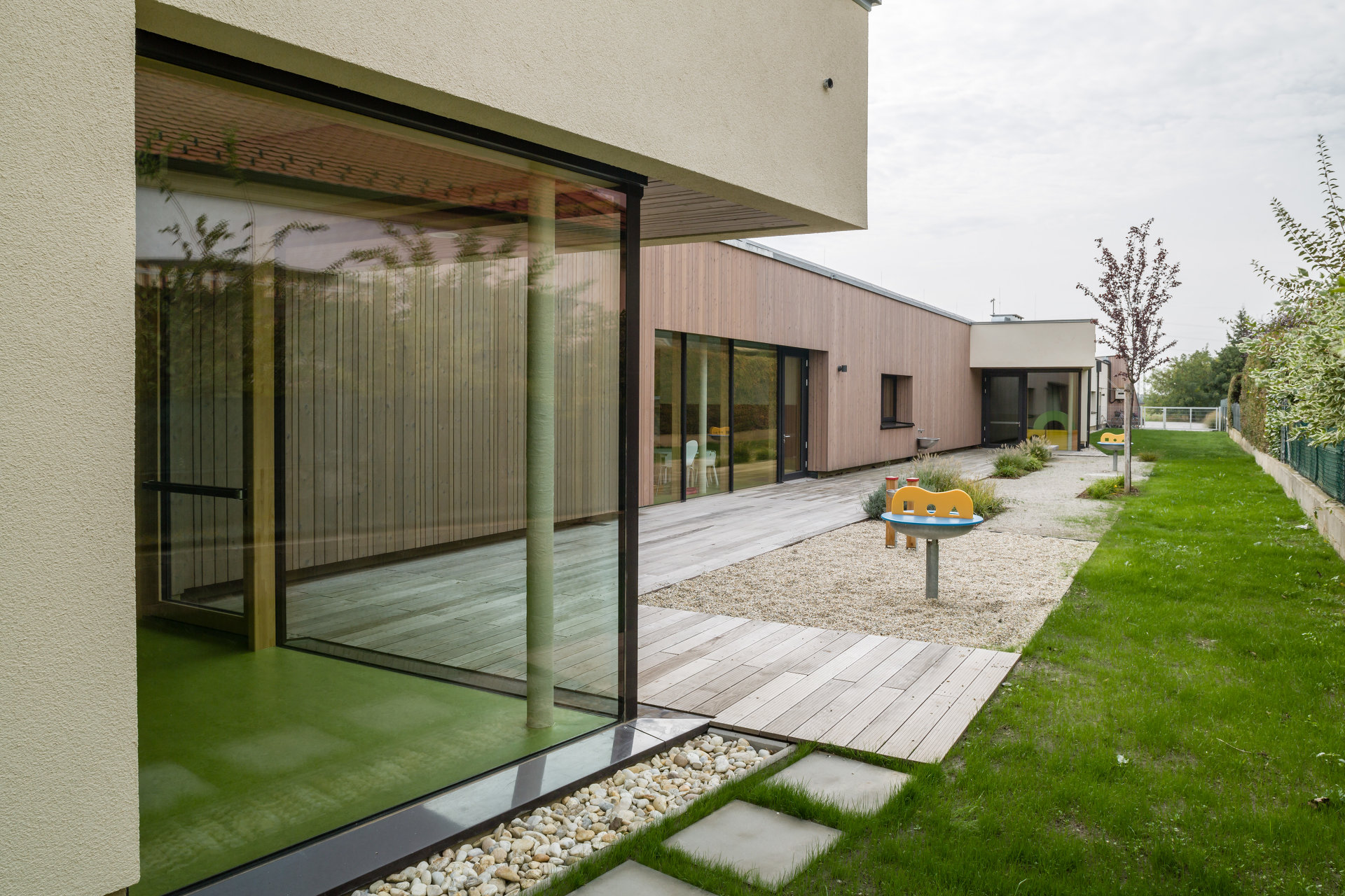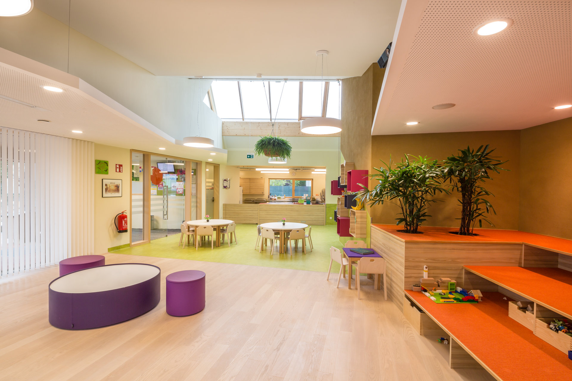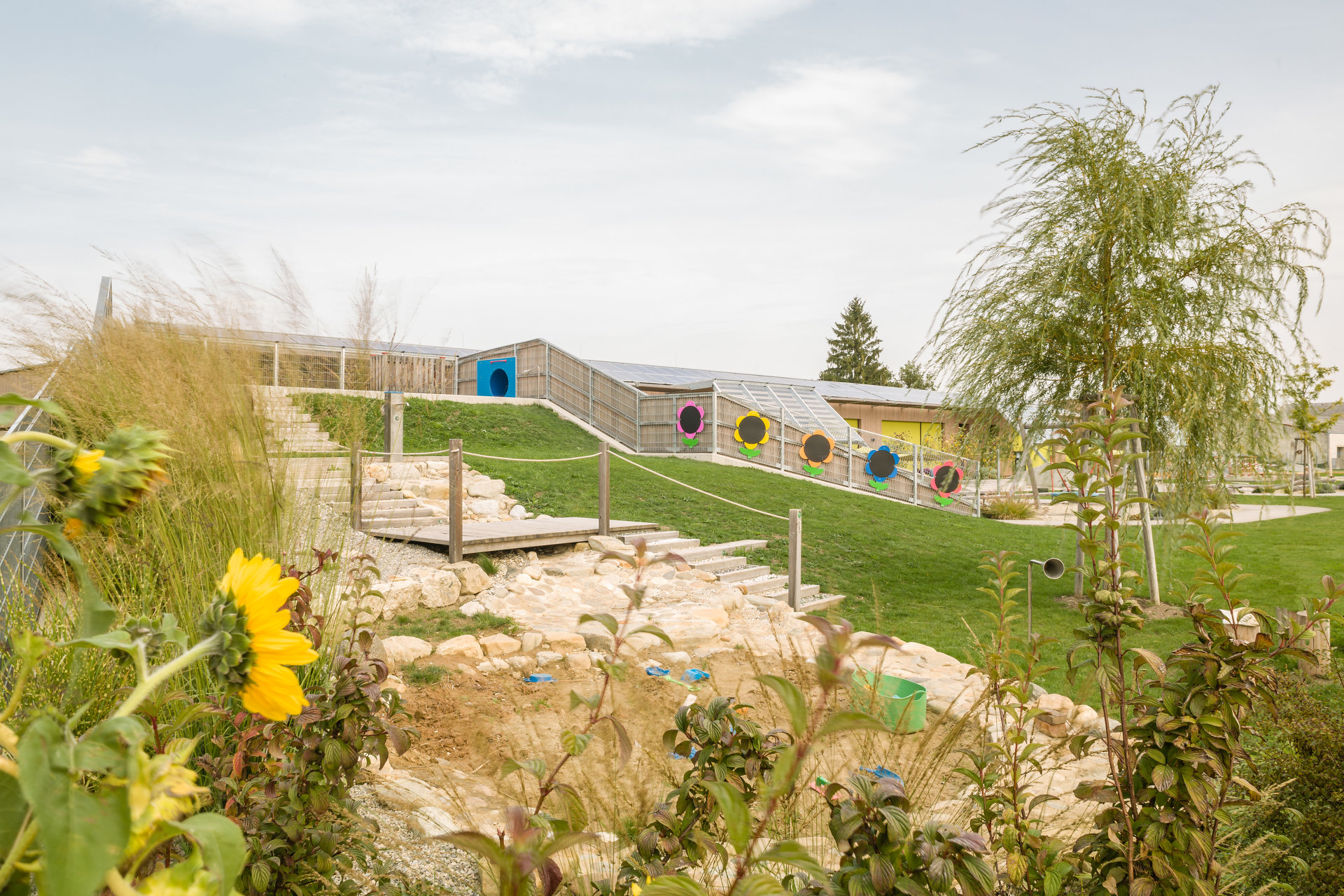 - Der Kindergarten verfügt über ein kontrolliertes Lüftungssystem mit hocheffizienter Wärmerückgewinnung und Frischluft. Im Sommer und in den Übergangszeiten kann bei Bedarf brunnenwassergekühlte Luft eingebracht werden. Zusätzlich ermöglicht Schwerkraftlüftung eine Auskühlung des Gebäudes in der Nacht. Dazu können Lüftungsflügel und die zentrale Lichtkuppel automatisch angesteuert werden.