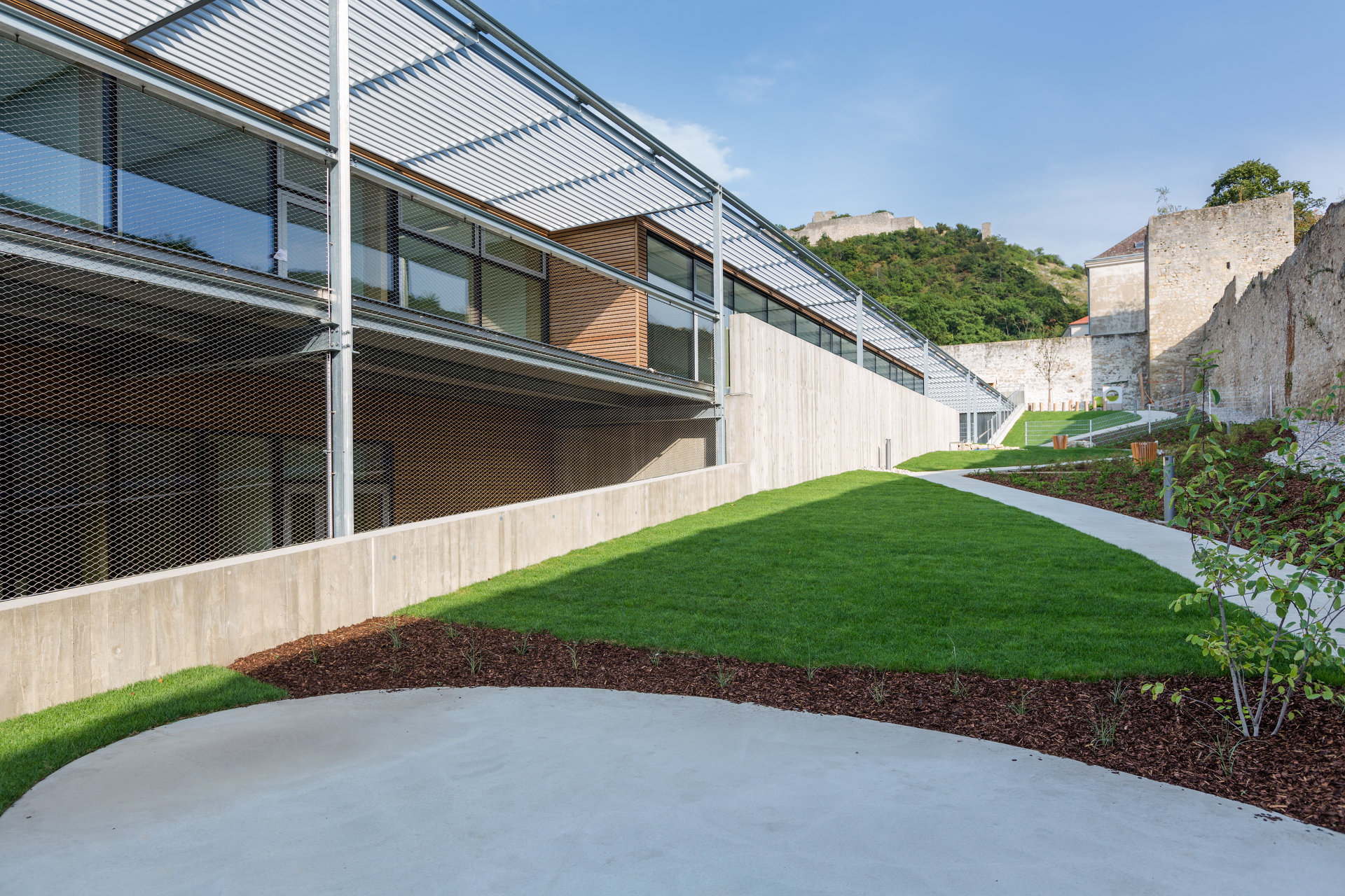 Für Malereien wurden lösungsmittelfreie Farbanstriche in Pastelltönen verwendet. Den Klassenräumen vorgelagert wurden Freiterrassen mit einer Pergola artigen Überdeckung als Sonnenschutz ausgeführt die sowohl als Freiluftklassen bzw. auch als Pausenflächen genutzt werden können. Diese stehen in Verbindung mit dem ansteigenden Gelände und können somit als zweiter Fluchtweg dienen. Südlich der Sonderschule sind in direktem Anschluss die Räumlichkeiten für den Hort bzw. die Tagesbetreuung situiert. Diese Bereiche bilden Innenhöfe zum bestehenden Gelände der angrenzenden NNÖMS.