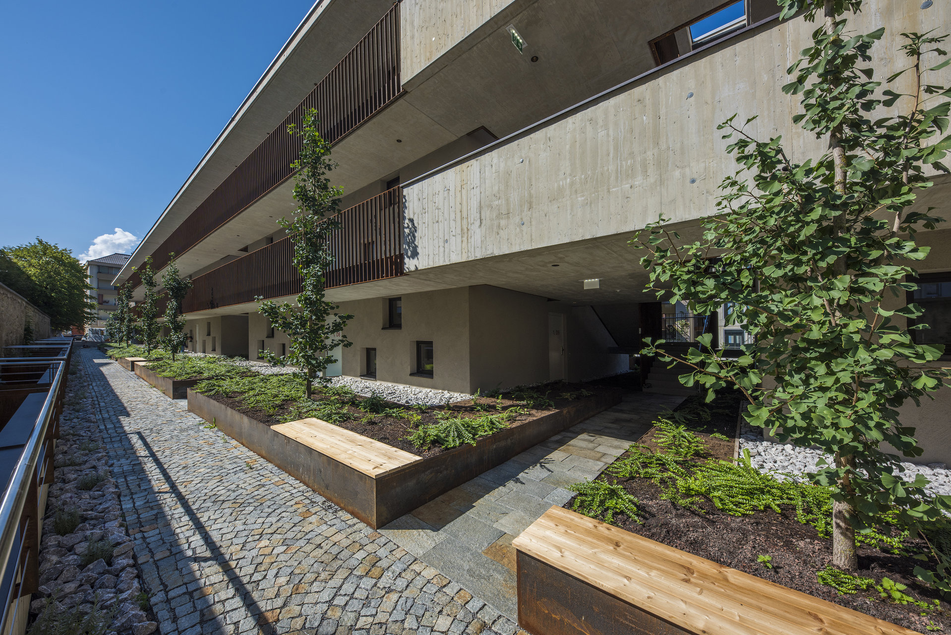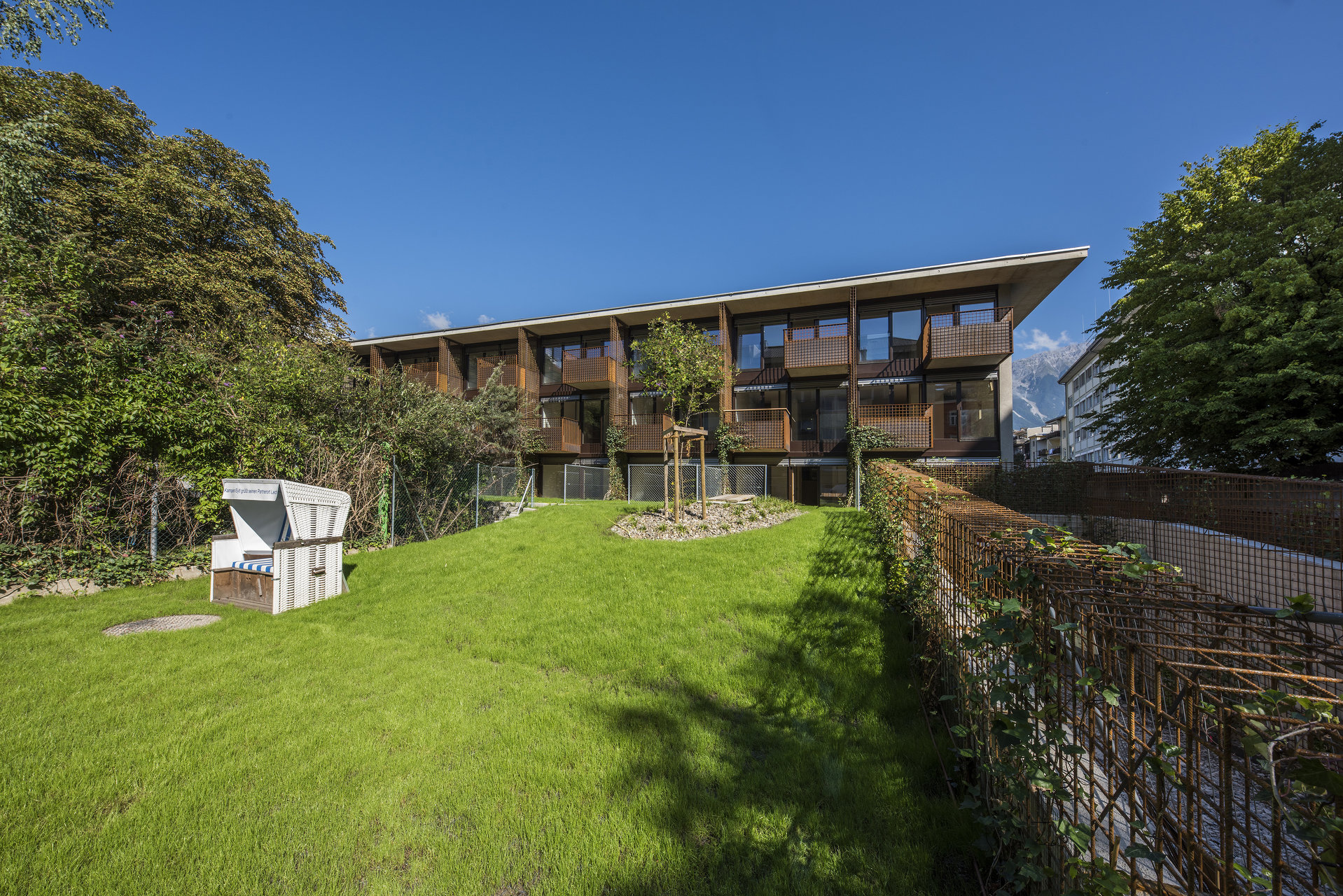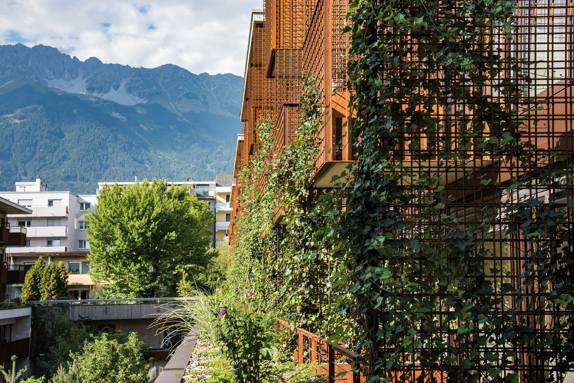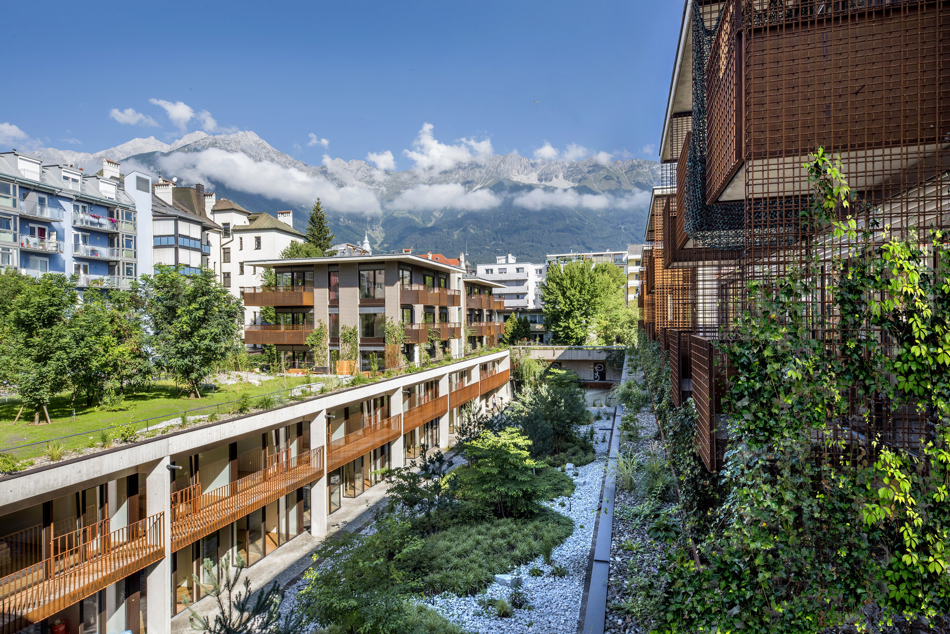 Ursprünglich befanden sich auf dem großen Innenhof zwischen Speckbacherstraße, Schöpfstraße, Andreas-Hofer-Straße und Franz-Fischer-Straße ein Parkplatz und ein Bürogebäude. Mit dem Ziel einer möglichst geringen Beeinträchtigung der Anrainer entstand der Neubau mit ca. 120 Wohnungen nach dem Konzept einer „sunken plaza“, d. h. als Verdichtung nach unten. Zwei unterirdische Wohngeschoße öffnen sich zu einem abgegrabenen Innhof, die drei Obergeschoße wurden auf mehrere einzelne Häuser mit begrünten Dächern und Fassaden verteilt. Die 1- bis 4-Zimmer-Wohnungen bieten mit gut durchdachten Grundrissen viel Platz auf wenig Raum. Jeder Einheit – von den atelierartigen Erdgeschoßwohnungen bis zu Dachgeschoßapartments mit dreiseitiger Belichtung – ist ein privater Freiraum in Form von Gartenflächen, Balkonen und Terrassen zugeordnet. (Text: Claudia Wedekind)