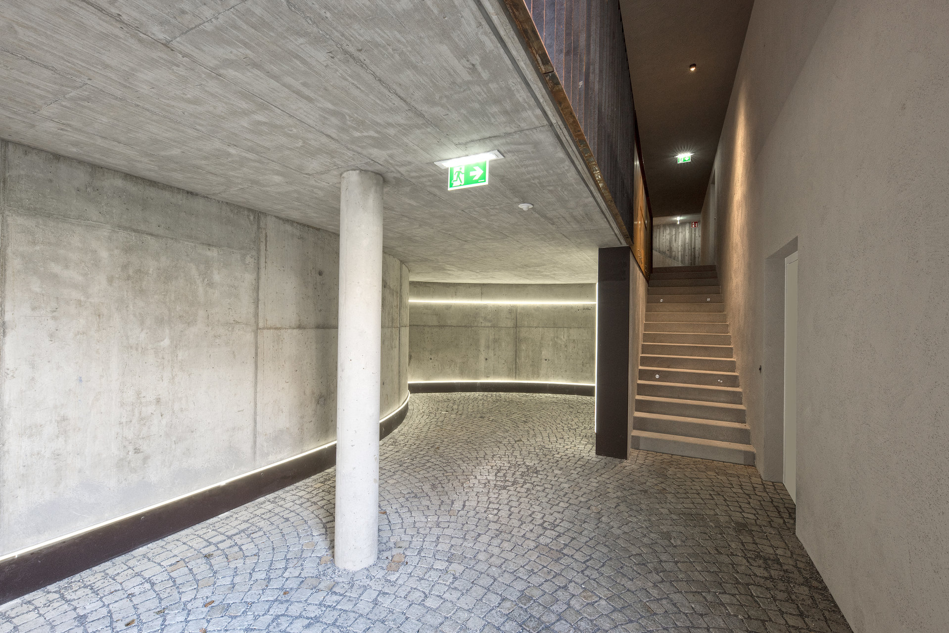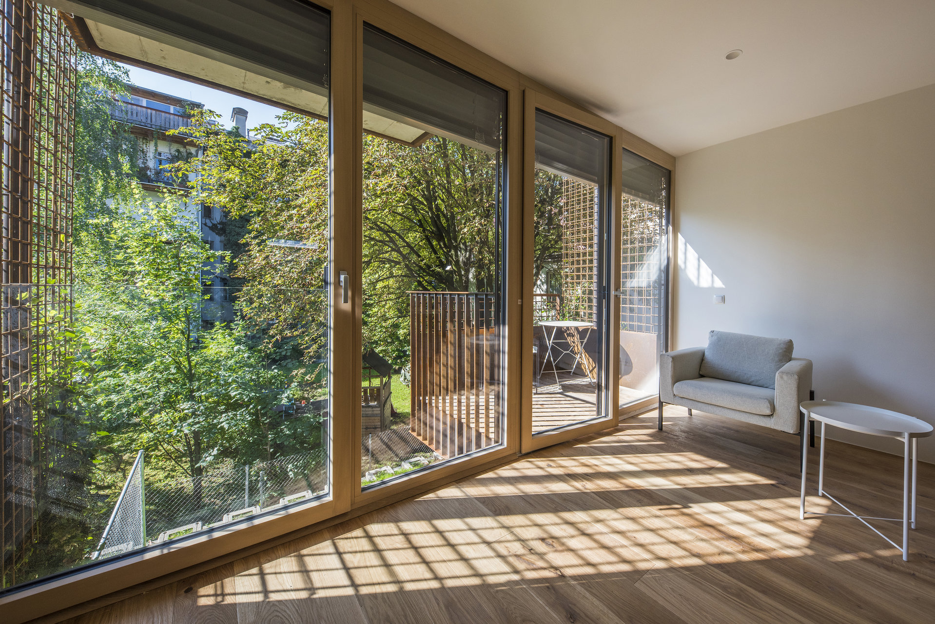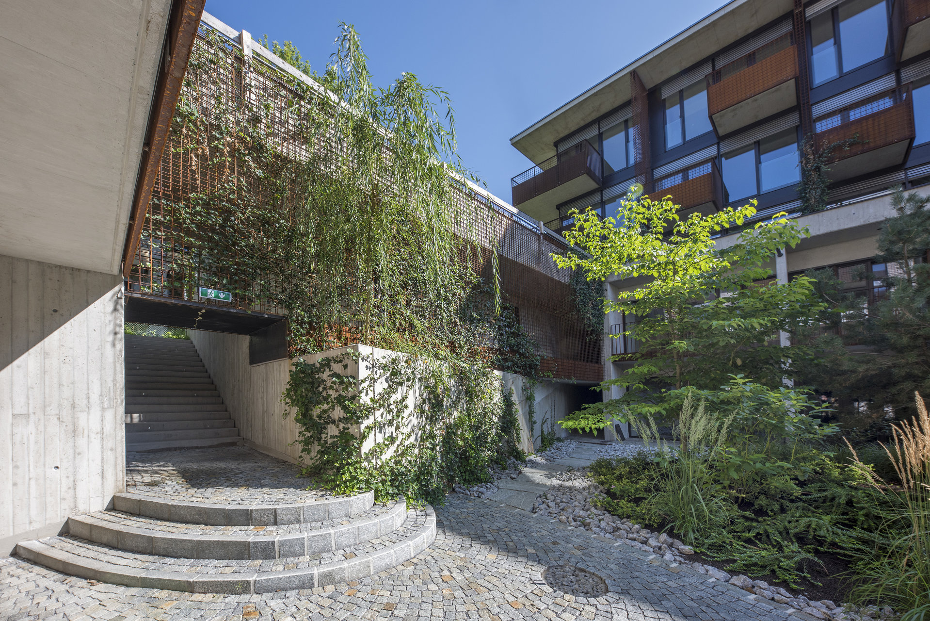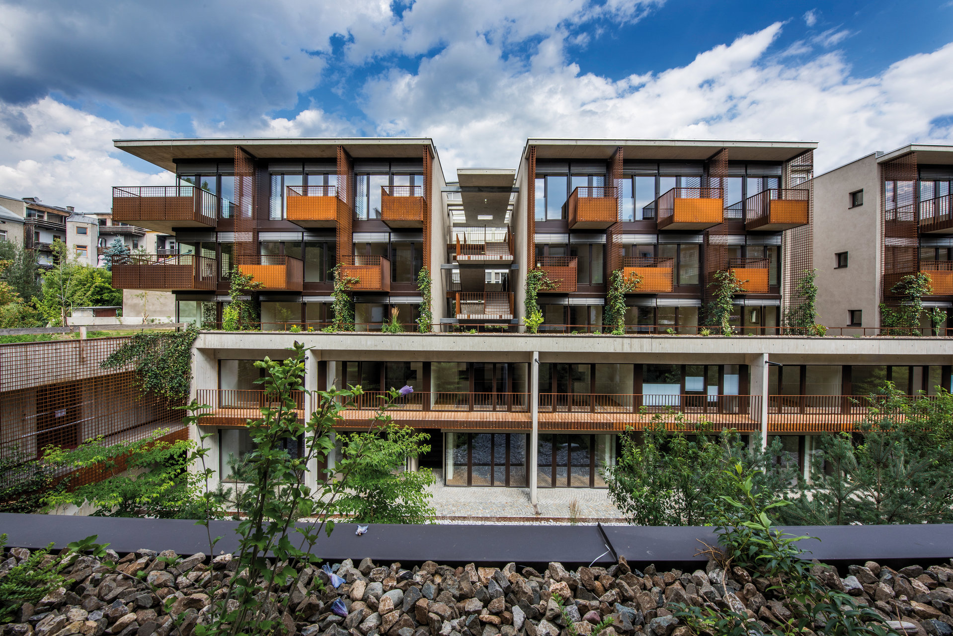 Ursprünglich befanden sich auf dem großen Innenhof zwischen Speckbacherstraße, Schöpfstraße, Andreas-Hofer-Straße und Franz-Fischer-Straße ein Parkplatz und ein Bürogebäude. Mit dem Ziel einer möglichst geringen Beeinträchtigung der Anrainer entstand der Neubau mit ca. 120 Wohnungen nach dem Konzept einer „sunken plaza“, d. h. als Verdichtung nach unten. Zwei unterirdische Wohngeschoße öffnen sich zu einem abgegrabenen Innhof, die drei Obergeschoße wurden auf mehrere einzelne Häuser mit begrünten Dächern und Fassaden verteilt. Die 1- bis 4-Zimmer-Wohnungen bieten mit gut durchdachten Grundrissen viel Platz auf wenig Raum. Jeder Einheit – von den atelierartigen Erdgeschoßwohnungen bis zu Dachgeschoßapartments mit dreiseitiger Belichtung – ist ein privater Freiraum in Form von Gartenflächen, Balkonen und Terrassen zugeordnet. (Text: Claudia Wedekind)