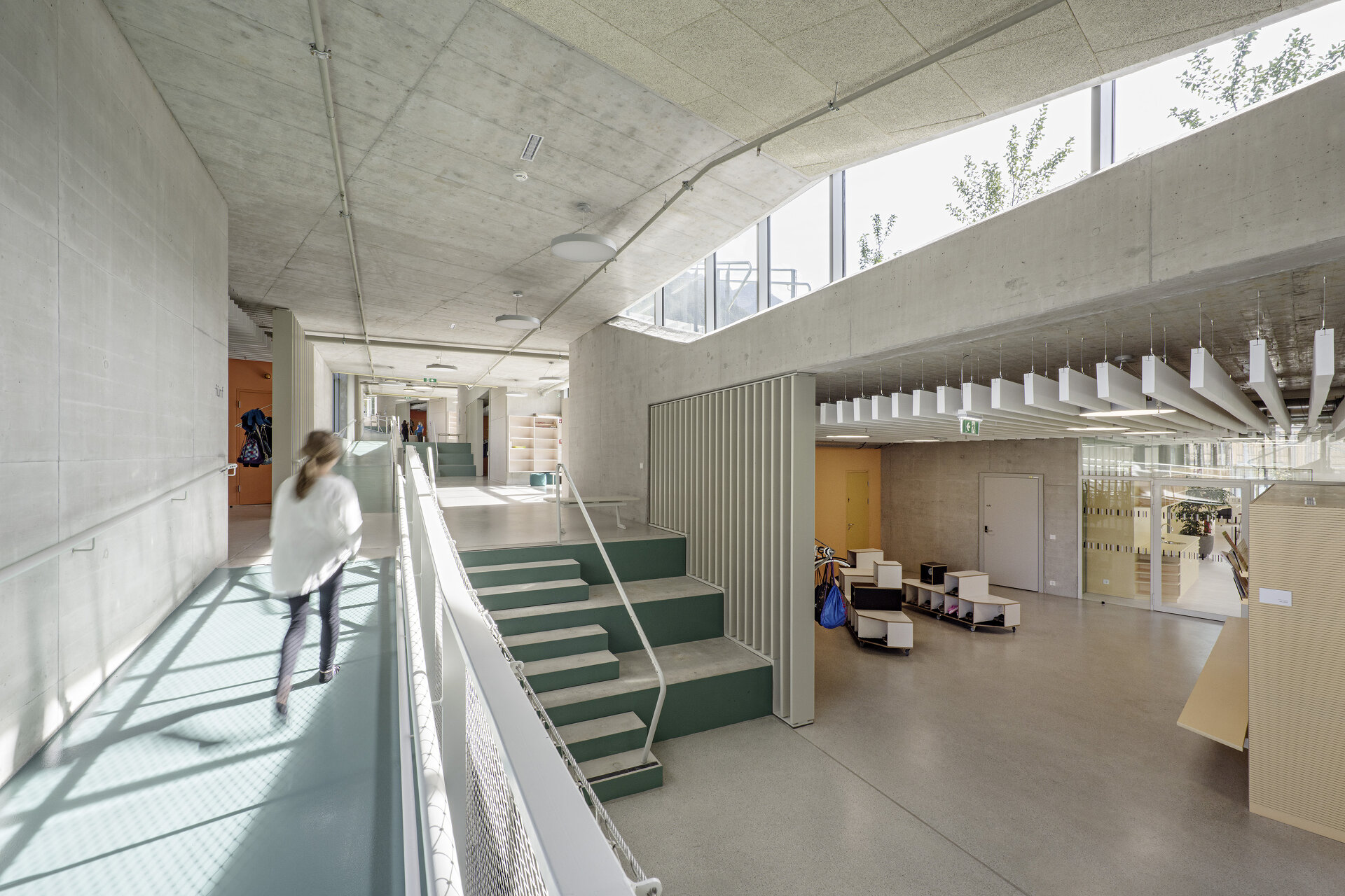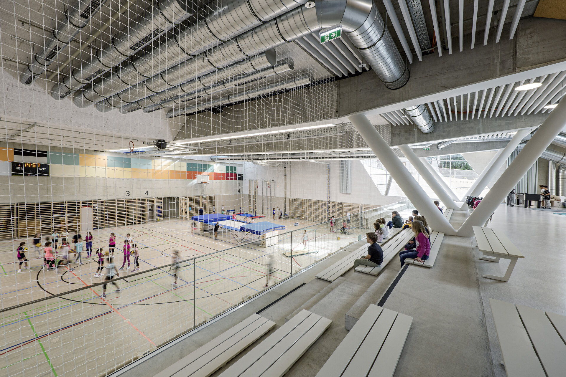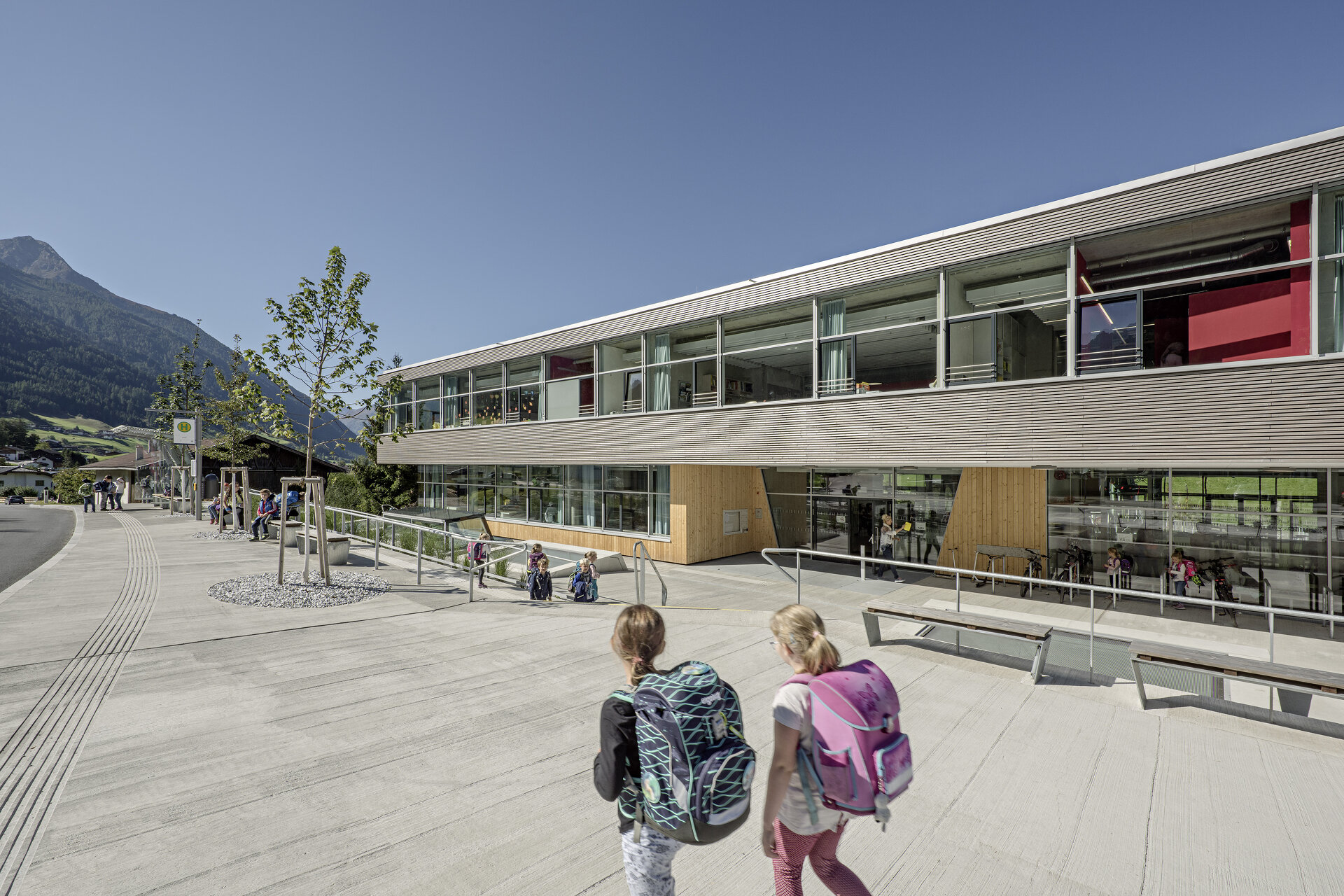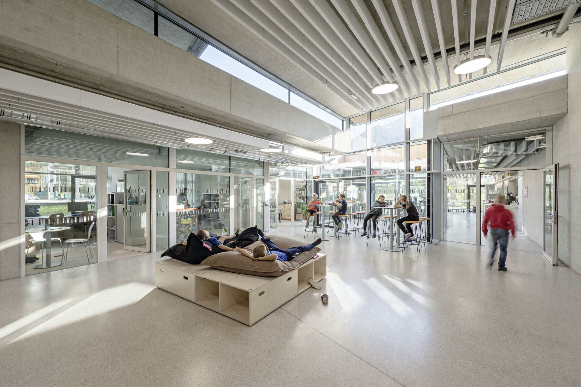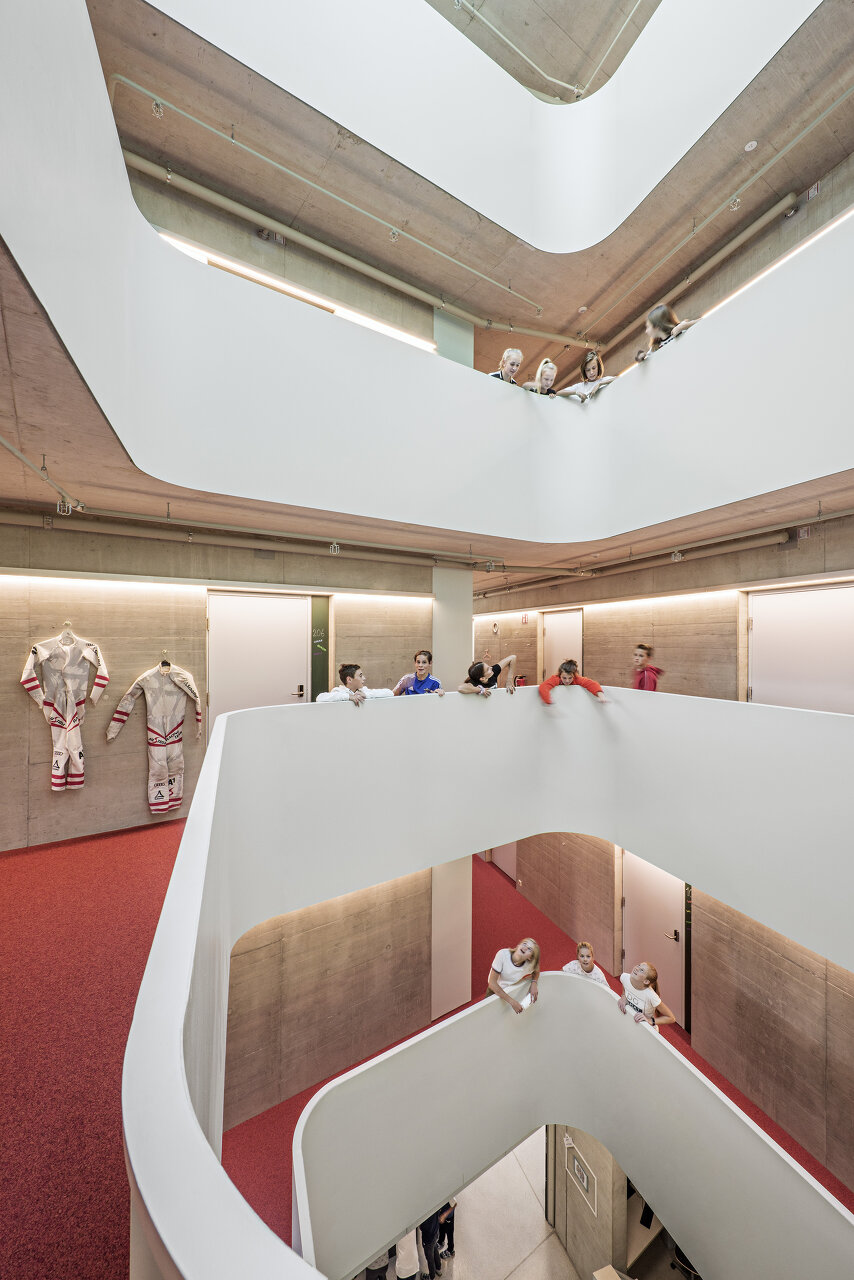 fasch&fuchs.architekten antworteten auf die in diesem Prozess entwickelten Anforderungen mit einem teppichartigen Schulcampus, der sich auf dem leicht abfallenden Hanggrundstück zwischen zwei Kopfgebäuden entwickelt. Vom Eingangsbauwerk mit seiner zentralen Aula führt ein terrassierter Indoor-Campus kaskadenartig über Stiegen und Rampen hinunter bis in den Speisesaal des Internatsbaukörpers. Entlang dieser Achse sind die Bereiche der Haupt- und Skihauptschule in einer kammartigen Anlage übersichtlich strukturiert, jeweils mehrere Klassen gruppieren sich um zentrale Lern- und Lebenslandschaften, die alle direkten Zugang zu Freibereichen wie den grünen Dachterrassen oder intimeren Höfen besitzen. (Text: Claudia Wedekind)