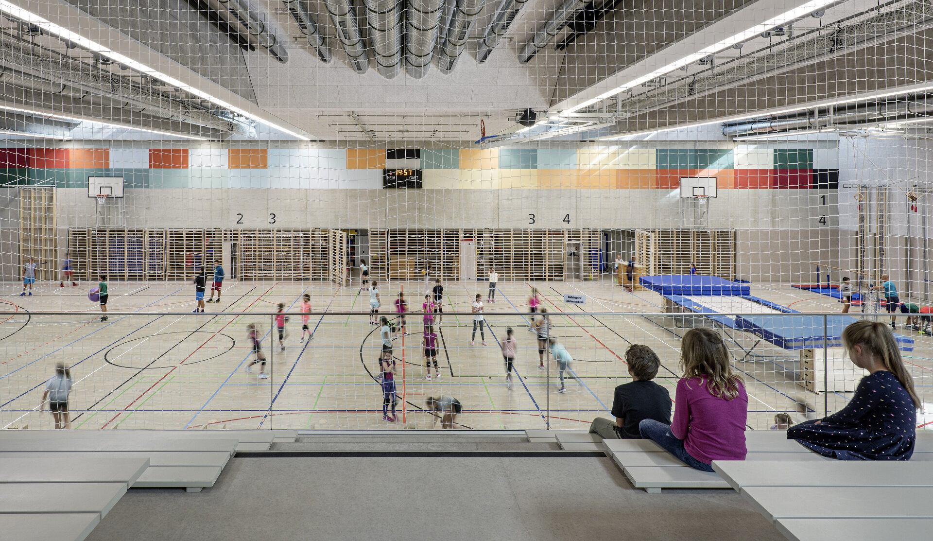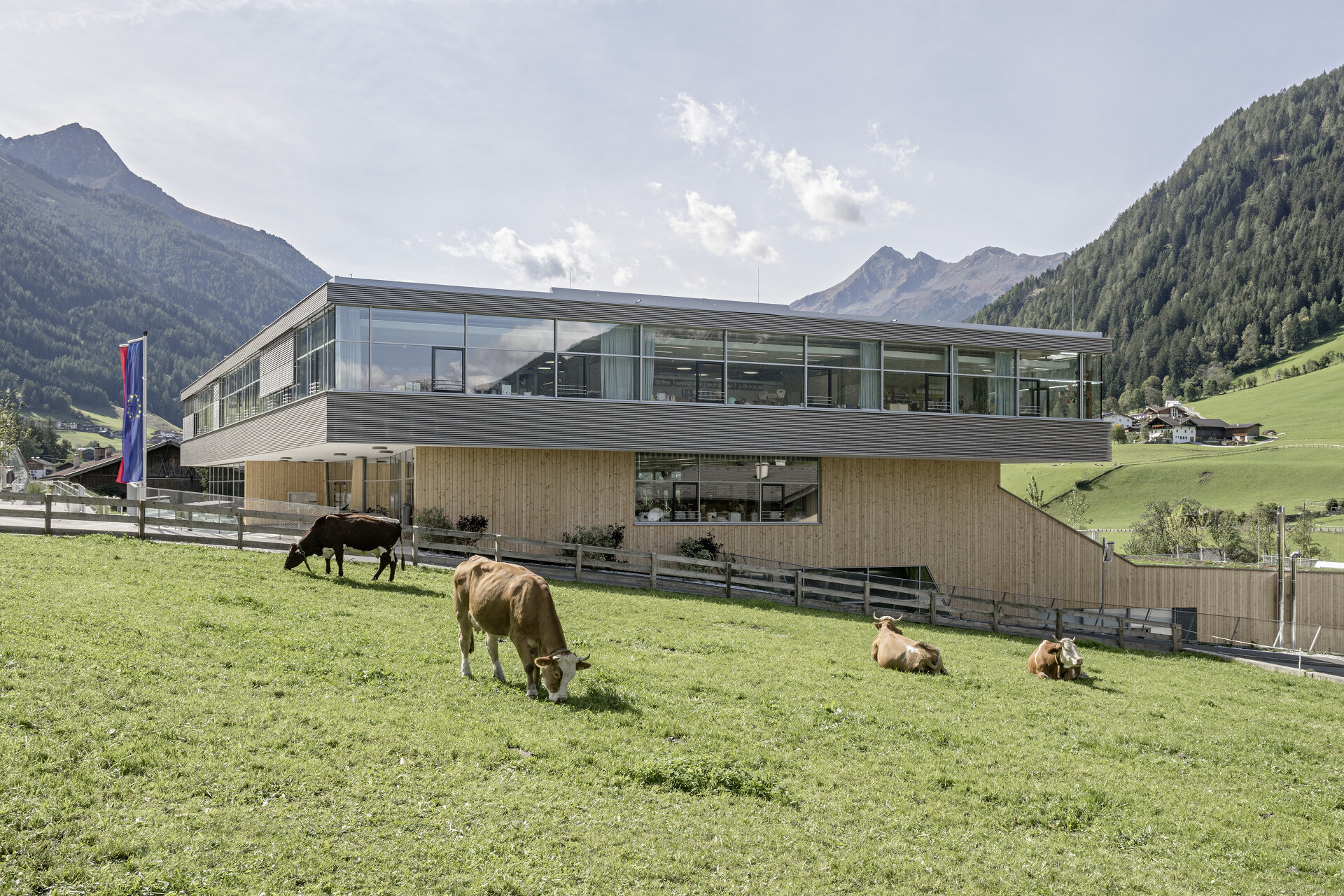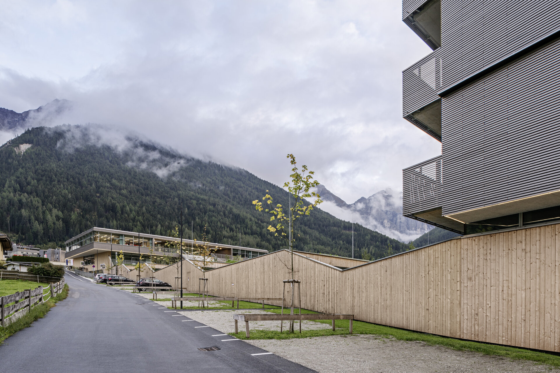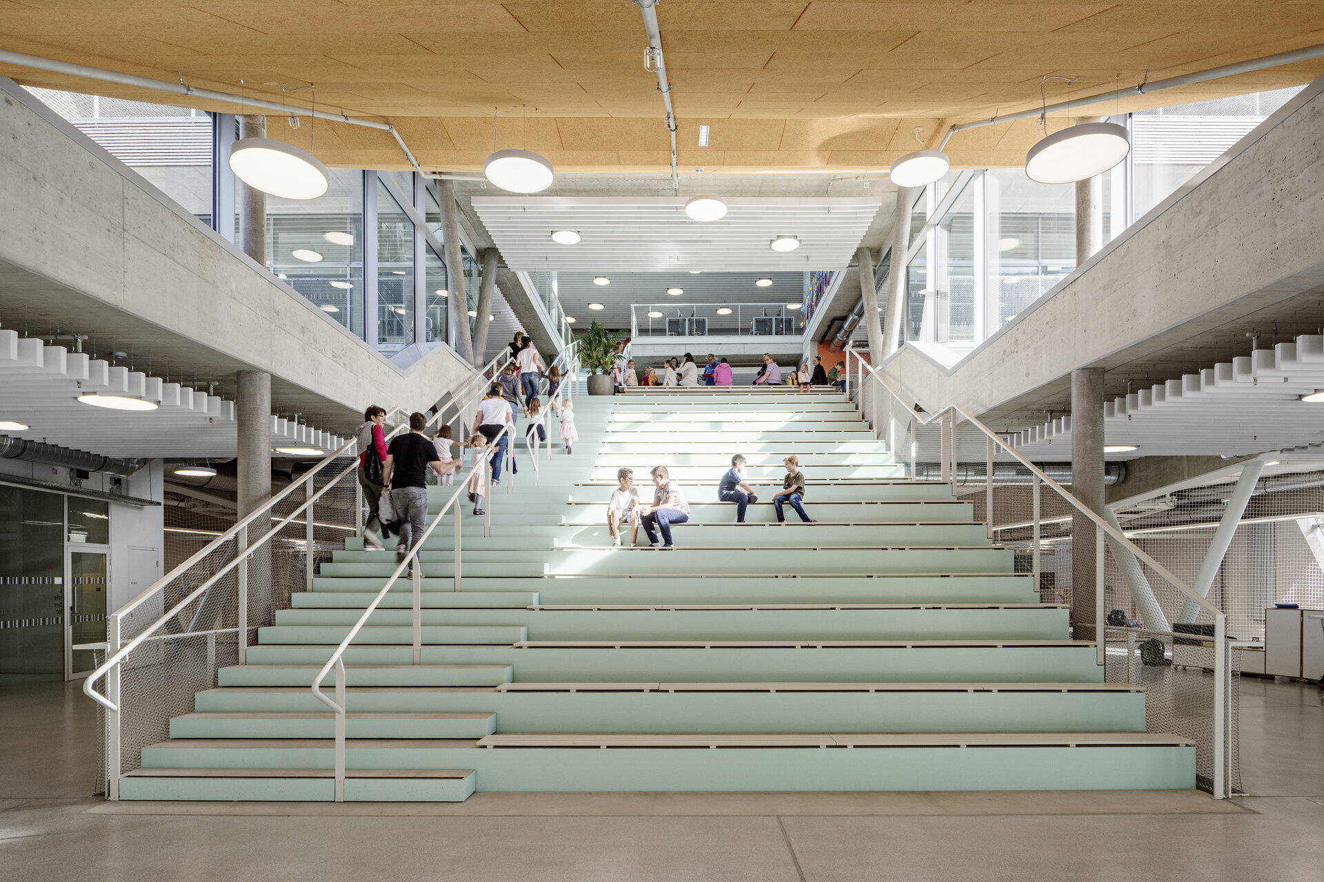 fasch&fuchs.architekten antworteten auf die in diesem Prozess entwickelten Anforderungen mit einem teppichartigen Schulcampus, der sich auf dem leicht abfallenden Hanggrundstück zwischen zwei Kopfgebäuden entwickelt. Vom Eingangsbauwerk mit seiner zentralen Aula führt ein terrassierter Indoor-Campus kaskadenartig über Stiegen und Rampen hinunter bis in den Speisesaal des Internatsbaukörpers. Entlang dieser Achse sind die Bereiche der Haupt- und Skihauptschule in einer kammartigen Anlage übersichtlich strukturiert, jeweils mehrere Klassen gruppieren sich um zentrale Lern- und Lebenslandschaften, die alle direkten Zugang zu Freibereichen wie den grünen Dachterrassen oder intimeren Höfen besitzen. (Text: Claudia Wedekind)