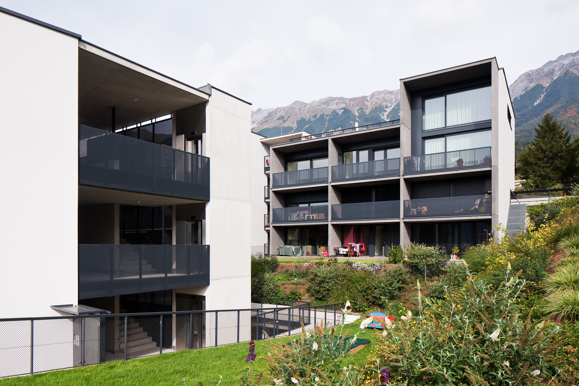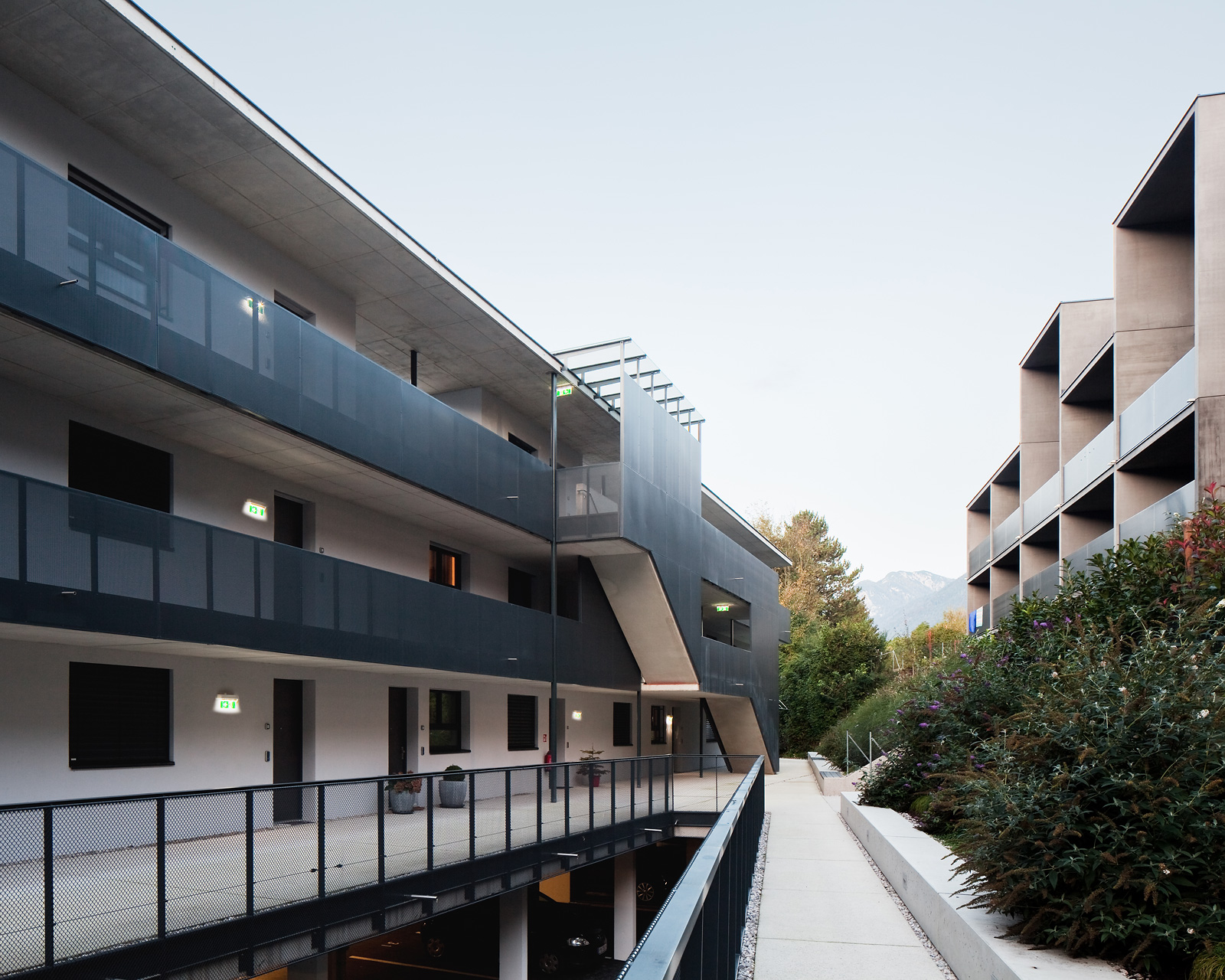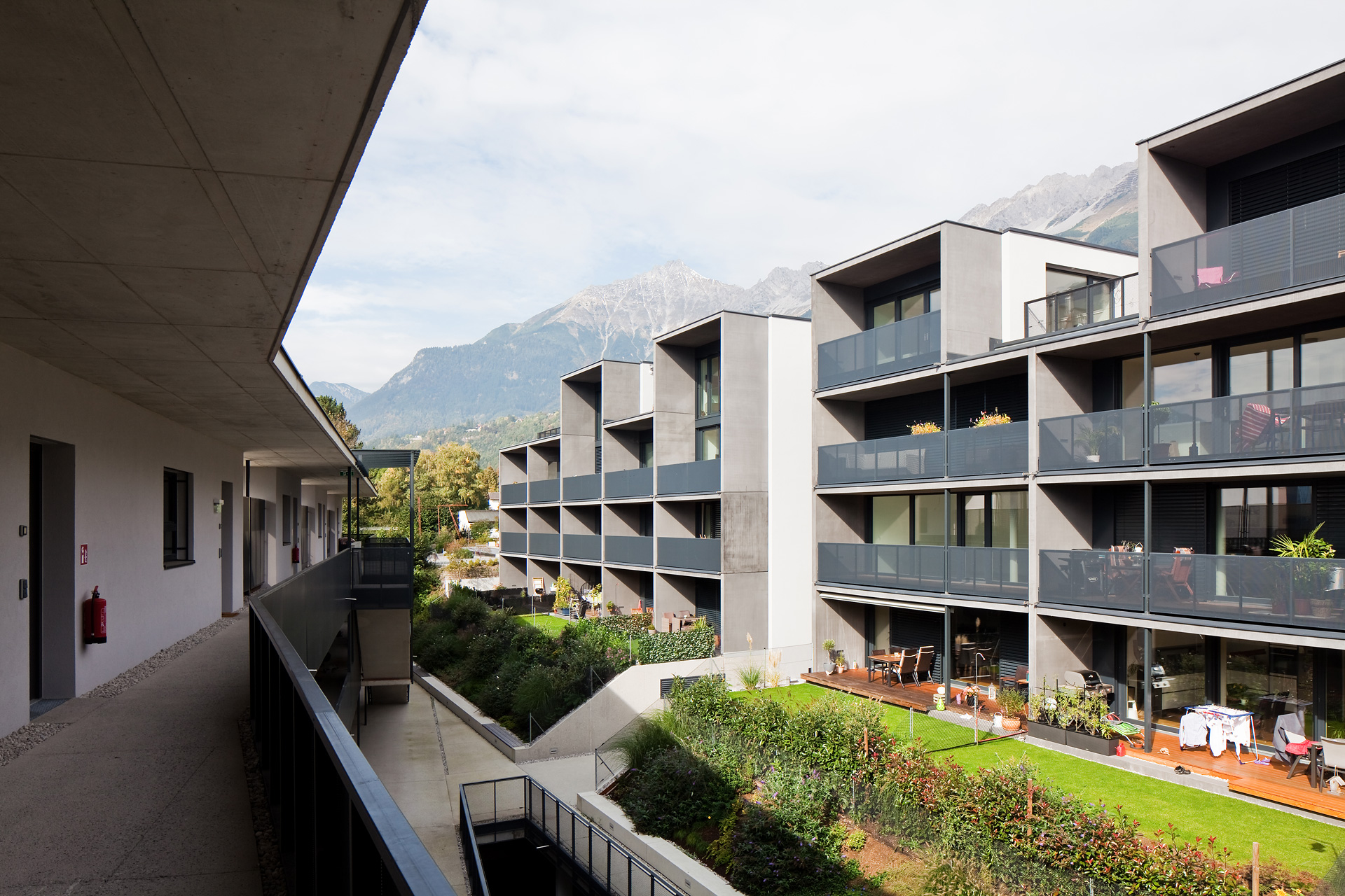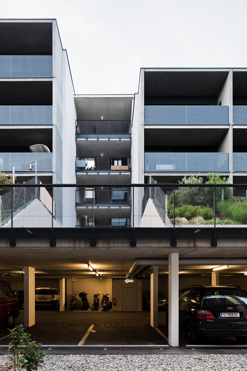 In der Kreuzgasse 32-34 wurden zwei südorientierte, terrassierte Gebäudezeilen mit 52 Wohnungen errichtet. Die unterschiedliche Höhenlage maximiert die Wohnqualität und sorgt auch im Erdgeschoss für Sonne und Ausblick. Das gesamte Grundstück bleibt verkehrsfrei. Die Garage gruppiert sich um einen teilweise offenen, begrünten Innenhof, der ausreichend Tageslicht einfallen lässt und für die Bewohner eine sichere, angenehme Zufahrt bedeutet. Die Südfassade öffnet sich mit großflächigen Fensterfronten, die Nordfassade ist bis auf die notwendigen Oberlichten weitgehend geschlossen – so erzielt man eine sehr gute Energiebilanz.