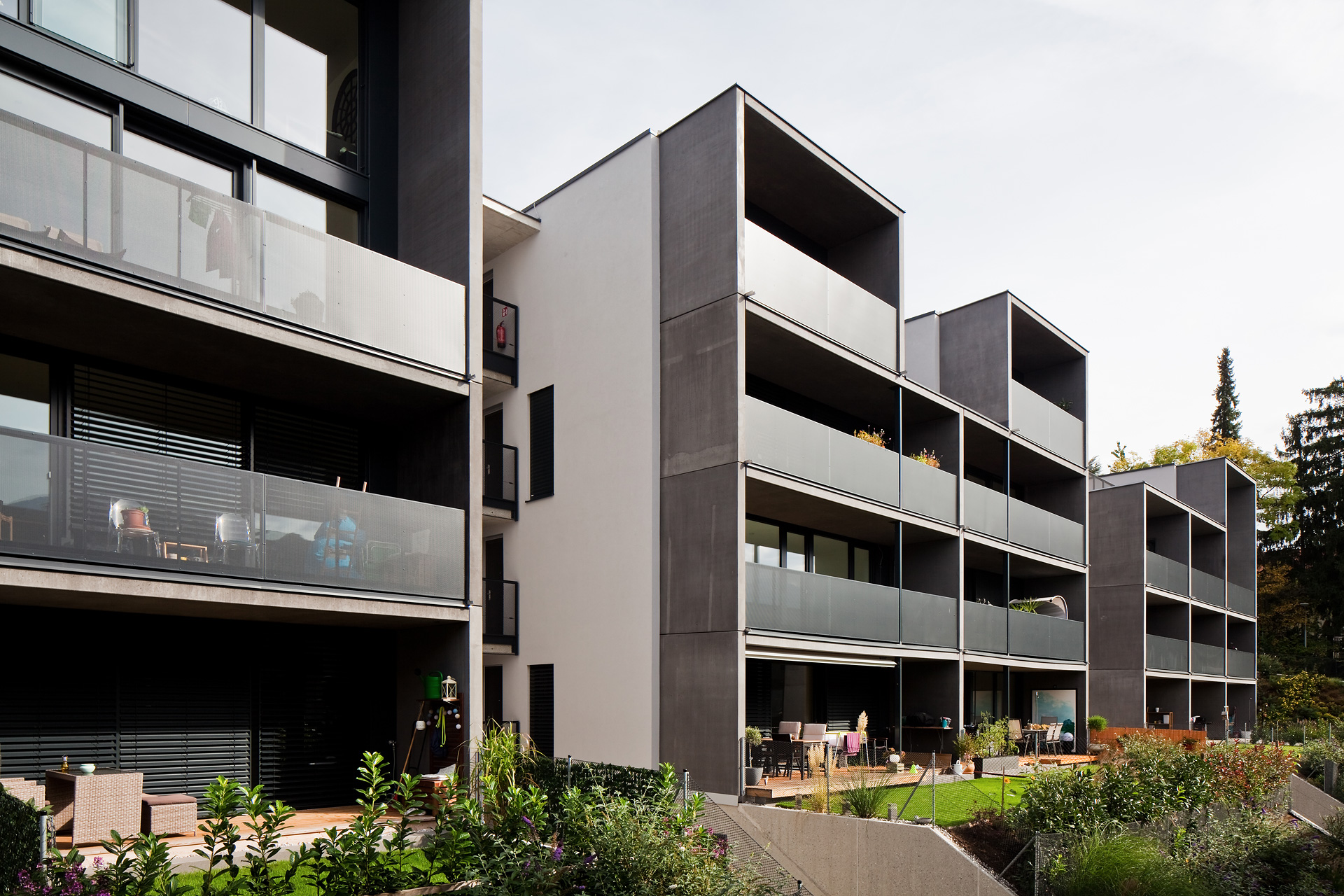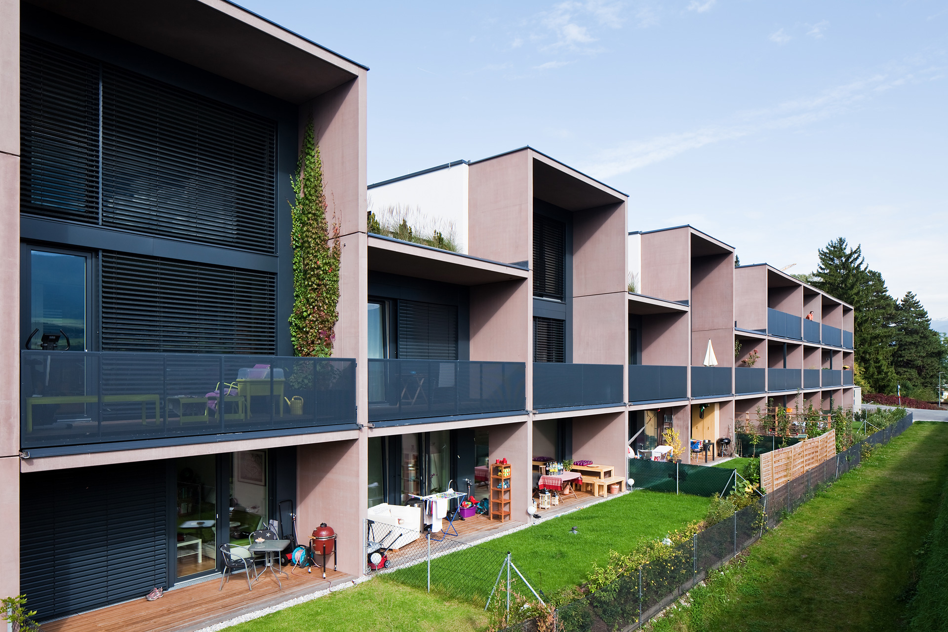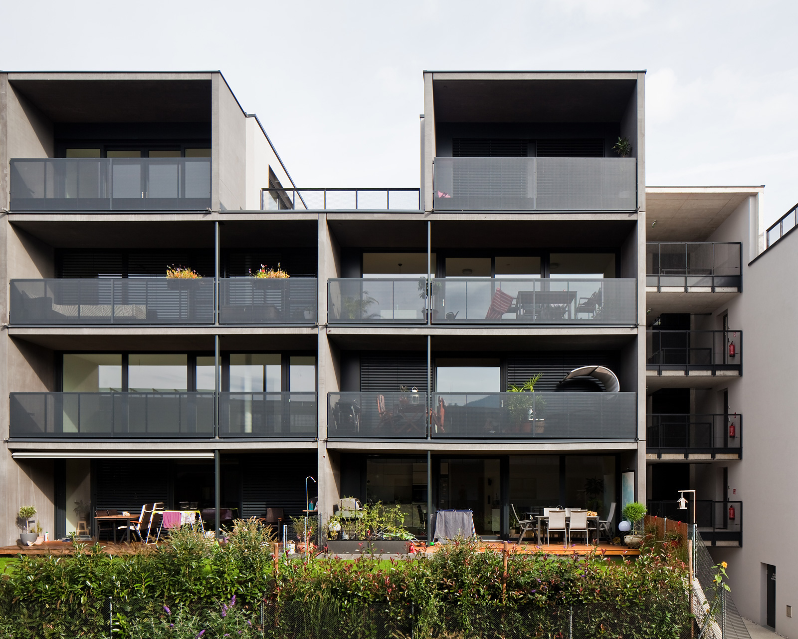 In der Kreuzgasse 32-34 wurden zwei südorientierte, terrassierte Gebäudezeilen mit 52 Wohnungen errichtet. Die unterschiedliche Höhenlage maximiert die Wohnqualität und sorgt auch im Erdgeschoss für Sonne und Ausblick. Das gesamte Grundstück bleibt verkehrsfrei. Die Garage gruppiert sich um einen teilweise offenen, begrünten Innenhof, der ausreichend Tageslicht einfallen lässt und für die Bewohner eine sichere, angenehme Zufahrt bedeutet. Die Südfassade öffnet sich mit großflächigen Fensterfronten, die Nordfassade ist bis auf die notwendigen Oberlichten weitgehend geschlossen – so erzielt man eine sehr gute Energiebilanz.