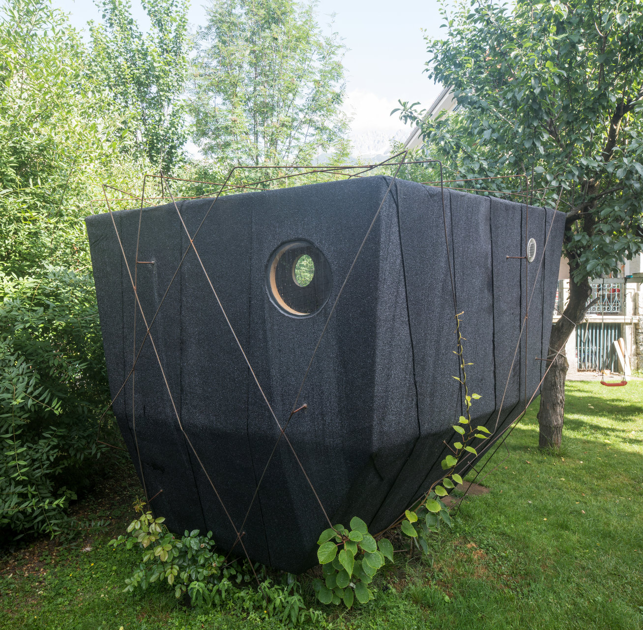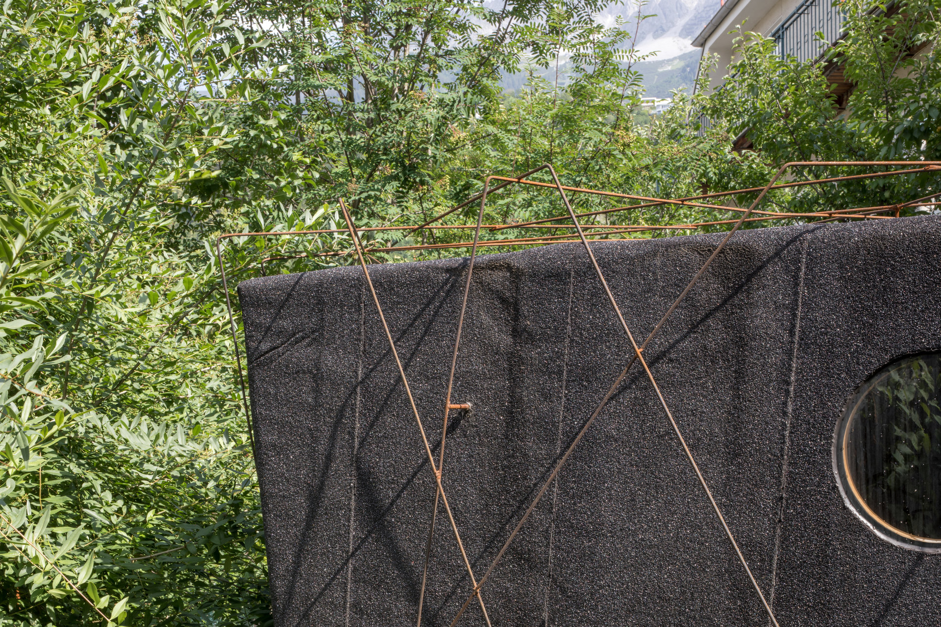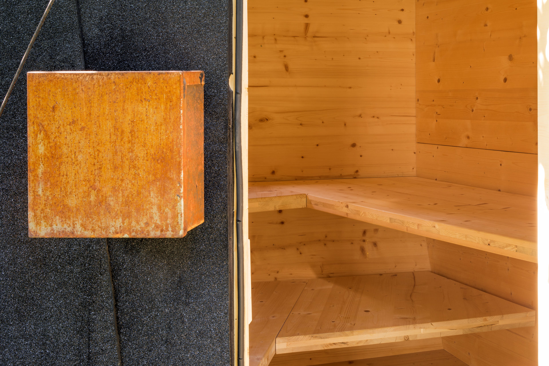 Einfach bauen: die Form wurde im 3D Zeichenprogramm entwickelt, direkt ins Abbundprogramm des Holzherstellers übertragen und mit rechnergesteuerten Fräsen aus Brettsperrholzplatten herausgeschnitten. Vor Ort wurden die Platten im Selbstbau miteinander verbunden und mit einer schützenden Bitumendachhaut umhüllt. Hochofenschlacke verleiht der Oberfläche Beständigkeit und ein leichtes Glitzern. Zwei Bullaugen bieten definierte Blicke aus der warmen, hölzernen Schwitzstube in die Bergwelt Innsbrucks.