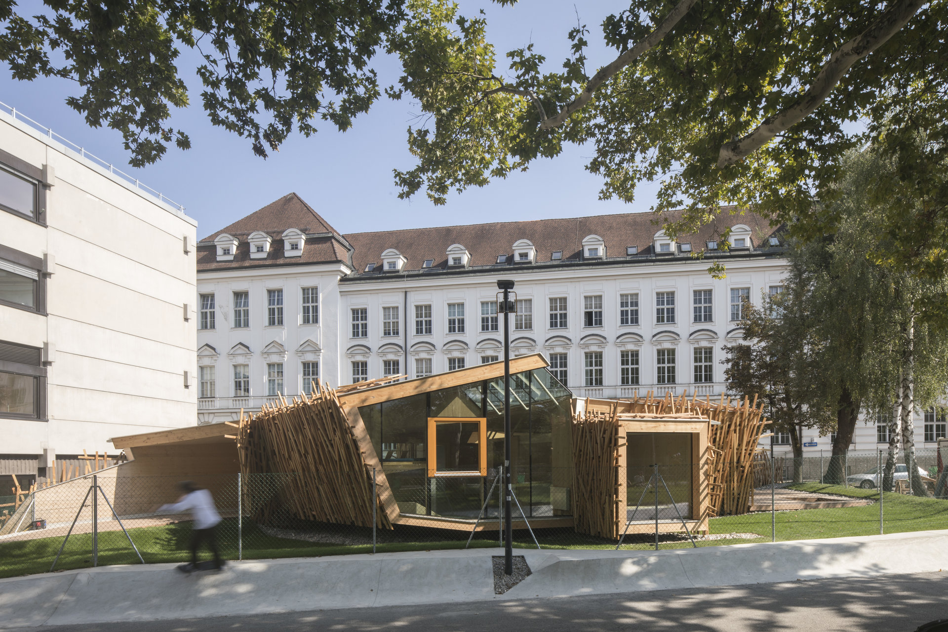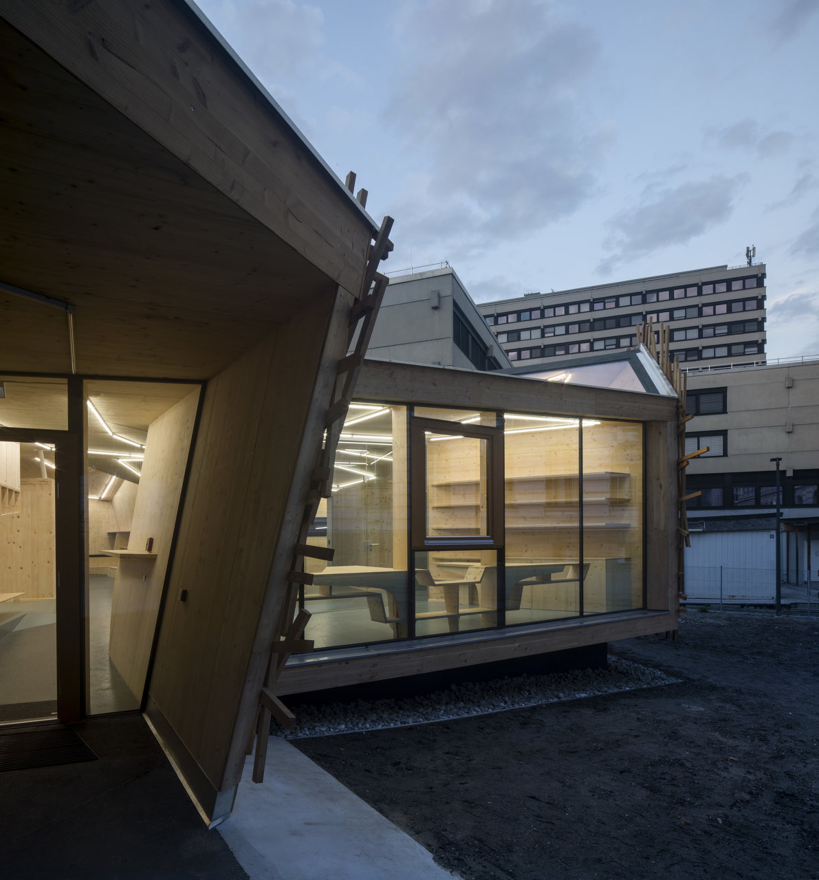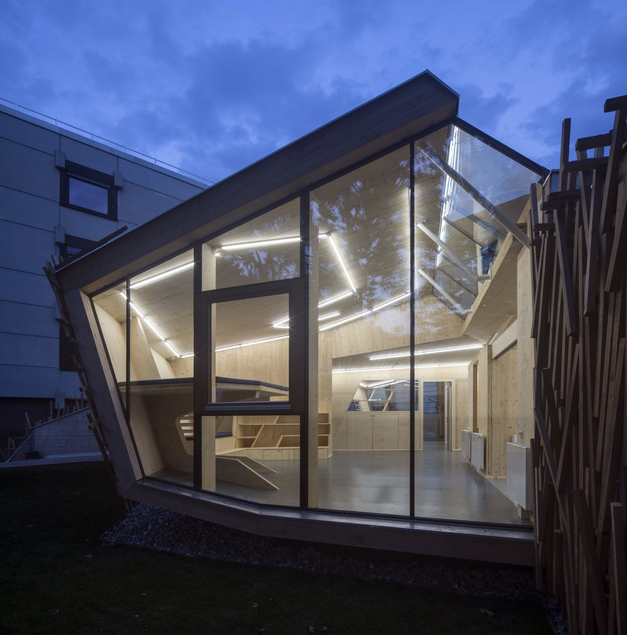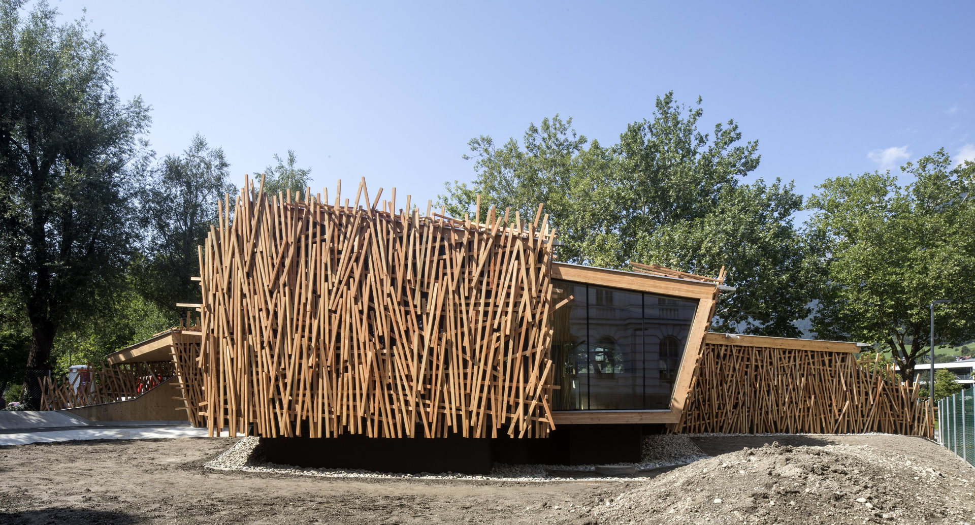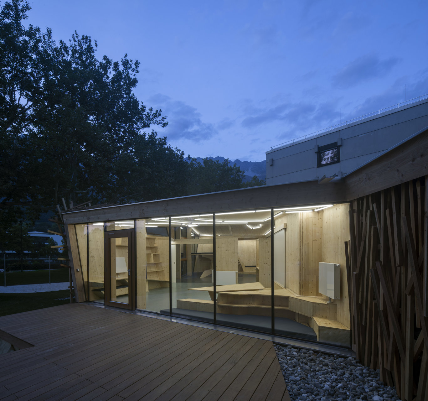 Der in Assoziation an ein Vogelnest mit Holzlatten verkleidete Baukörper öffnet sich über raumhohe Glasfronten Richtung Inn, im Inneren bilden Böden und Wände ein fließendes Kontinuum an Räumen mit unterschiedlichen Atmosphären und Nutzungsmöglichkeiten. Der angrenzende Außenraum wurde neu modelliert und in unterschiedlicher Materialität ausgebildet. (Text: Claudia Wedekind)