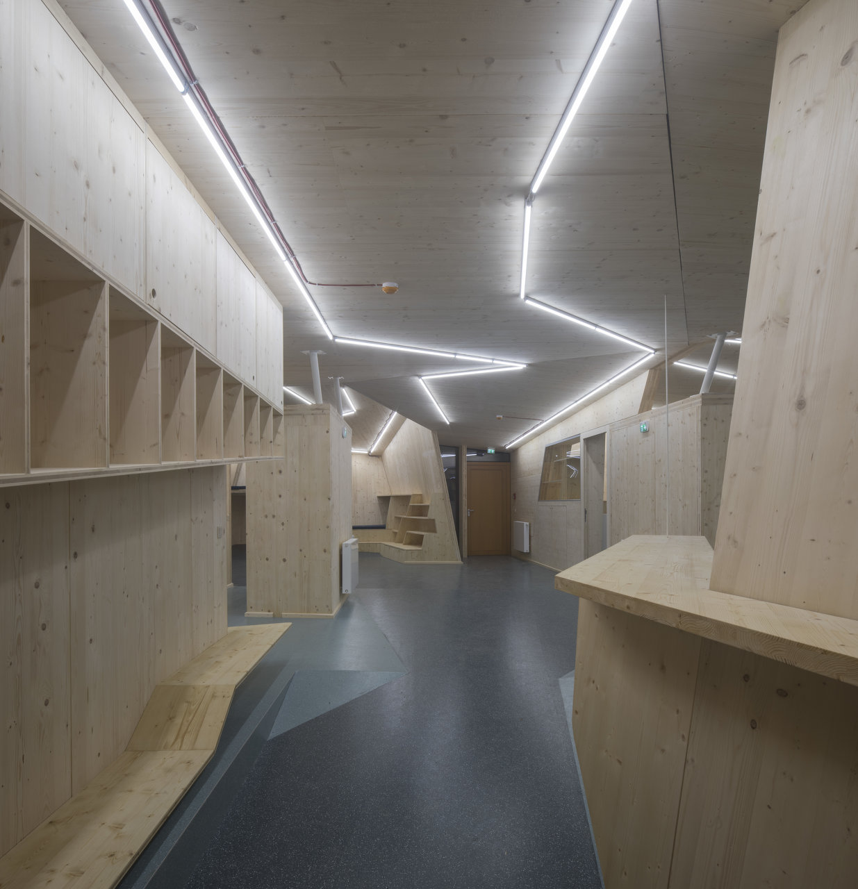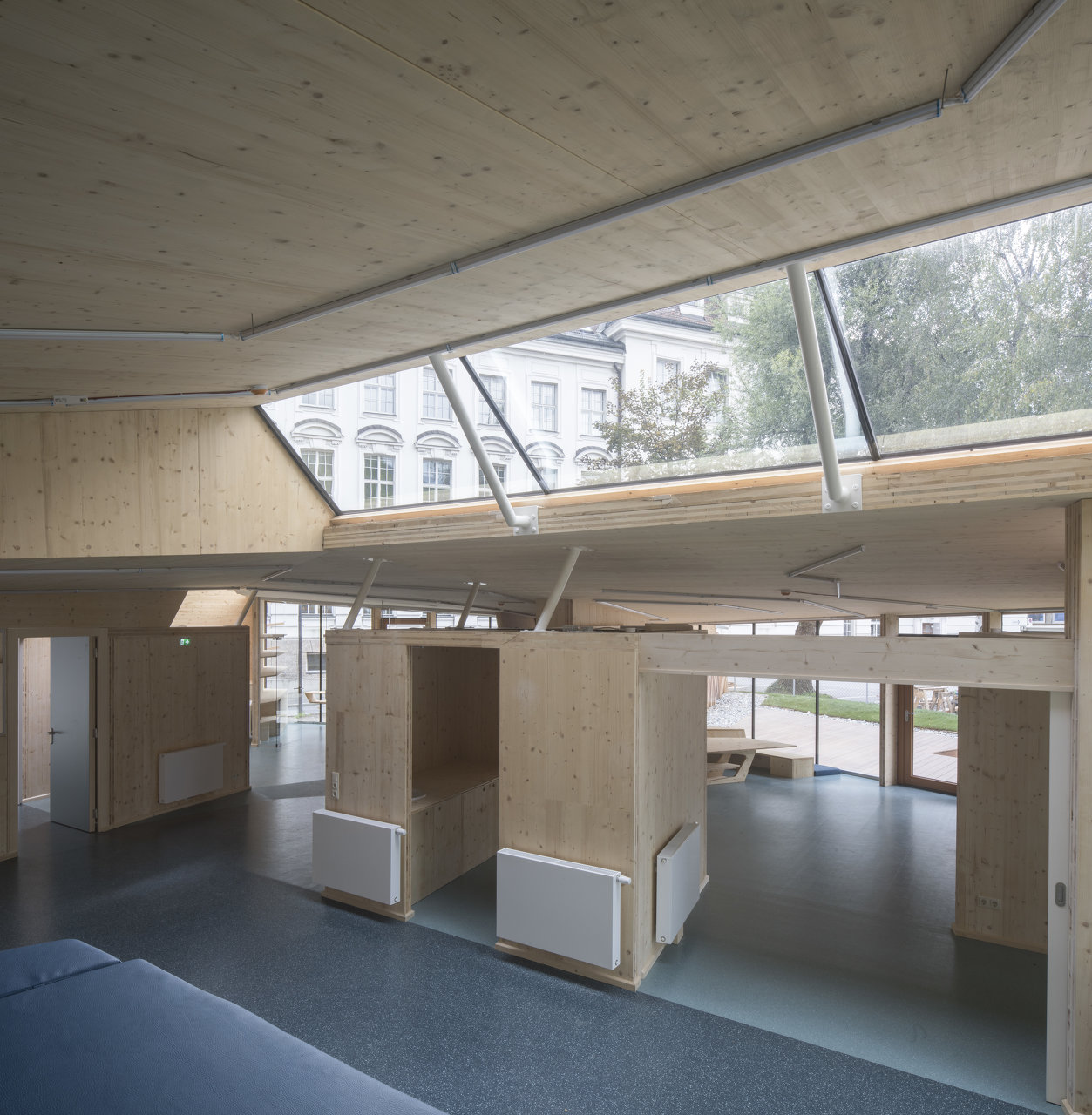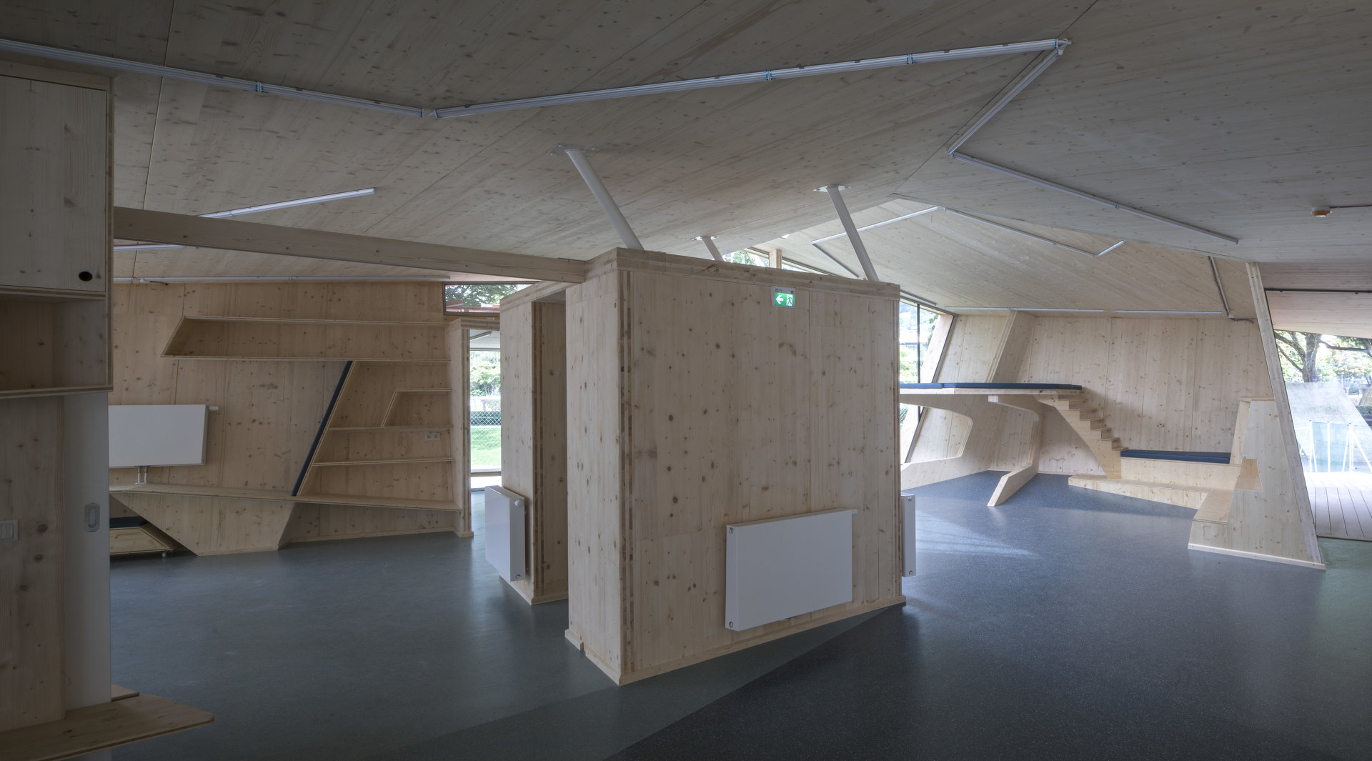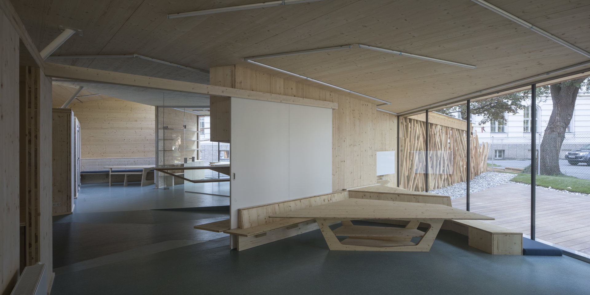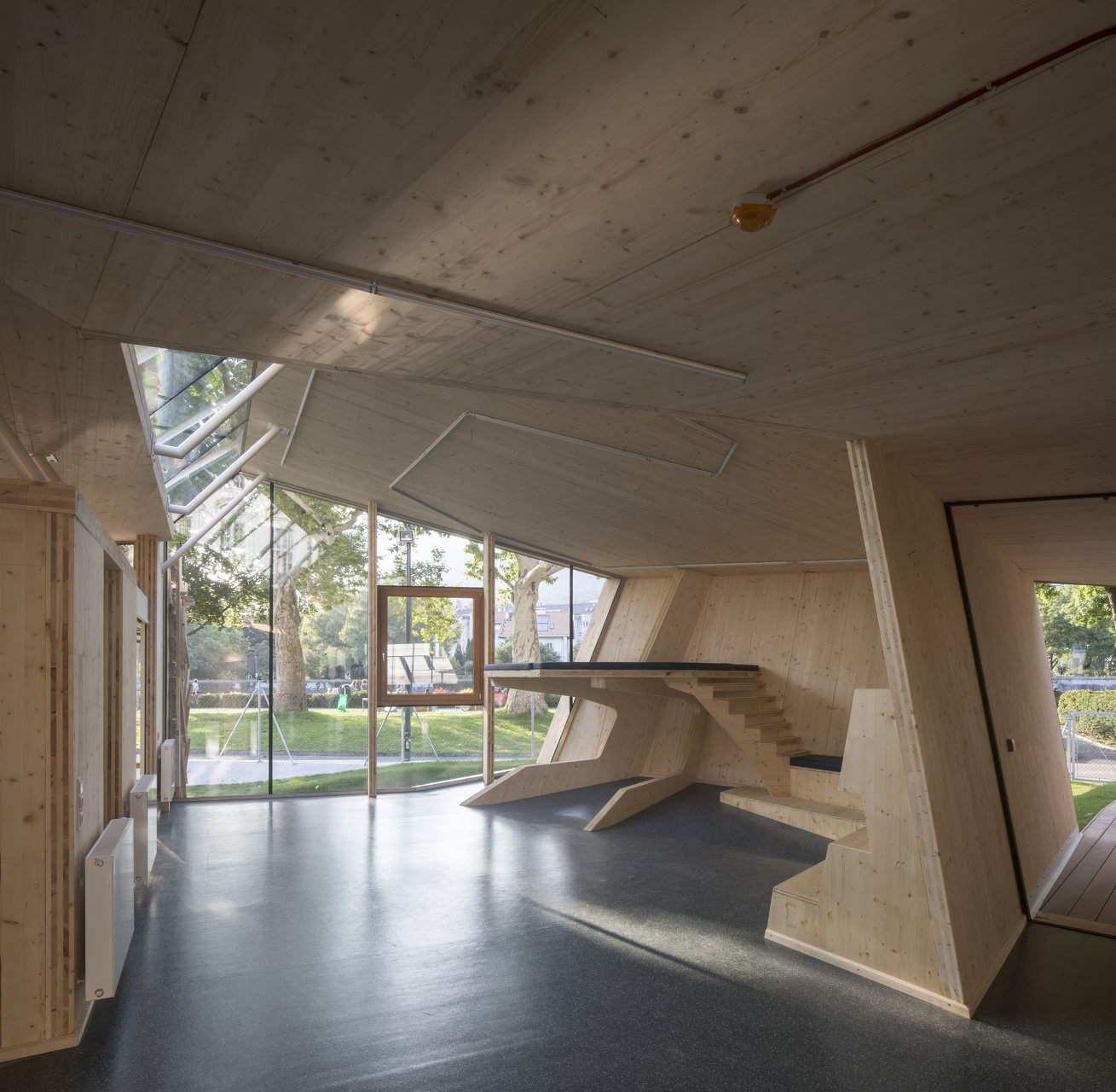 Der in Assoziation an ein Vogelnest mit Holzlatten verkleidete Baukörper öffnet sich über raumhohe Glasfronten Richtung Inn, im Inneren bilden Böden und Wände ein fließendes Kontinuum an Räumen mit unterschiedlichen Atmosphären und Nutzungsmöglichkeiten. Der angrenzende Außenraum wurde neu modelliert und in unterschiedlicher Materialität ausgebildet. (Text: Claudia Wedekind)