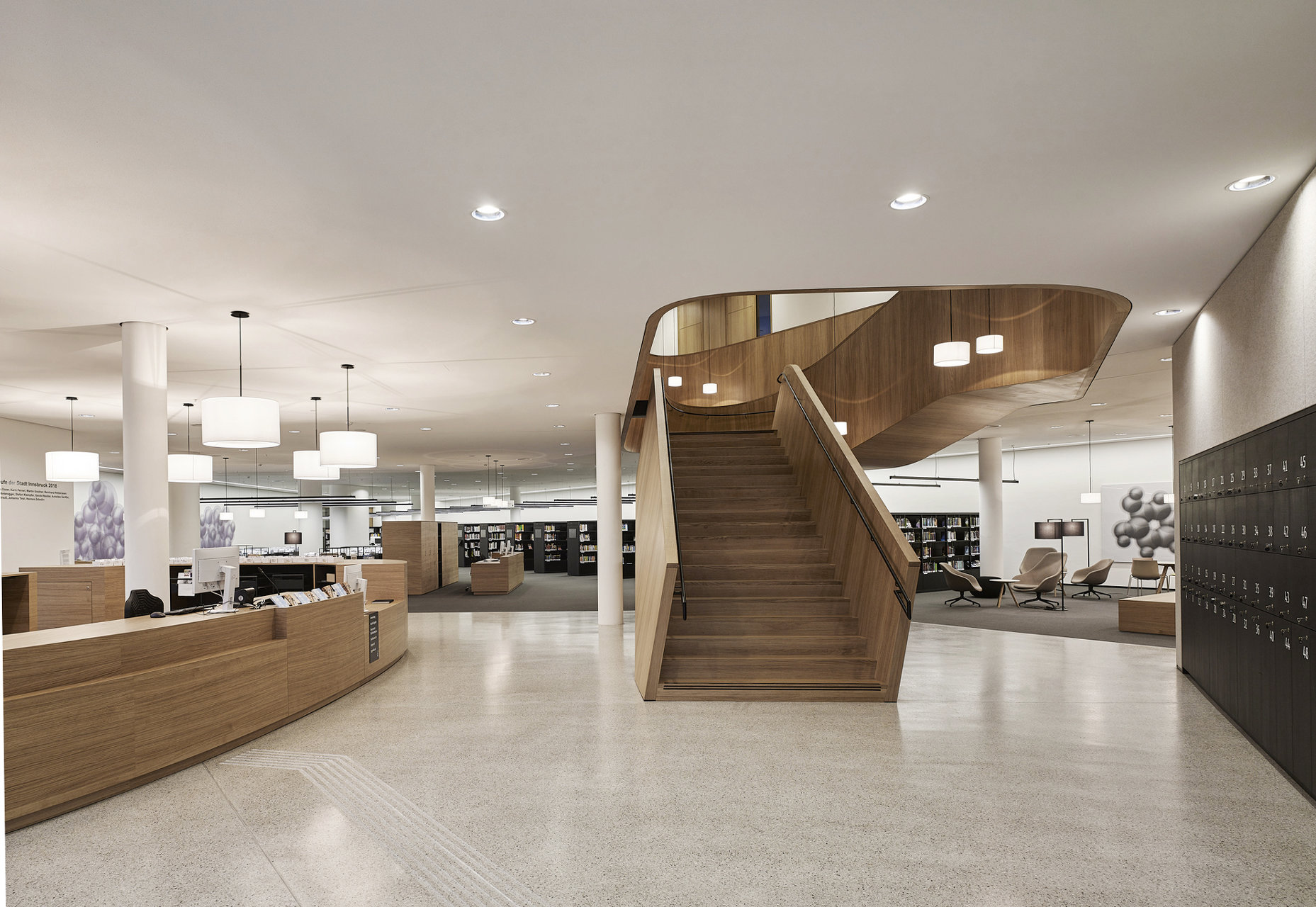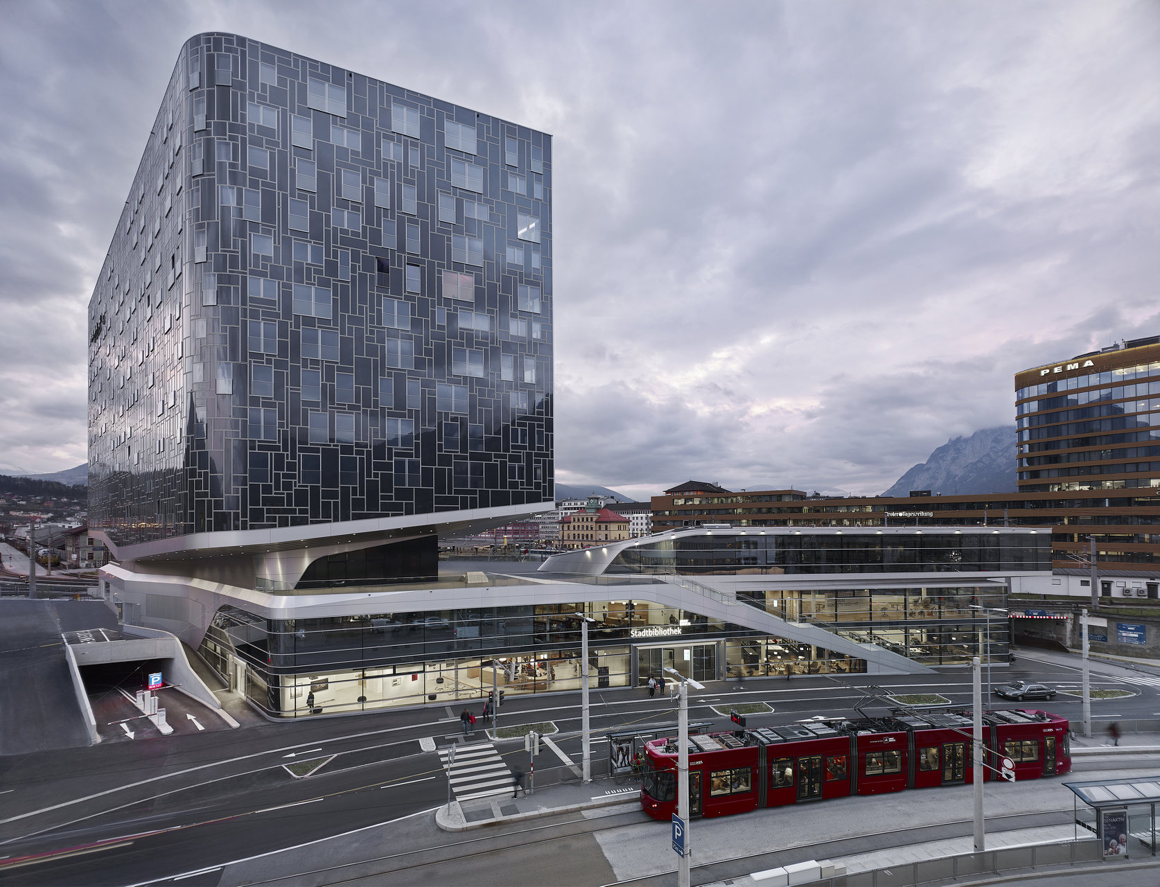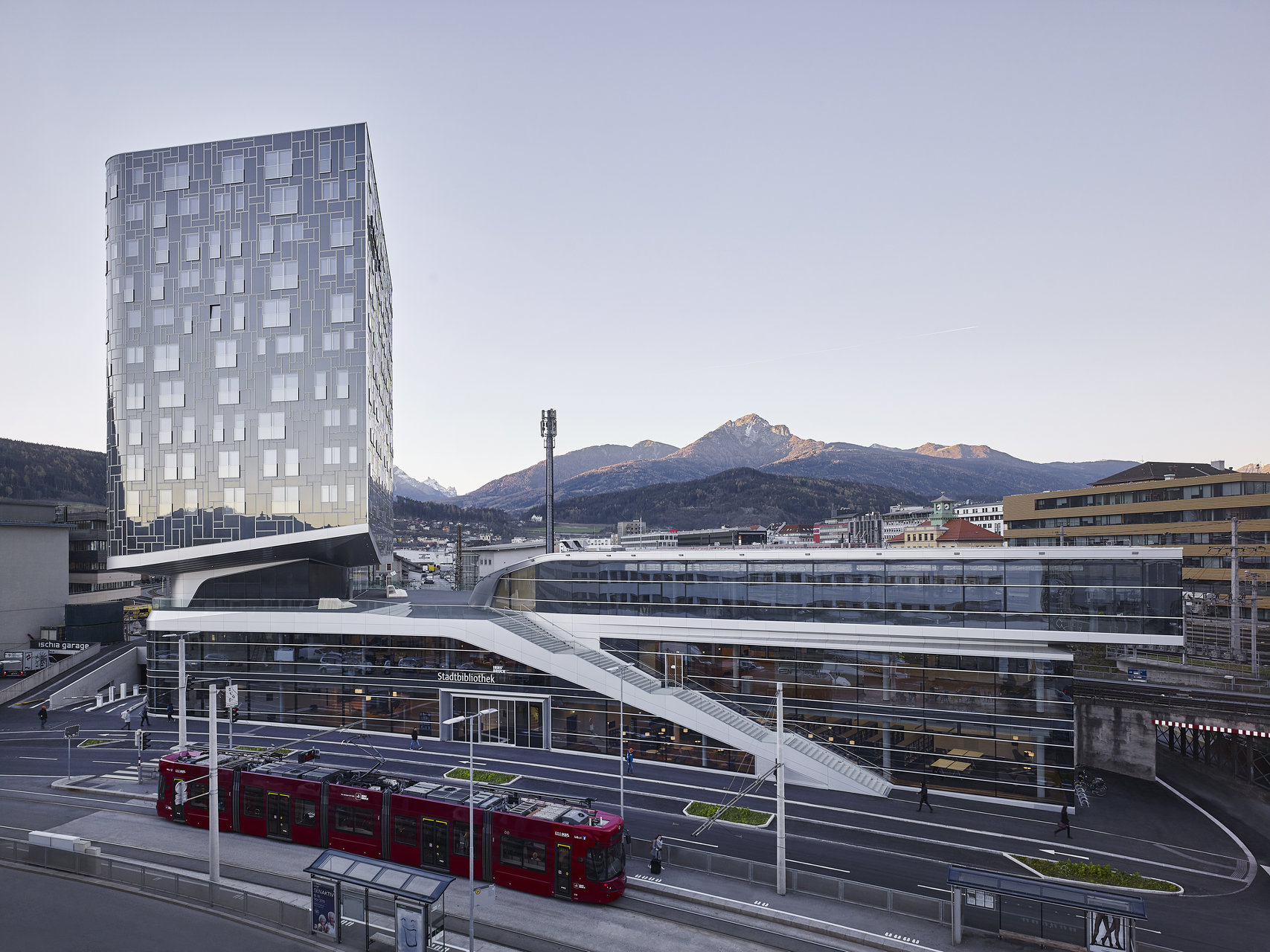 Sozialen und urbanen Mehrwert, wie er für Hochhäuser in Innsbruck gefordert ist (s. Hochhausstudie der Stadt Innsbruck, 2002), soll der auf dem Dach des Sockelgeschoßes zu Verfügung gestellte öffentliche Raum bieten. Der im Kontext der Stadtbibliothek als Lesedeck konzipierte Freiraum ist über Freitreppen im Norden und Süden aus erreichbar, ein öffentliches Bücherregal und Stadtmöbel laden zum konsumfreien Verweilen ein.