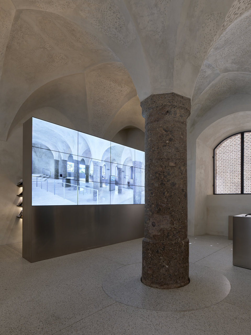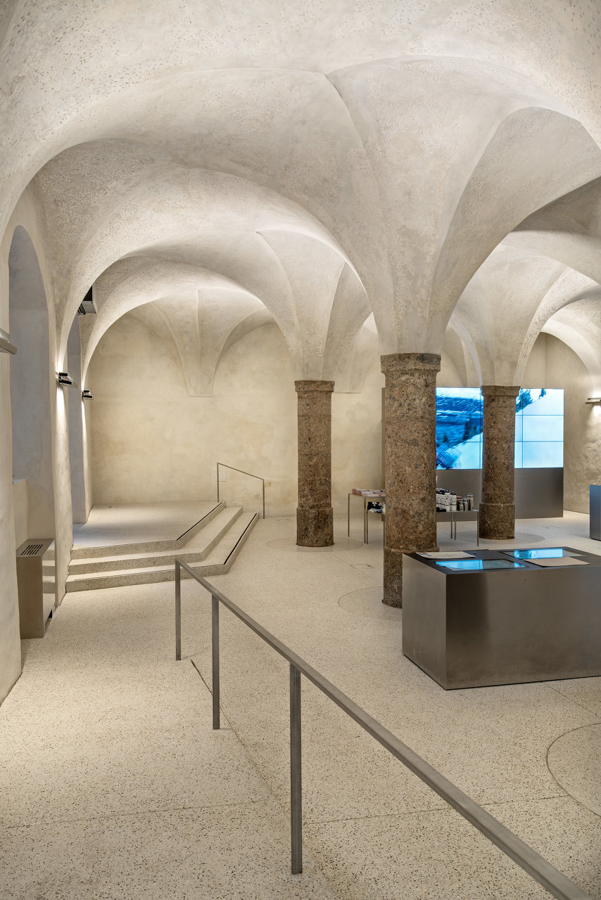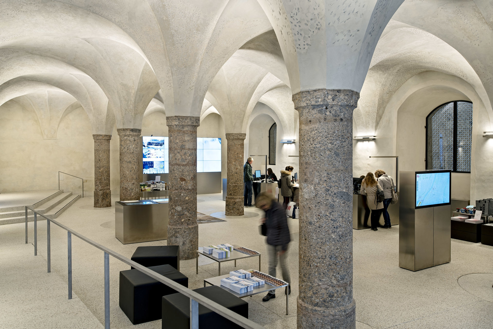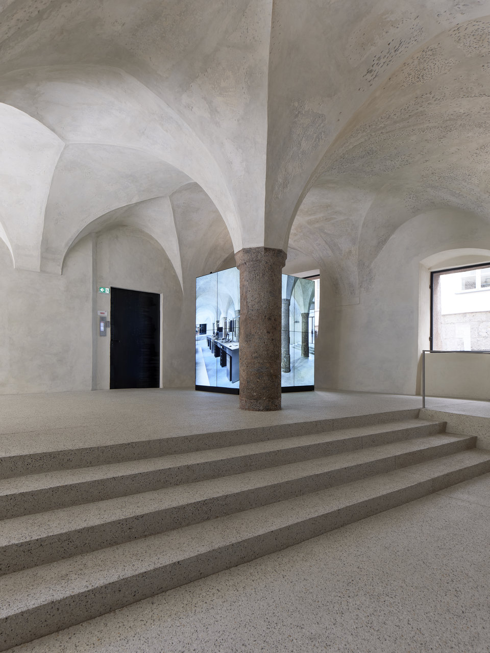 Der Innenraum wurde nicht nur renoviert, sondern von Grund auf neu gestaltet: Der Raum selbst mit seiner Geschichte sollte Informationsträger werden. Die Drei-Schiffigkeit der bestehenden Renaissance-Halle erzeugt eine spannungsarme Symmetrie, der es entgegenzuwirken galt. Eine diagonale Ausrichtung des Raumes stört nun die Symmetrie und bricht den strengen orthogonalen Säulenraster. So wird ein zusätzlicher Eingang diagonal vis-à-vis dem Haupteingang am Burggraben herausgebrochen. Wie eine Betonskulptur legen sich die neue barrierefreie Erschließung als Rampe und Sitzstufen asymmetrisch in den Raum. Wiederum diagonal gegenüber sind in den beiden Ecken Video-Walls platziert.