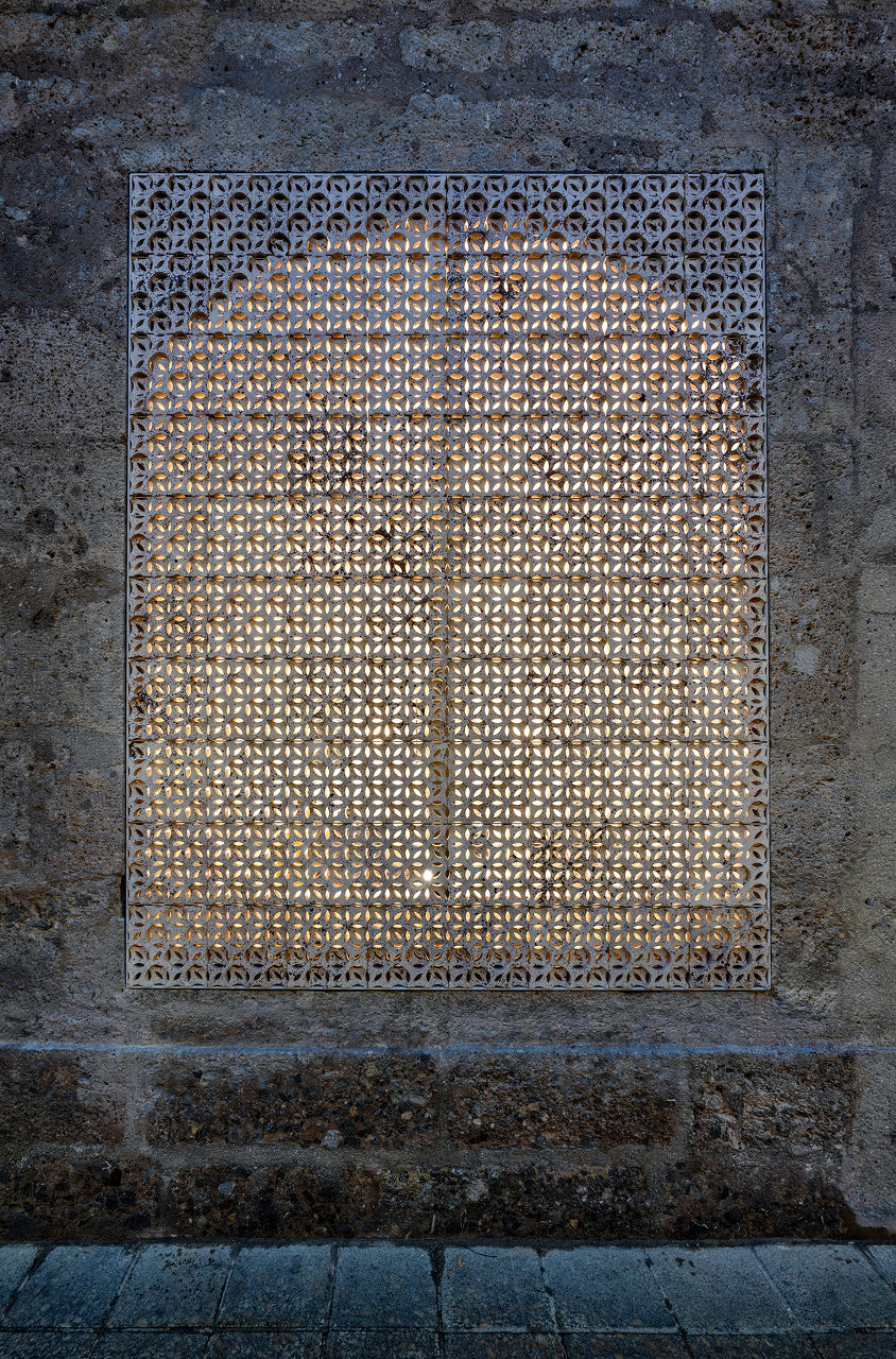 Ursprünglich gab es keine Fensteröffnungen zum Burggraben. Die großen Bogenfenster wurden erst in den 1920er-Jahren herausgebrochen und passten in dieser Form weder zum Gewölbe noch zur Fassade. Um den geschlossenen Charakter einer Stadtmauer wiederherzustellen, werden fassadenbündig perforierte Keramik-Arabesken eingesetzt, die tagsüber die Brekzienfassade schließen und nachts wie eine Laterne den Burggraben erhellen. Die dafür eingesetzte Fliesenserie wurde eigens entwickelt und von Hand gefertigt. Das geometrische Ornament ist das Resultat einer Wiederholung eines digitalen grafischen Musters. Das Prinzip des dreidimensionalen Musters auf zweidimensionaler Fläche ist Grundlage der bisherigen Rakufliesen der Vorarlberger Fliesenmanufaktur Karak. Bei diesem Projekt erobert ein Muster den Raum: TaOk lässt im Spiel der Dimensionen Fliesen zu freistehenden Objekten werden und spielt mit Licht, Standpunkt und Umgebung. Die Verbindung von archaischem Handwerk und zeitgenössischer Gestaltung schließt damit die „Wunden“ in der 1500 Jahre alten Stadtmauer. (Text: Architekt:innen, bearbeitet)